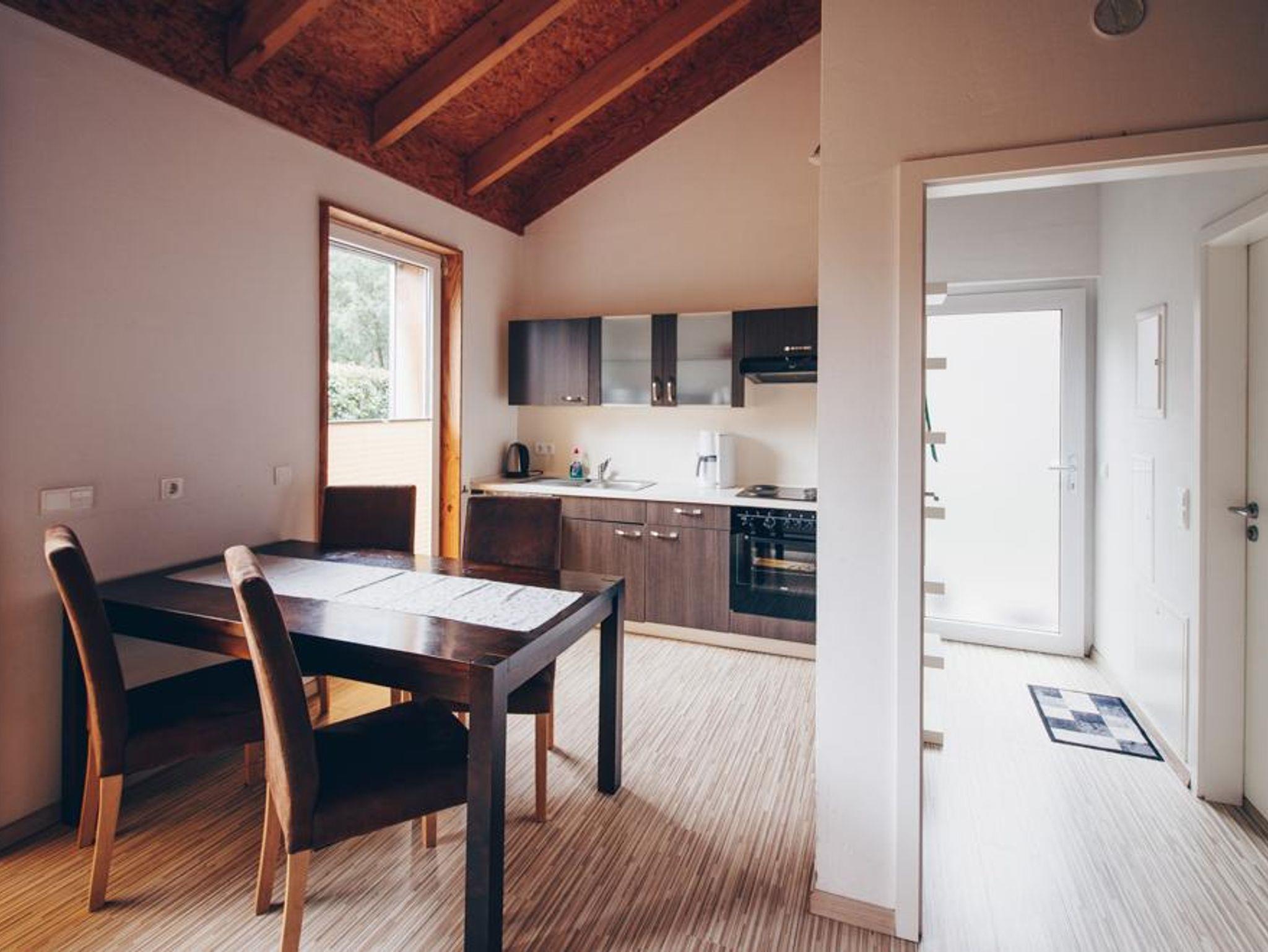 Das Ferienhaus 5 verfügt über ein Wohnzimmer, zwei Schlafzimmer, eine offenen Küche mit Essplatz sowie über ein Bad mit Dusche und WC. Das Wohnzimmer ist mit einem Ausziehsofa ausgestattet, auf welchem nötigenfalls noch zwei Personen schlafen können. Weiterhin befindet sich ein Kamin im Wohnzimmer sowie der Essplatz mit 4 Stühlen. Ein Schlafzimmer ist mit einem Doppelbett ausgestattet, das zweite Schlafzimmer verfügt über zwei Einzelbetten. Die Küche ist mit sämtlichen Küchengeräten ausgestattet. Der PKW kann direkt am Haus geparkt werden.