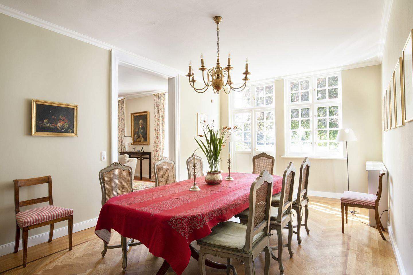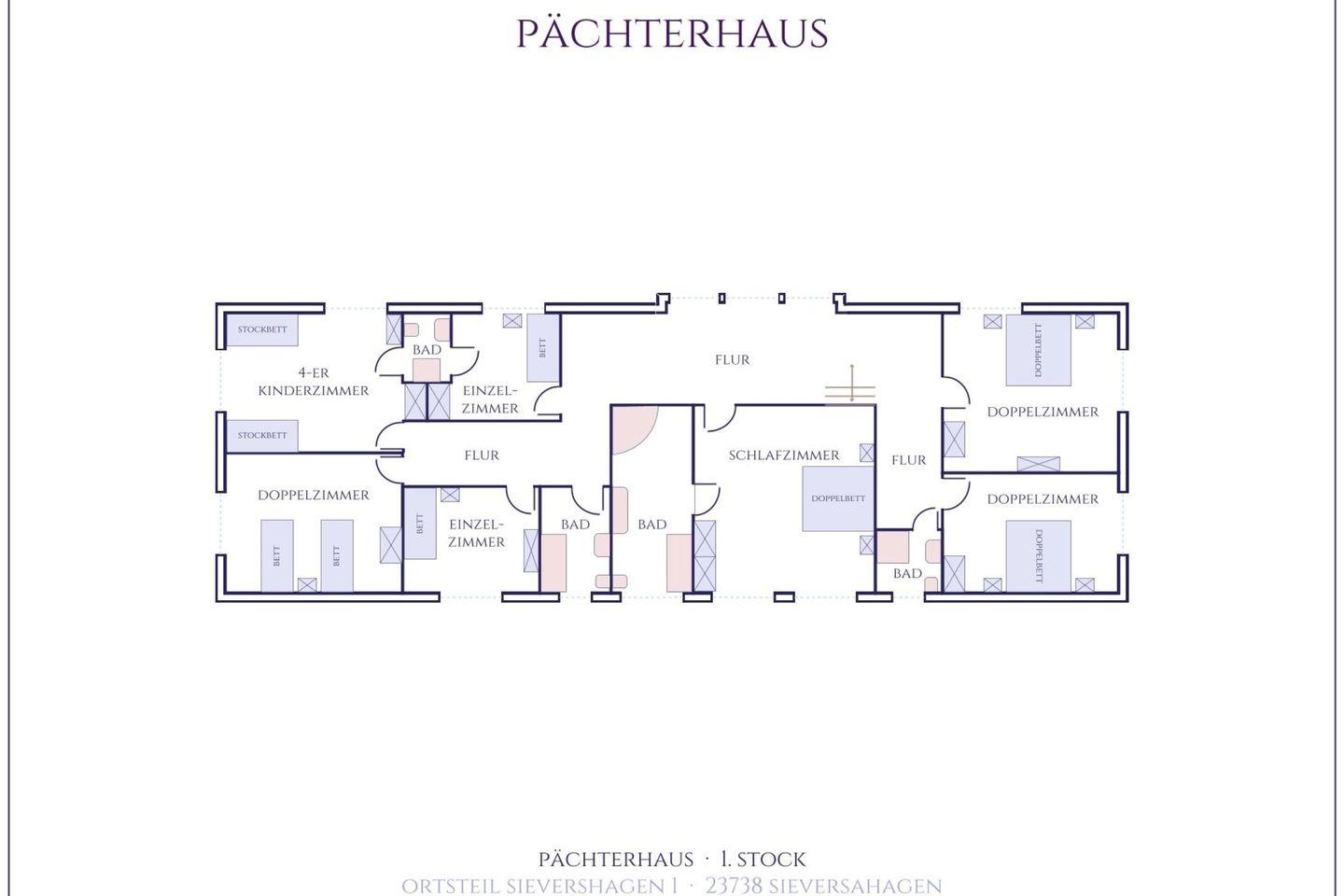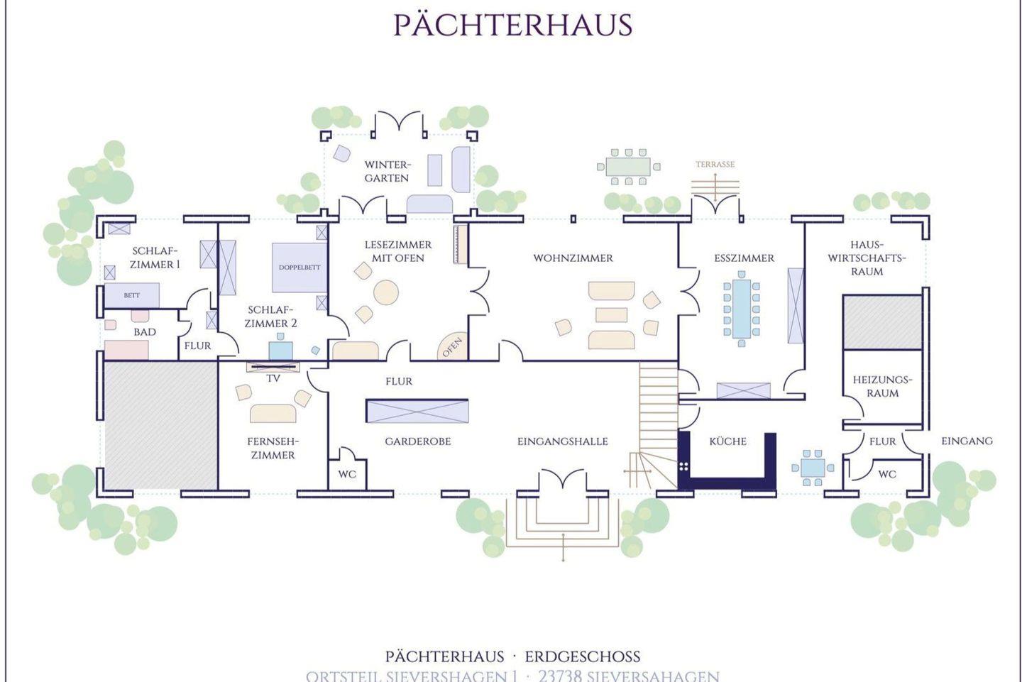 Idyllisch liegt das so genannte Pächterhaus in absoluter Alleinlage am Rande der Holsteinischen Schweiz. Hinter dem bescheidenen Namen verbirgt sich ein kleines, wunderschönes Gutshaus der Herzöge von Oldenburg aus dem frühen 19. Jahrhundert mit 9 Schlafzimmern und 5 Badezimmern, einem großzügigen Wohnbereich bestehend aus Wohnzimmer, Salon, einem Esszimmer und Wintergarten sowie einer bestens ausgestatteten Küche. Die Inneneinrichtung versetzt den Gast sofort in andere Zeiten. Antiquitäten, Ölgemälde und die historische Bausubstanz kombiniert mit modernem Wohnkomfort sorgen für eine einzigartige Atmosphäre.