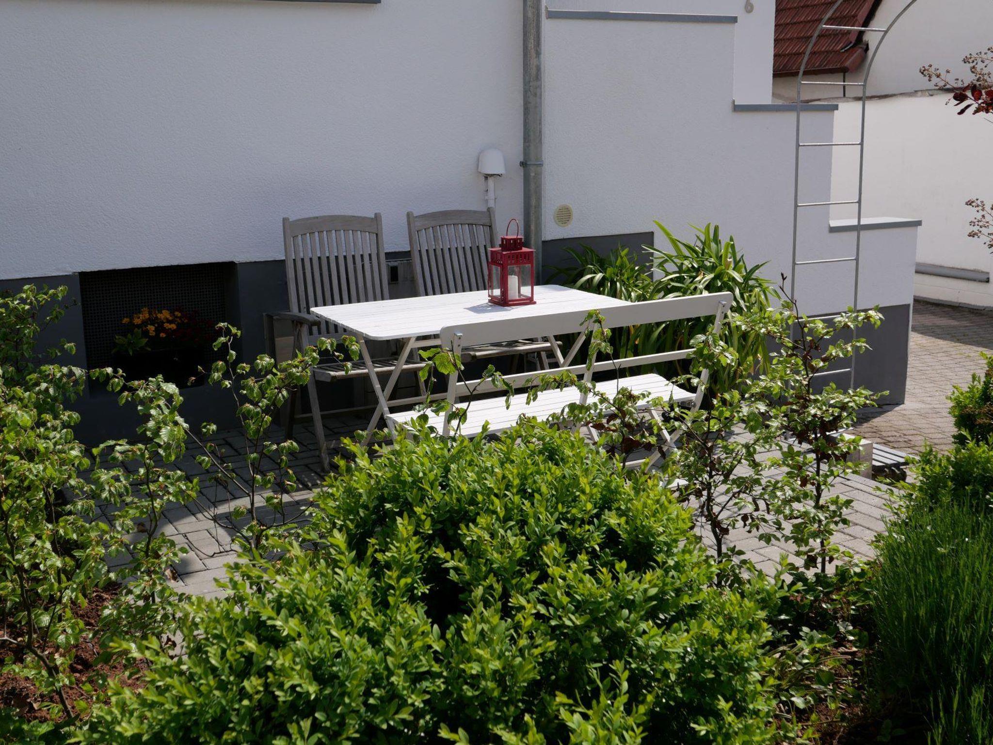 Im Vorgarten haben wir einen Freisitz mit Gartenmöbeln für unsere Gäste eingerichtet.