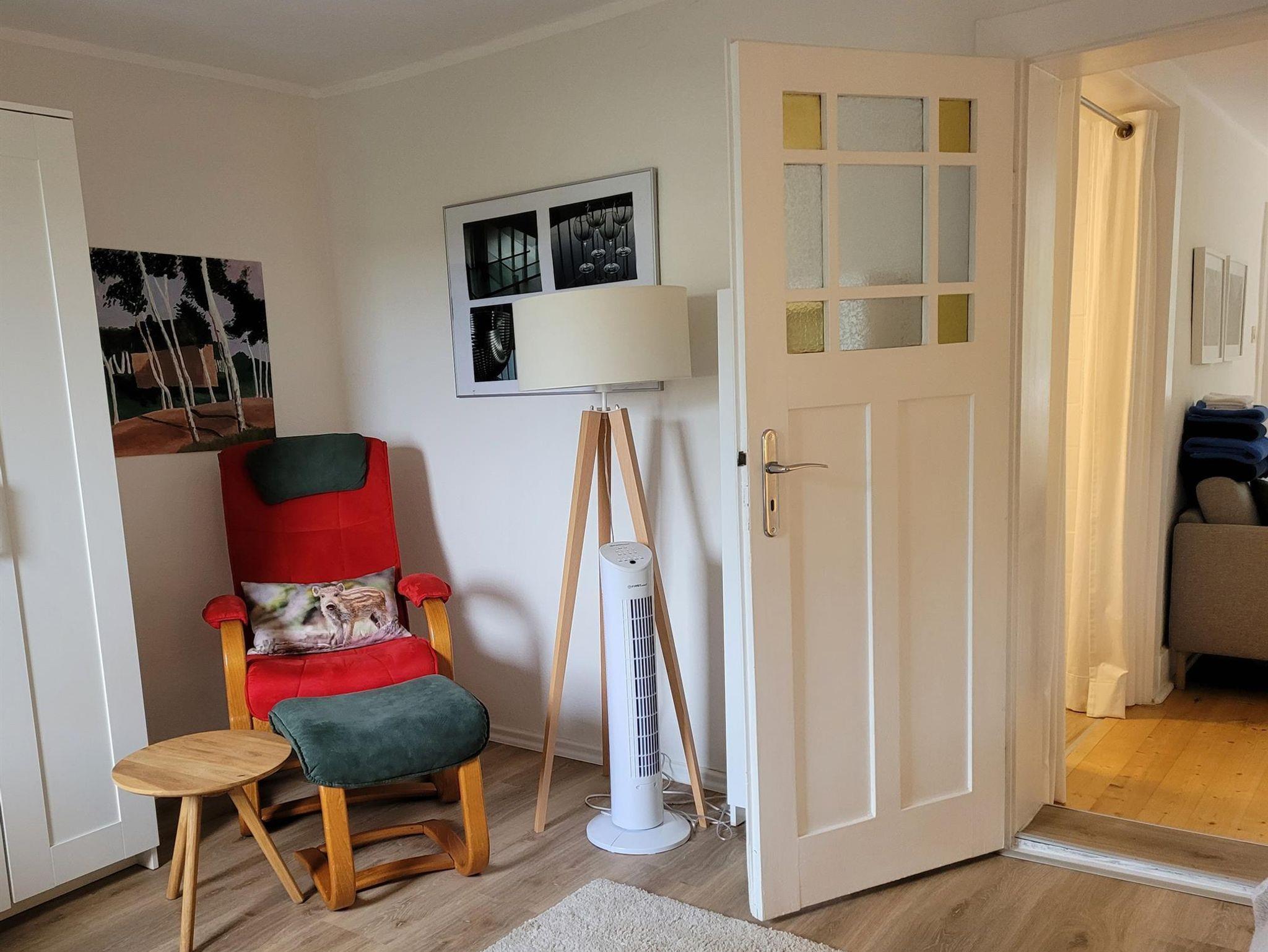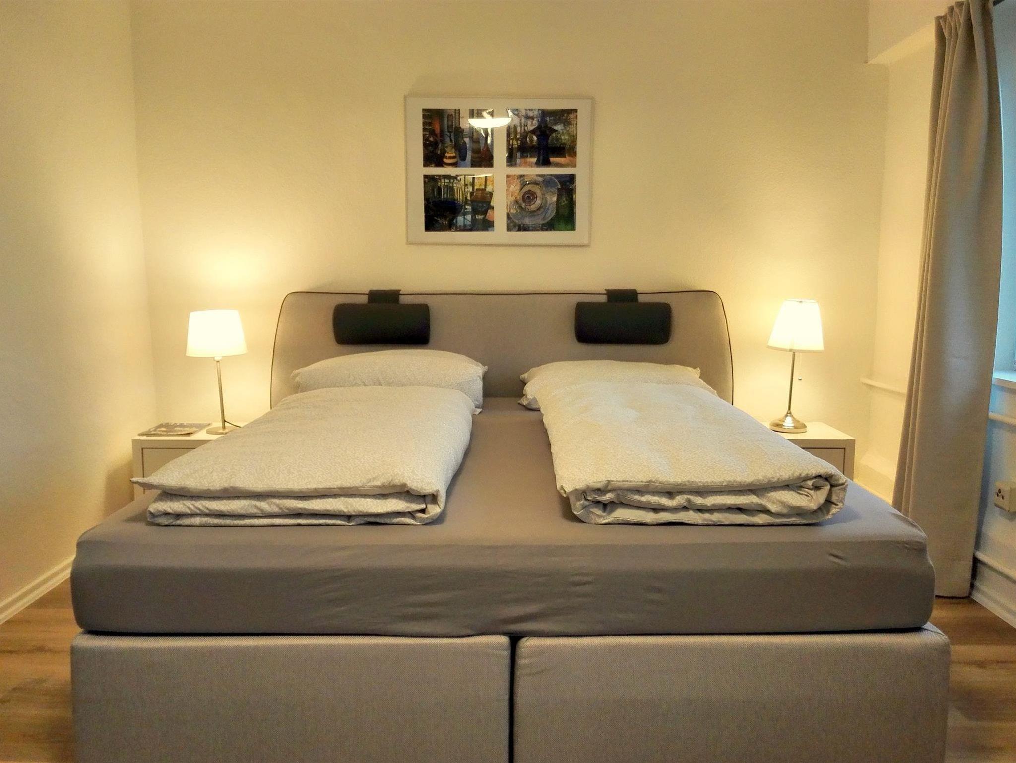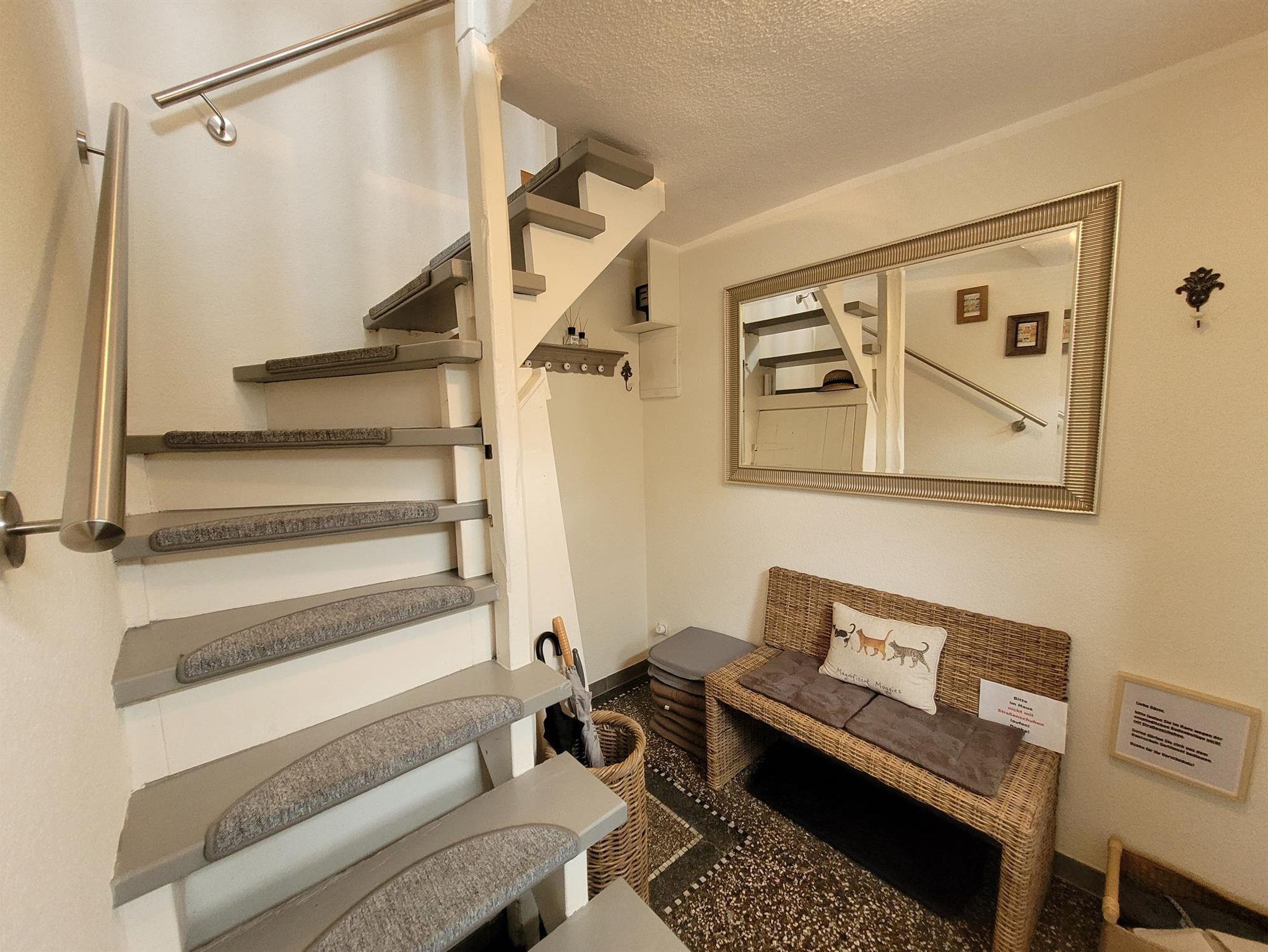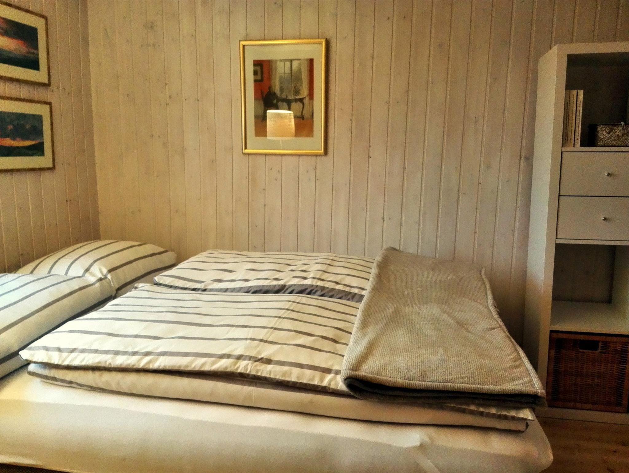 Im unteren Geschoss: Wohn-/Arbeitsraum + getrenntes Schlafzimmer mit Boxspring-Doppelbett (180 X 200 cm), Kleiderschrank und Liegesessel; großes Bad mit Toilette, Waschtisch mit Schubladen, Haartrockner, Spiegelschrank, Regal und kombinierte Badewanne/Duschecke mit Glaswand; kleiner Wirtschaftsraum mit Waschmaschine, Trockner, Staubsauger, Bügeleisen und –brett, Reinigungsmaterial.