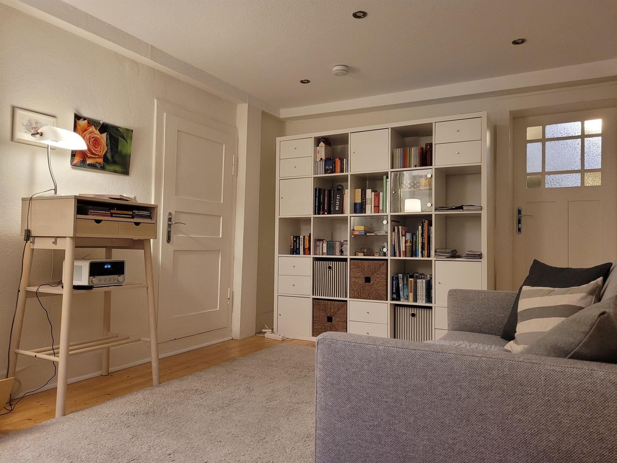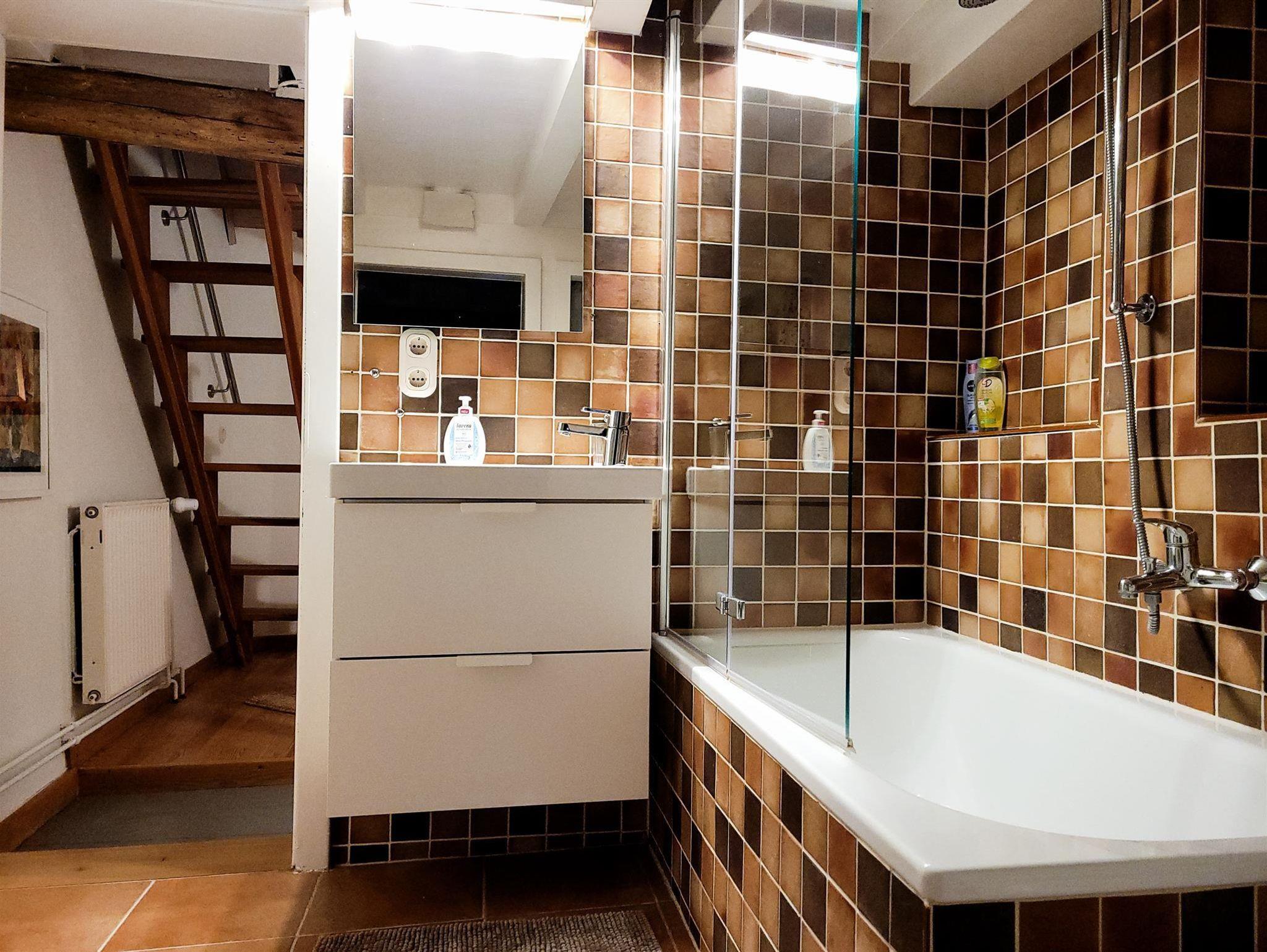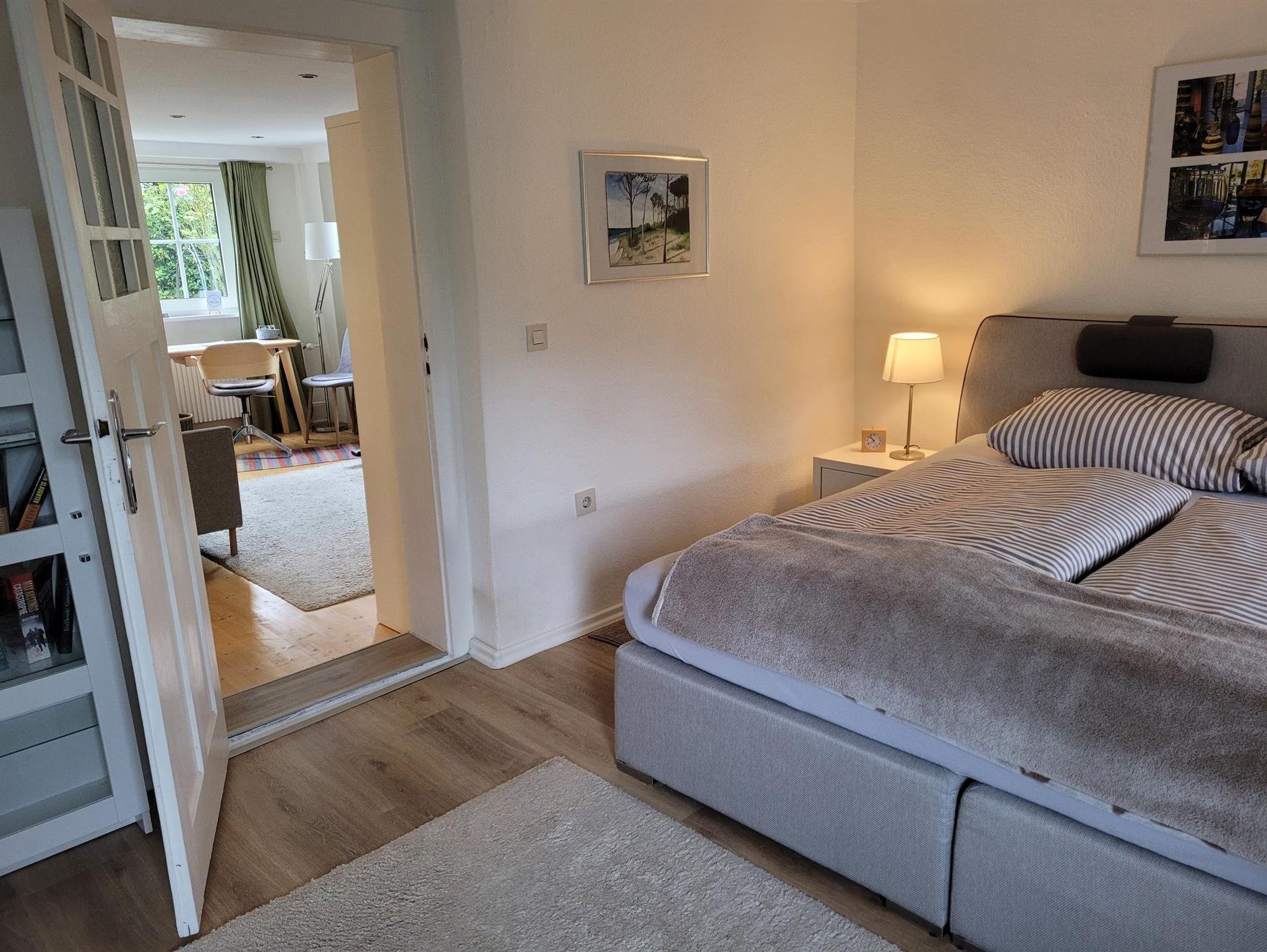Im unteren Geschoss: Wohn-/Arbeitsraum + getrenntes Schlafzimmer mit Boxspring-Doppelbett (180 X 200 cm), Kleiderschrank und Liegesessel; großes Bad mit Toilette, Waschtisch mit Schubladen, Haartrockner, Spiegelschrank, Regal und kombinierte Badewanne/Duschecke mit Glaswand; kleiner Wirtschaftsraum mit Waschmaschine, Trockner, Staubsauger, Bügeleisen und –brett, Reinigungsmaterial.