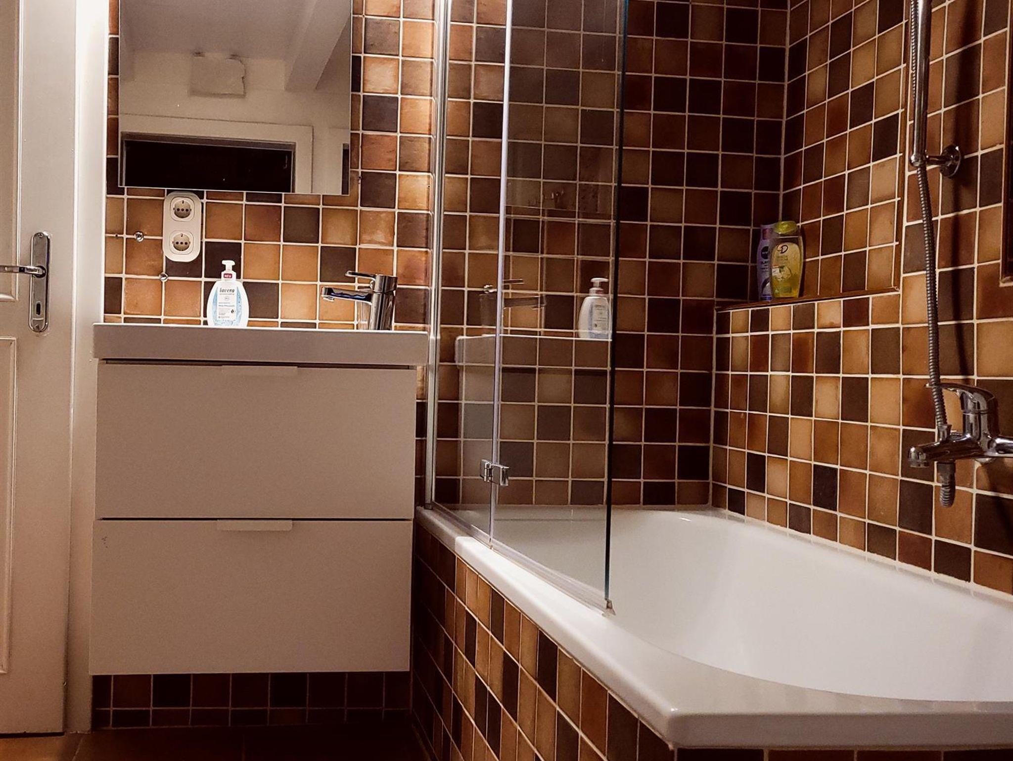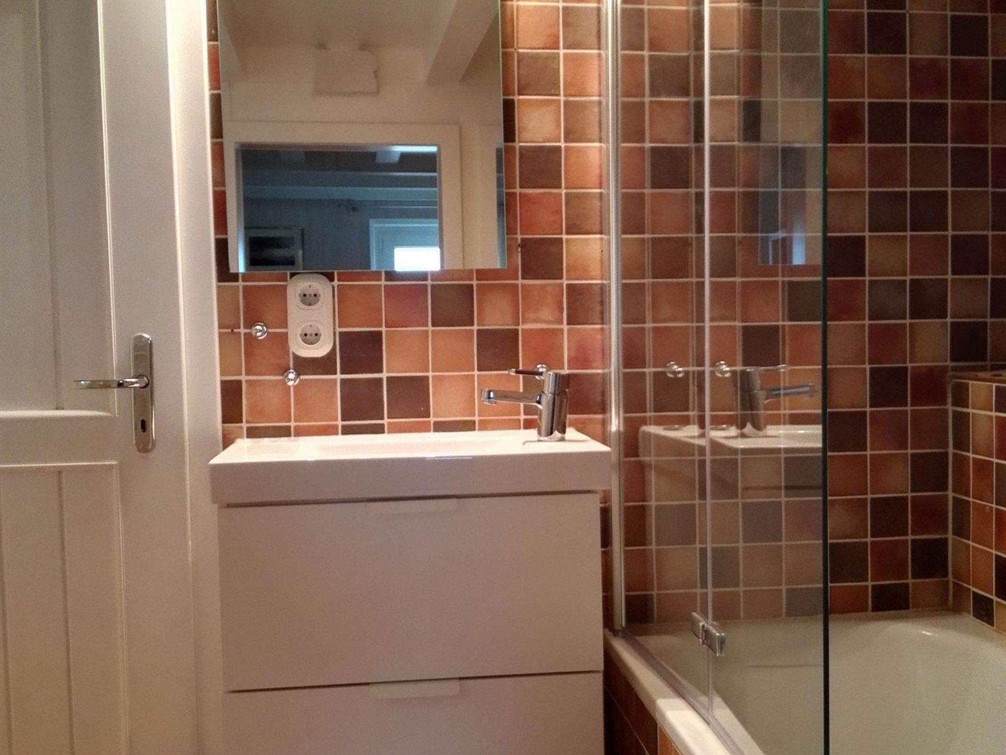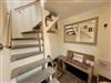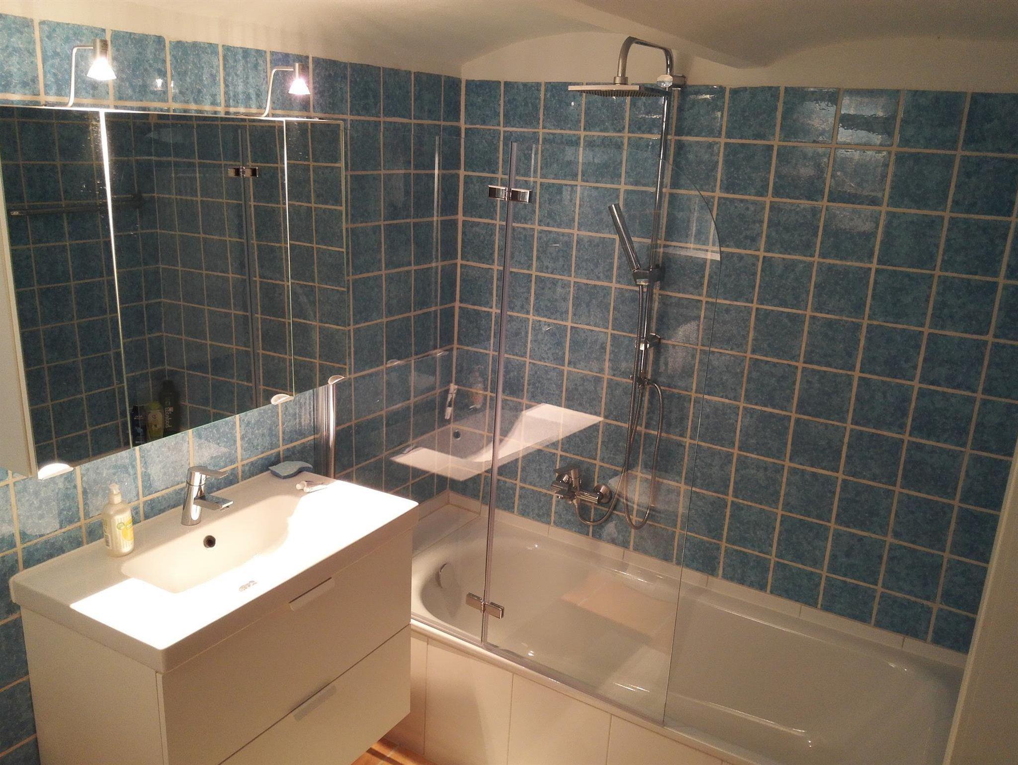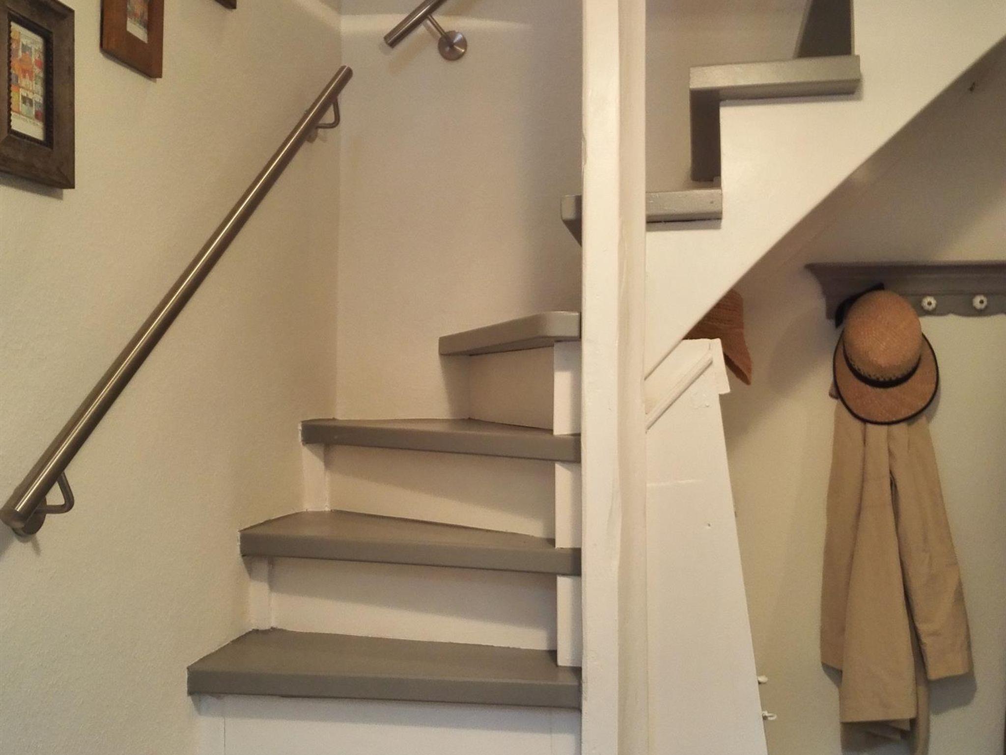 Im unteren Geschoss: Wohn-/Arbeitsraum + getrenntes Schlafzimmer mit Boxspring-Doppelbett (180 X 200 cm), Kleiderschrank und Liegesessel; großes Bad mit Toilette, Waschtisch mit Schubladen, Haartrockner, Spiegelschrank, Regal und kombinierte Badewanne/Duschecke mit Glaswand; kleiner Wirtschaftsraum mit Waschmaschine, Trockner, Staubsauger, Bügeleisen und –brett, Reinigungsmaterial.
