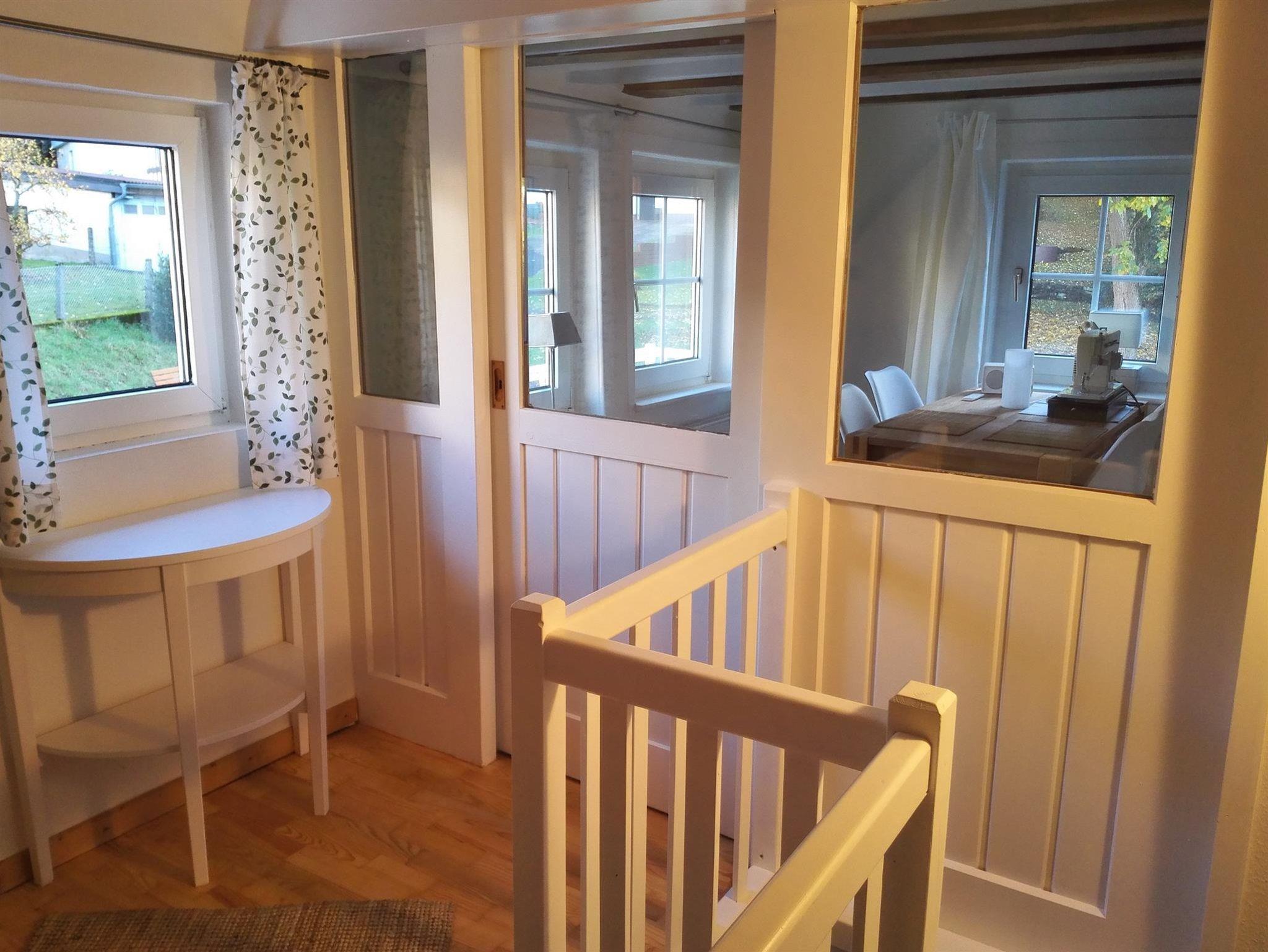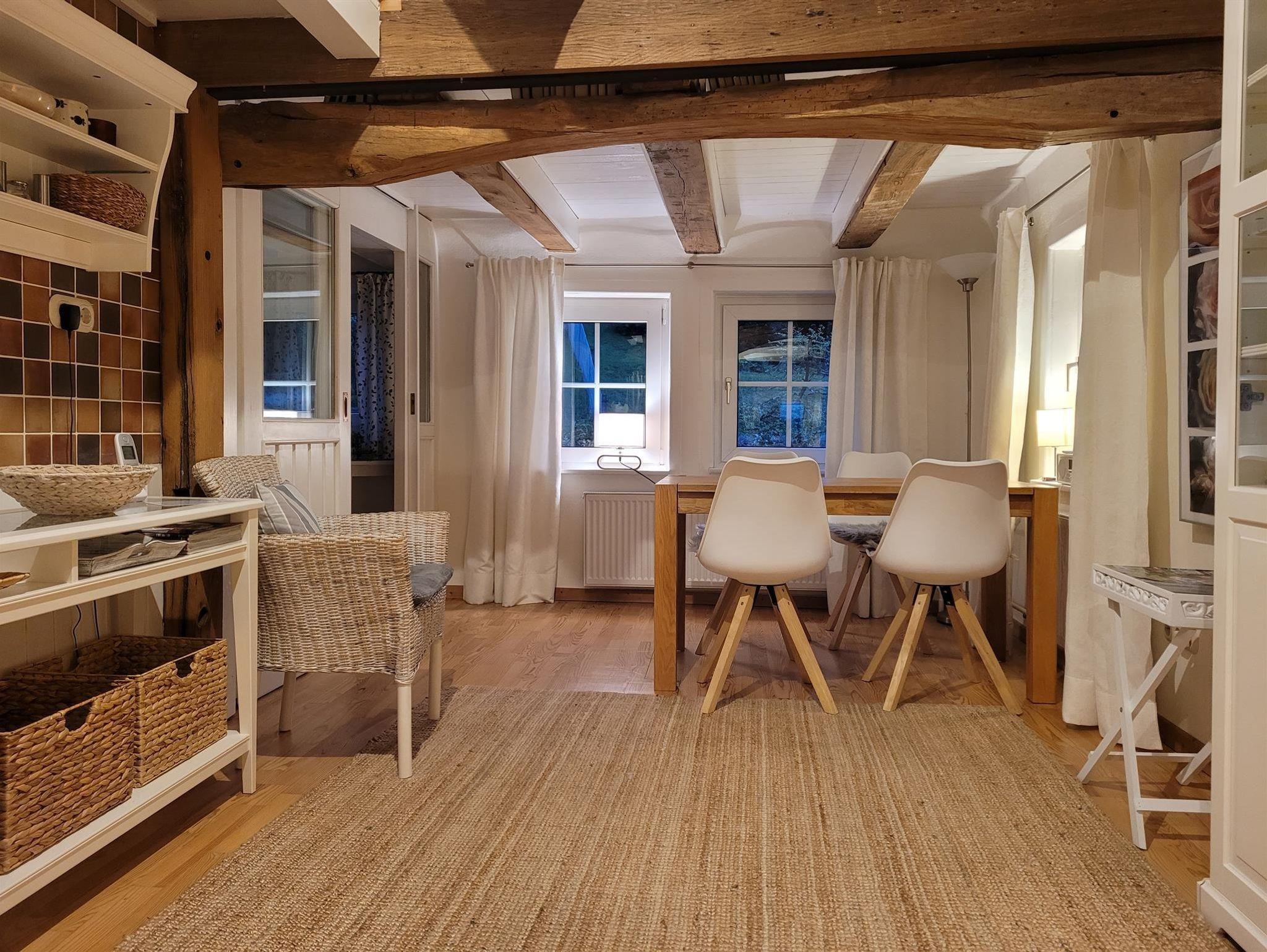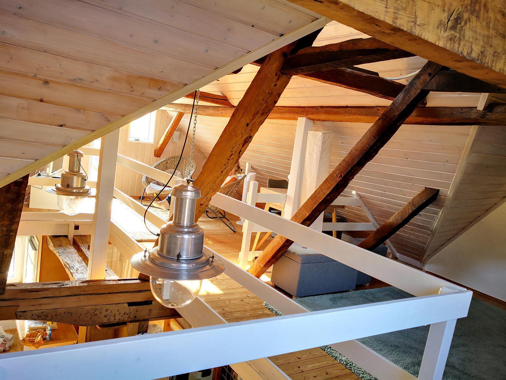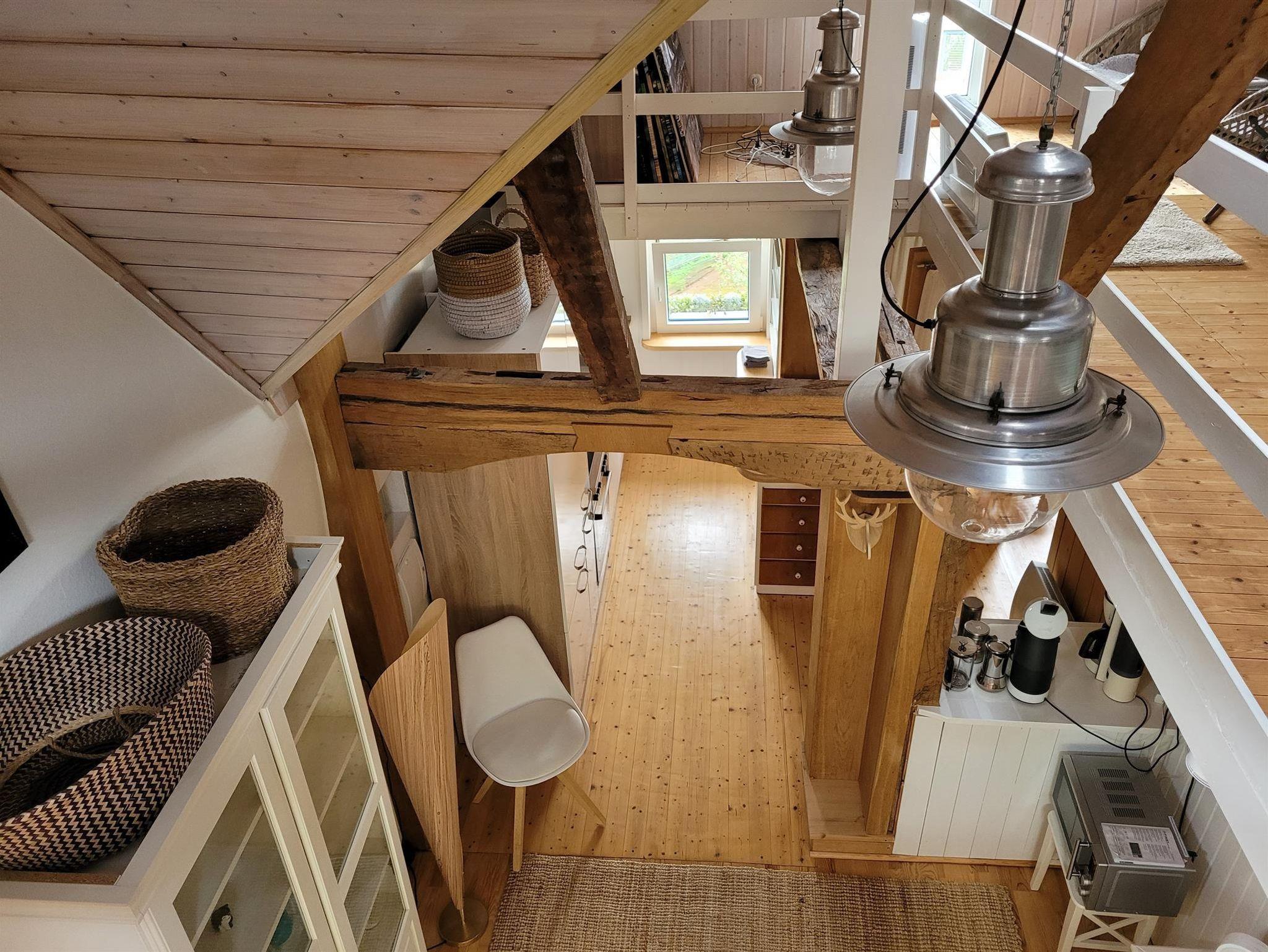Viel Holz in Gebälk, Vertäfelung und Fußböden verbreitet Gemütlichkeit und Behaglichkeit.