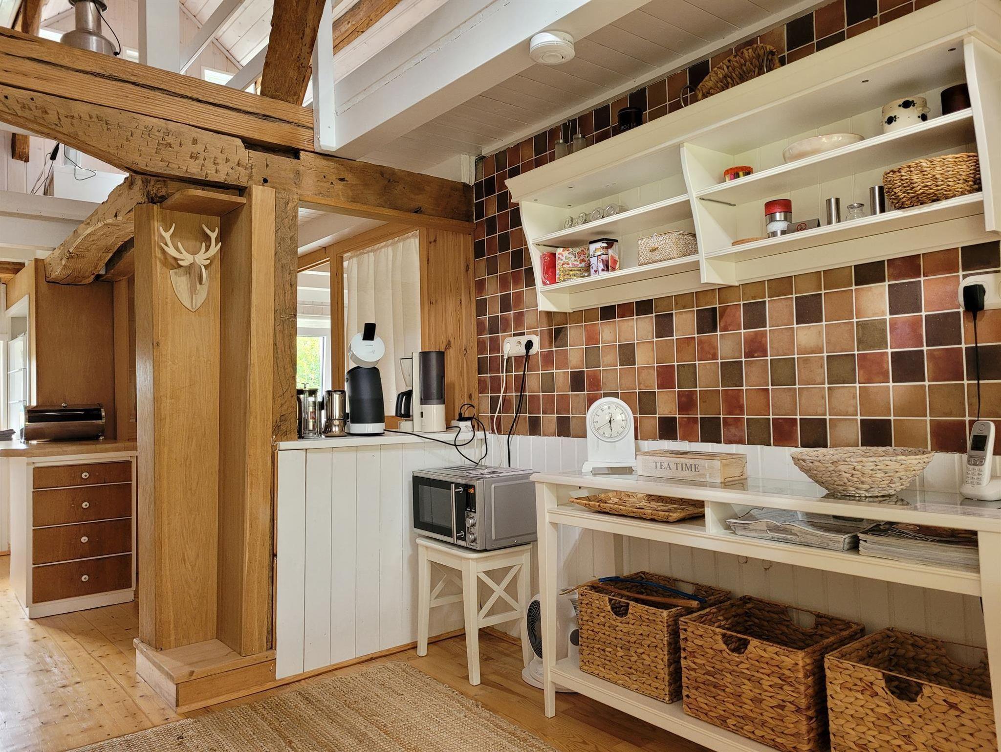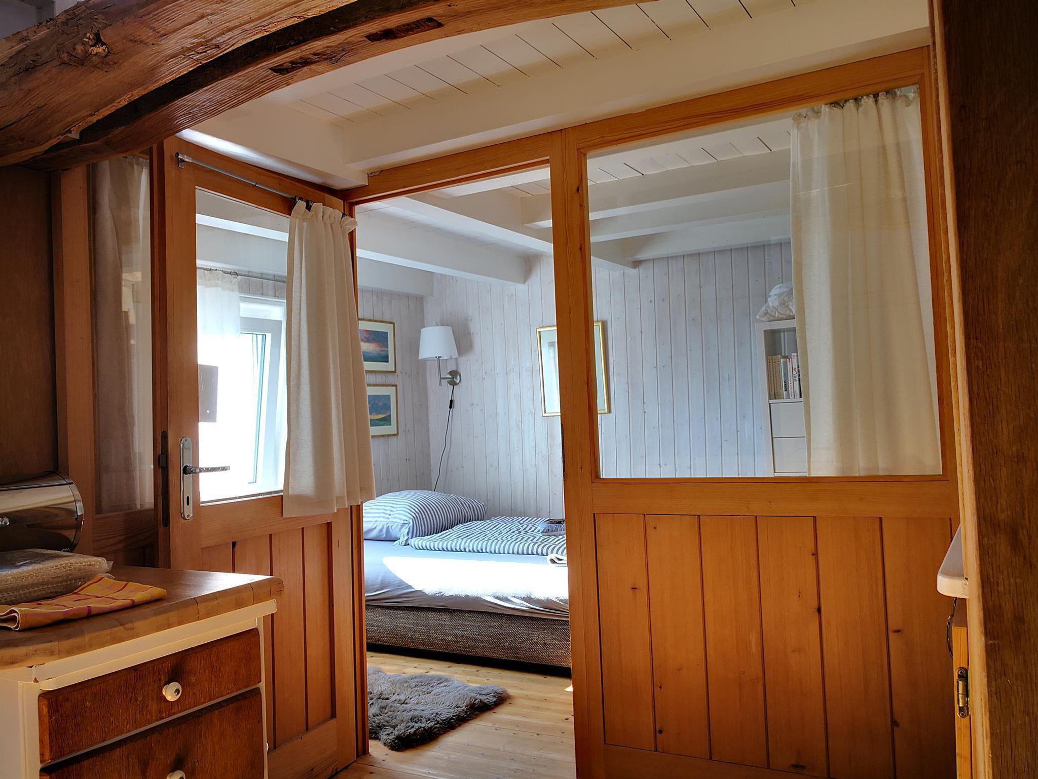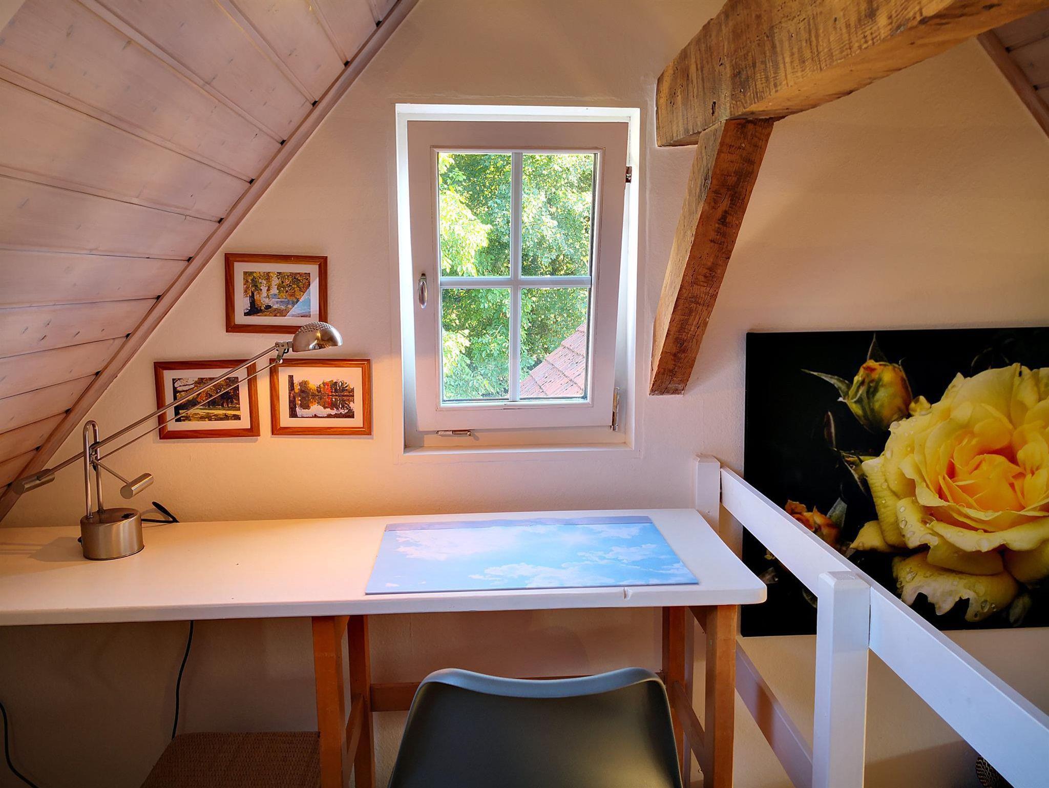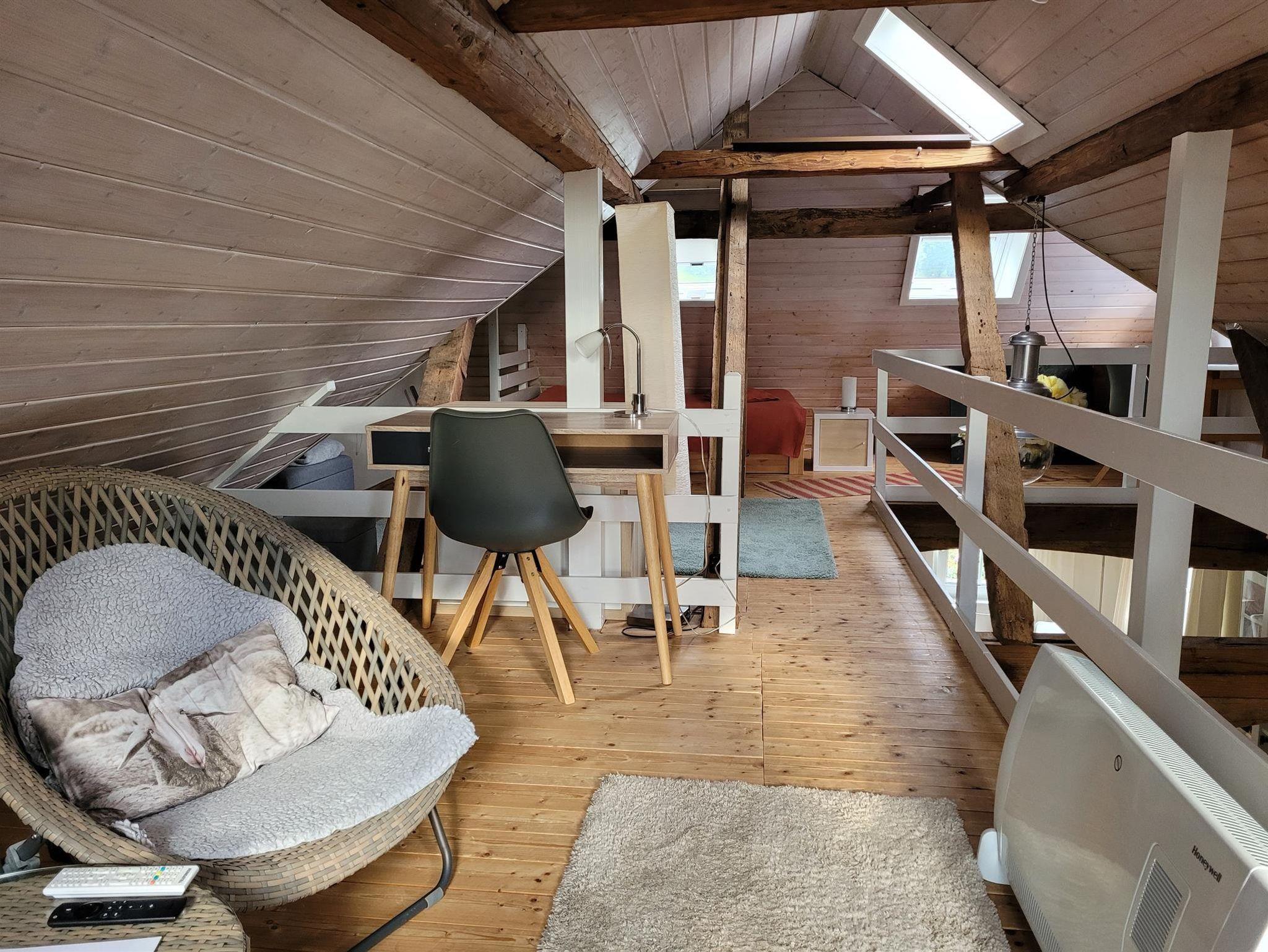 Viel Holz in Gebälk, Vertäfelung und Fußböden verbreitet Gemütlichkeit und Behaglichkeit.