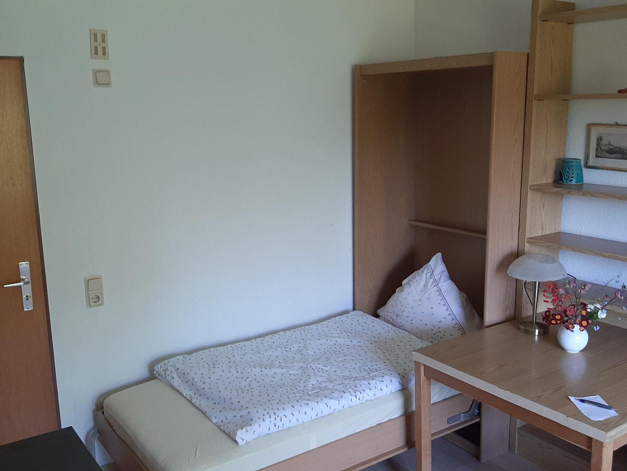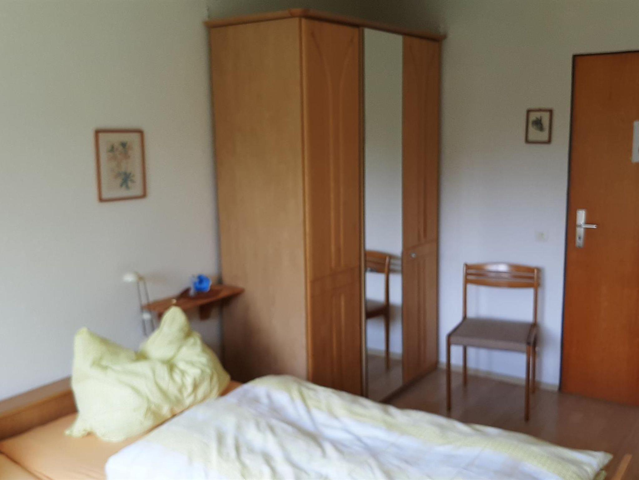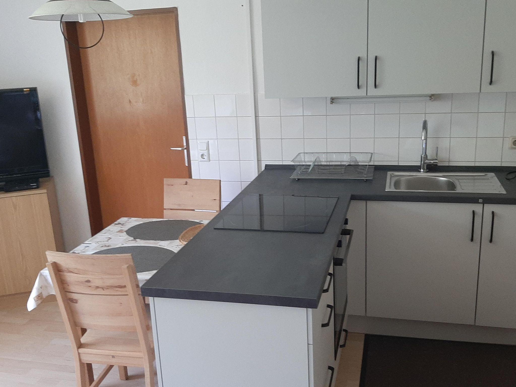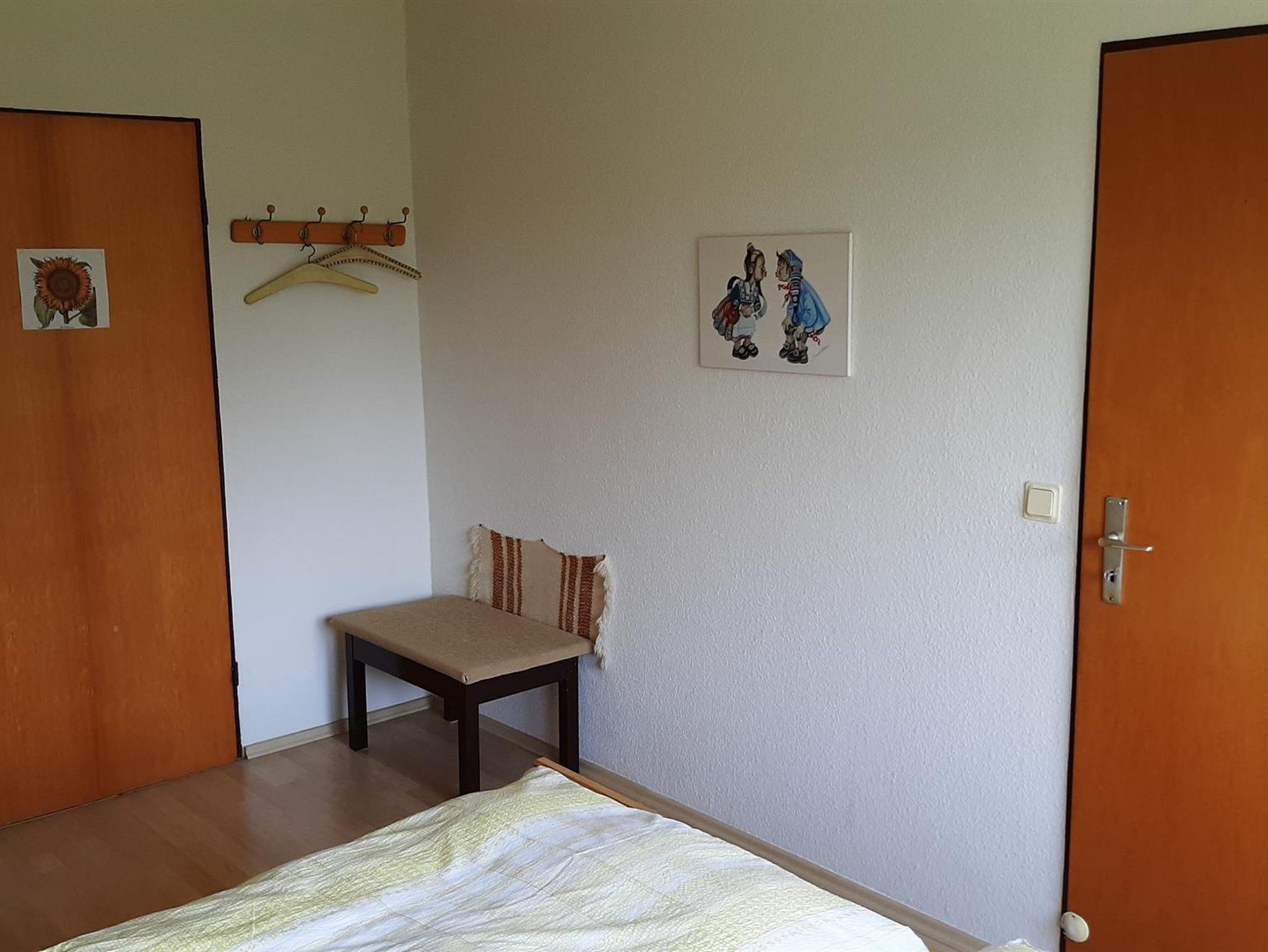 Die Ferienwohnung bietet auf 42 Quadratmetern Platz für bis zu 3 Personen. Ideal geeignet für zwei Personen mit einen Doppeltbett im Schlafzimmer mit Schrank, Kofferablage und schönen Ausblick in den Garten. Die Wohnküche bietet eine Küchenzeile mit vier Kochplatten und einem Backofen, Kühlschrank, Kaffeemaschine und Wasserkocher sowie einem Frühstückstisch. Die Küche wurde im April 2025 erneuert. Ein zweier Sofa lädt zum verweilen und zum Fernsehen mit verschiedenen nationalen und internationalen Programmen über Satellit ein. Ein Schreibtisch und ein ausklappbares Schrankbett für die Übernachtung einer 3. Person erweitern den Service. Ein Bad mit Dusche, WC und Fenster sowie Handtüchern und Bettwäsche stehen zur Verfügung. Im Garten können Sie den Waldblick genießen. Gegen Aufpreis und nach Absprache können Sie gerne auch die in 2021 erstellte Gartensauna zur individuellen Nutzung buchen.