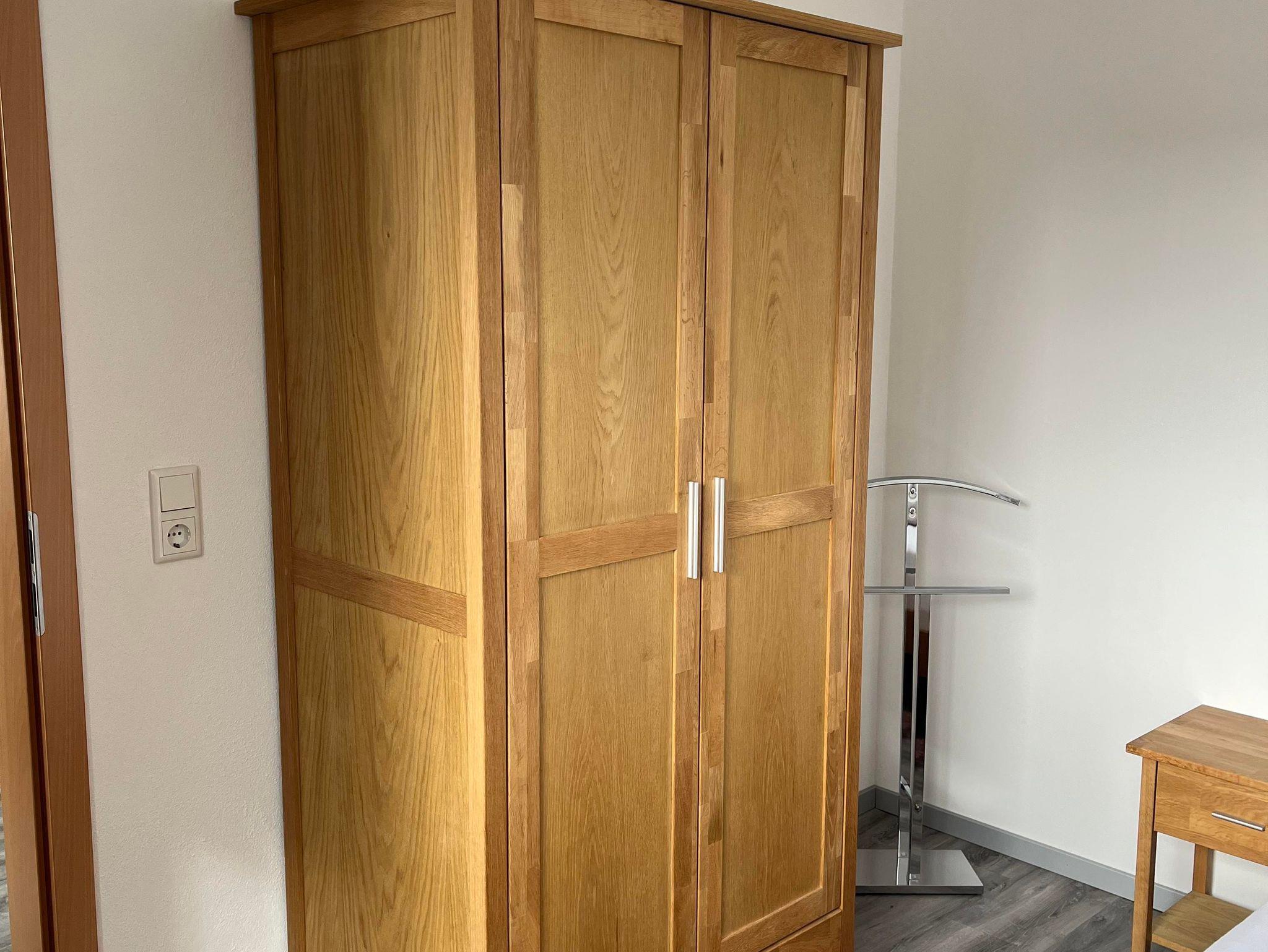 Es gibt ein Schlafzimmer mit einem Doppelbett (160/200) und einem Kleiderschrank.