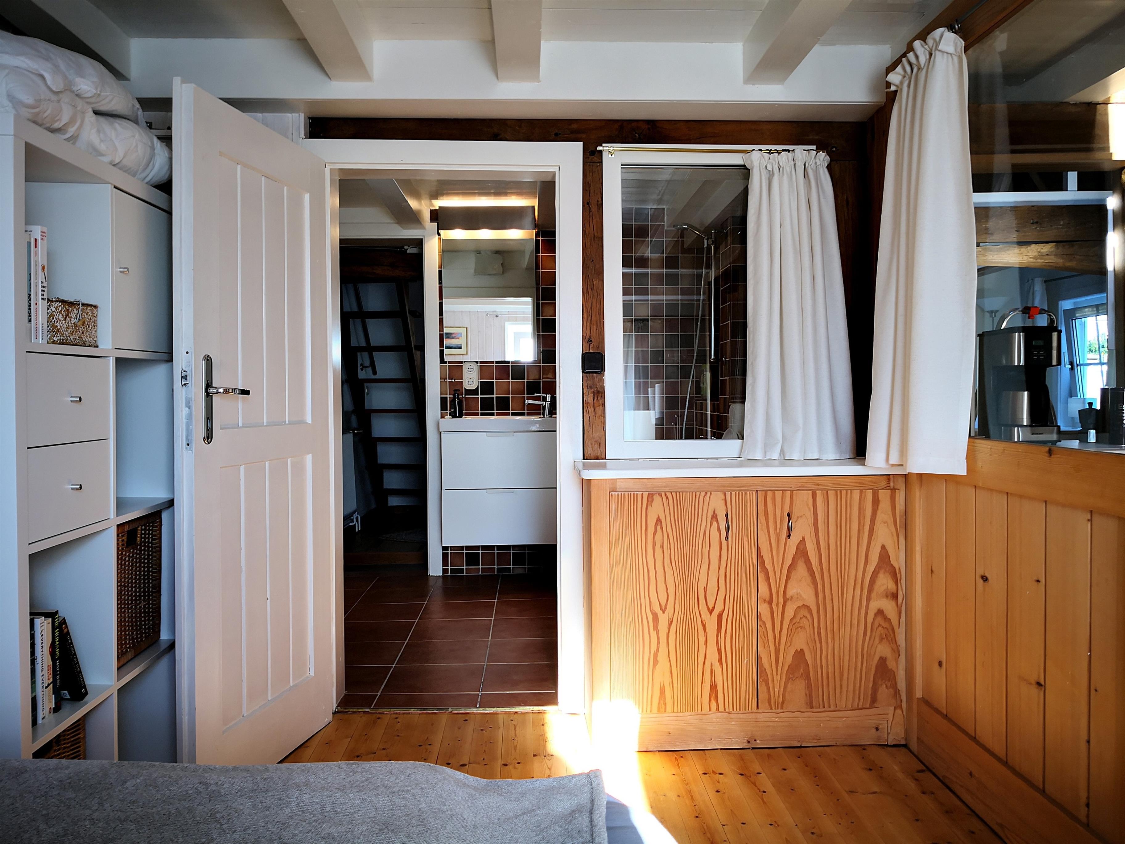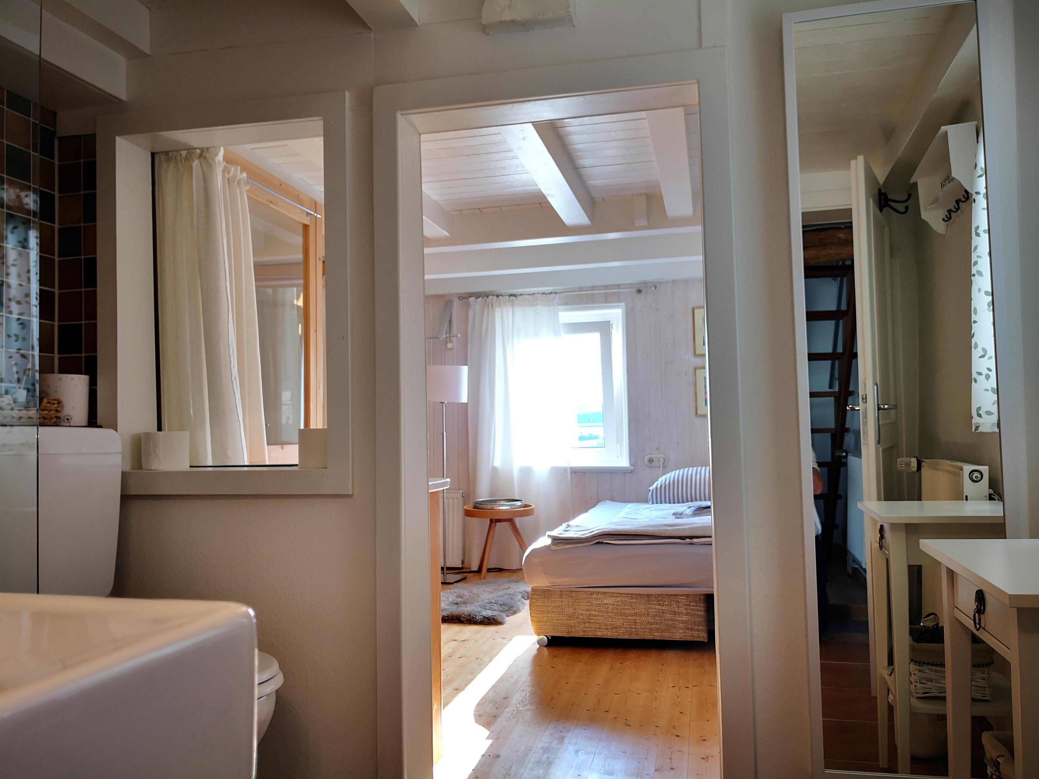 An den Essbereich grenzt ein kleiner Wohn-/Schlafraum mit Doppelbett (1,50 X 2,00 Meter), Beistelltisch und Bücherregal an. Sowohl von dort aus als auch vom Vorflur zugänglich ist ein kleines Bad mit Toilette, Waschtisch (mit Schubladen), Haartrockner, kombinierter Wanne/Duschecke mit Glaswand.
