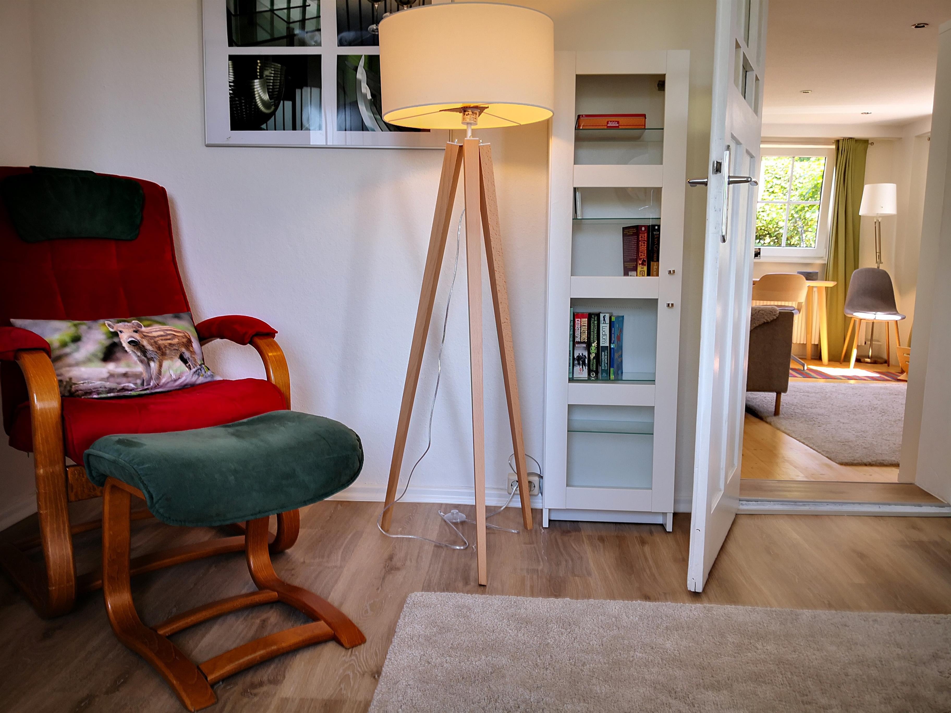 Im unteren Geschoss: Eingangsflur; Wohn-/Arbeitsraum mit Couch, Sitzgelegenheiten, CD-Player,Internetradio, Schreibtisch, Stehpult und Schrankwand; Schlafzimmer mit Boxspring-Doppelbett (180 X 200 cm), großer Kleiderschrank und Liegesessel mit Beistelltischchen und Stehlampe; großes Bad mit Toilette, Waschtisch mit Schubladen, Haartrockner, Spiegelschrank, Regal und kombinierte Badewanne/Duschecke mit Glaswand; kleiner Wirtschaftsraum mit Waschmaschine, Wäschetrockner, Staubsauger, Bügeleisen und –brett, smaterial.
