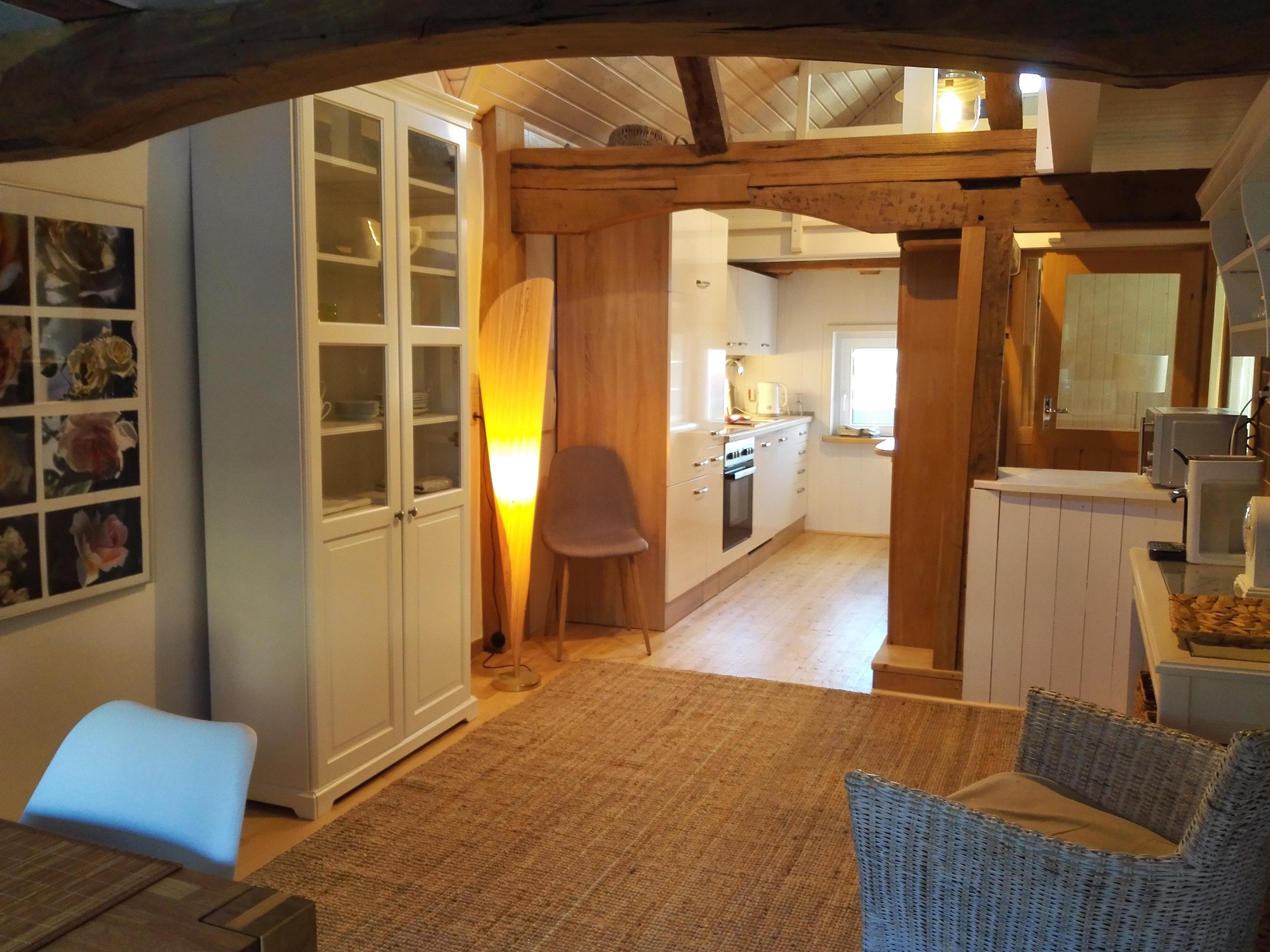 Im oberen Geschoss: kleiner Vorflur; großer Raum mit Essbereich im vorderen und Küche im hinteren Teil. Essbereich: Esstisch mit insgesamt 6 vorhandenen Stühlen und einem Korbsessel, Vitrine, Sideboard und Hängeboard, Internetradio. Die Einbauküche ist mit Kühlschrank (mit Gefrierfach), Koch- und Backherd, Ablufthaube, Kaffee-Padmaschine, zusätzliche Filter-Kaffeemaschine, Mikrowelle, Toaster, Wasserkocher, Eierkocher, Mixer, Spüle und Spülmaschine ausgestattet. Koch- und Essgeschirr sowie Küchengeräte sind zahlreich vorhanden, incl. Tee-, Kaffee- und Espressobereiter. (Vor Ankunft der Gäste wird für eine „Erstausstattung“ an Kaffee, Tee und Mineralwasser gesorgt.)