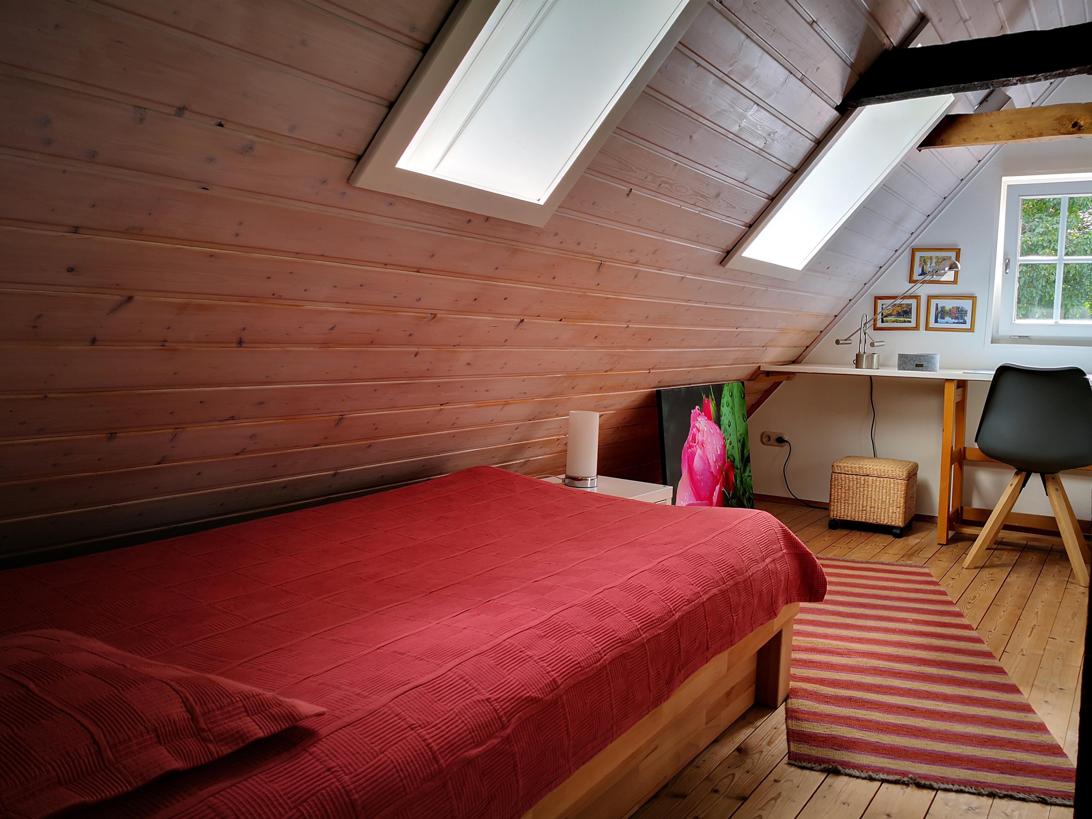 Viel Holz in Gebälk, Vertäfelung und Fußböden verbreitet Gemütlichkeit und Behaglichkeit.