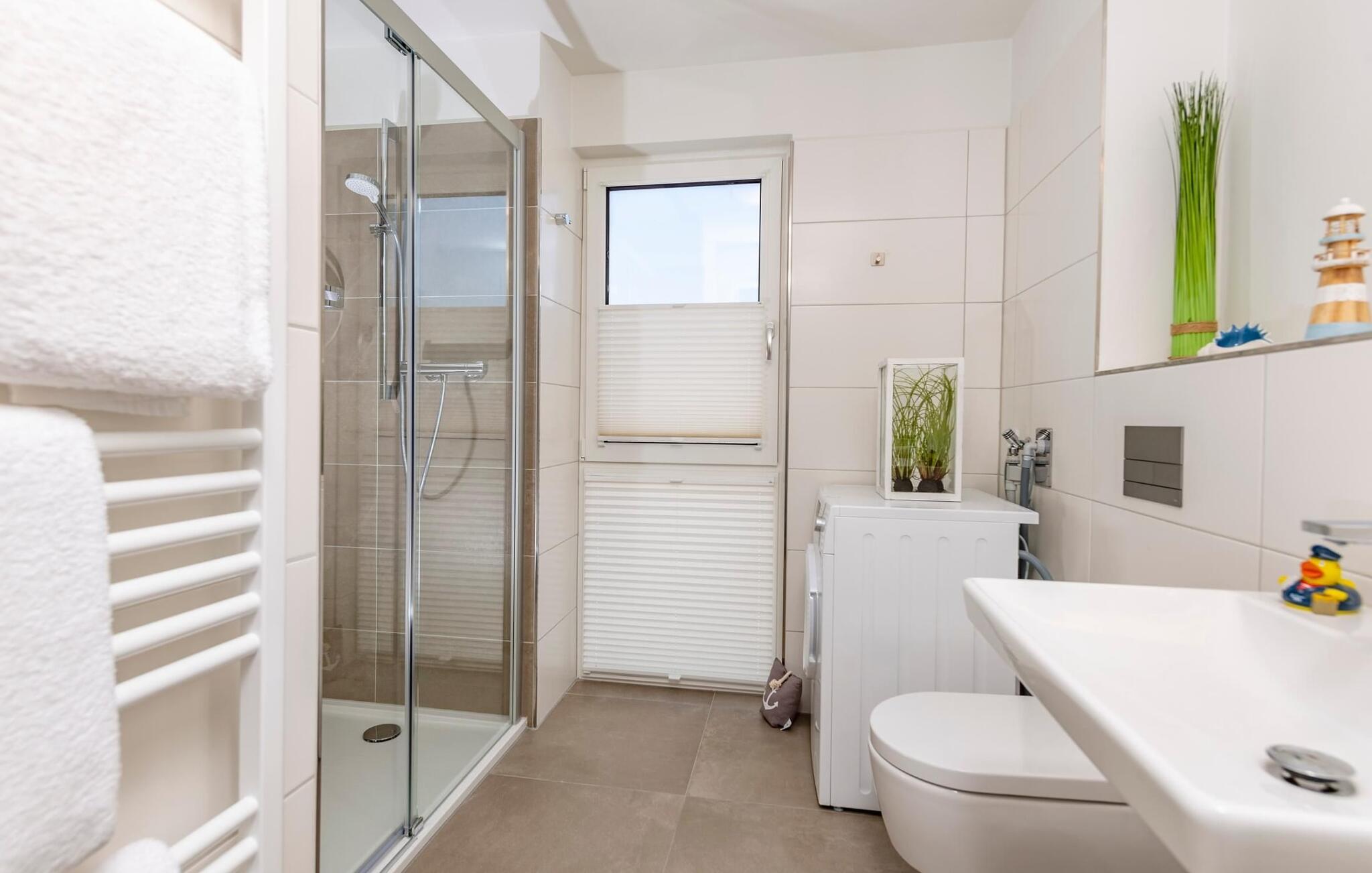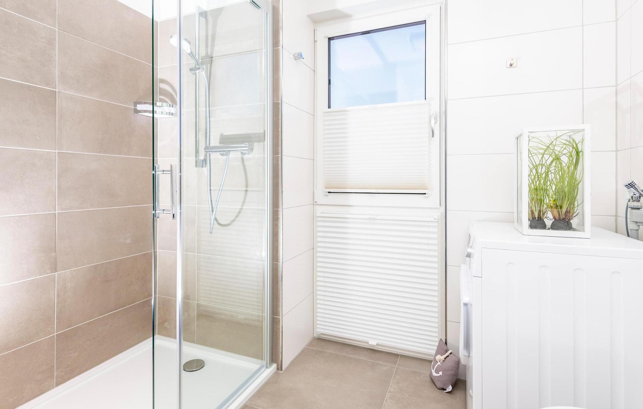 Bruserummet har et stort brusebad på gulvniveau. Lejlighedens hjørneplacering byder også på bekvemmeligheden af ??et udvendigt vindue i dette værelse.