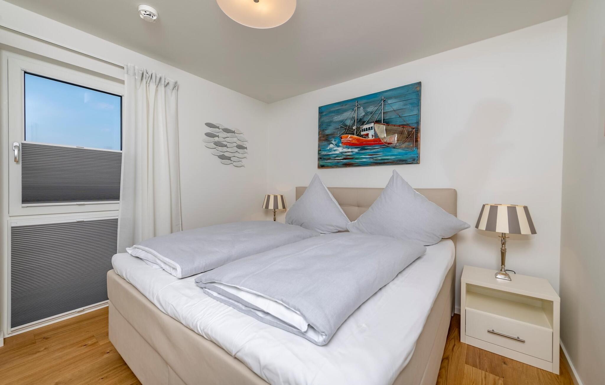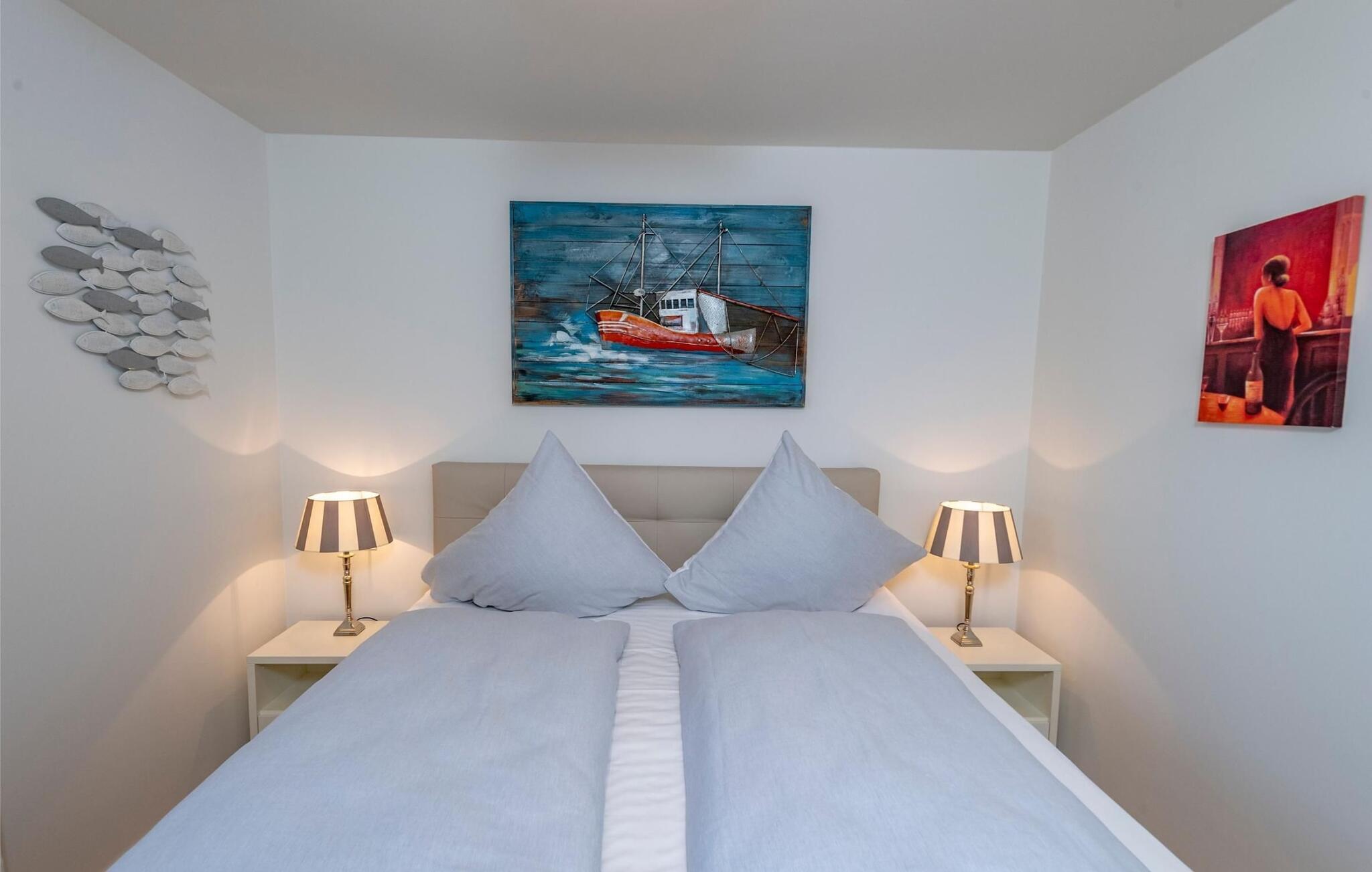 Det hyggelige soveværelse, udstyret med en dobbeltseng og et ekstra fladskærms-tv, tilbyder en afslappende feriesøvn. Fantastiske solnedgange kan ses gennem vinduet.