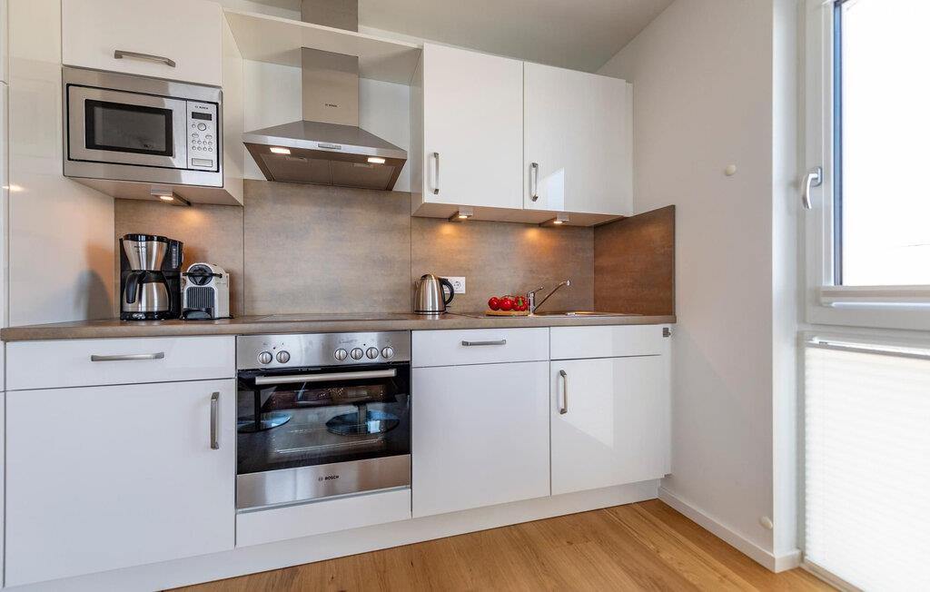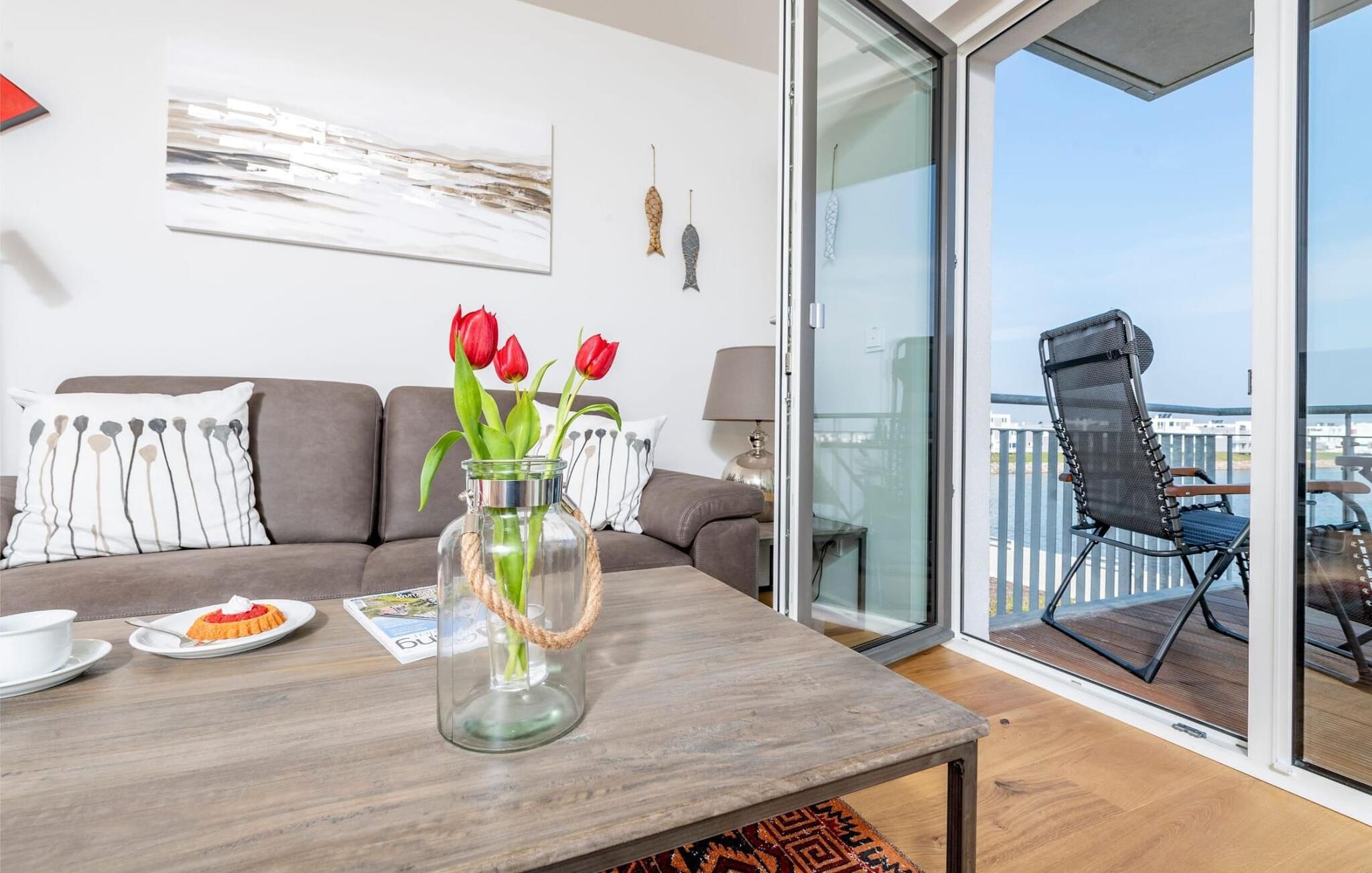 Det omfattende udstyret åbne køkken lader intet tilbage at ønske. Her kan man fremtrylle lækre feriemåltider. Altanen indbyder til en grillaften med udsigt til vandet.