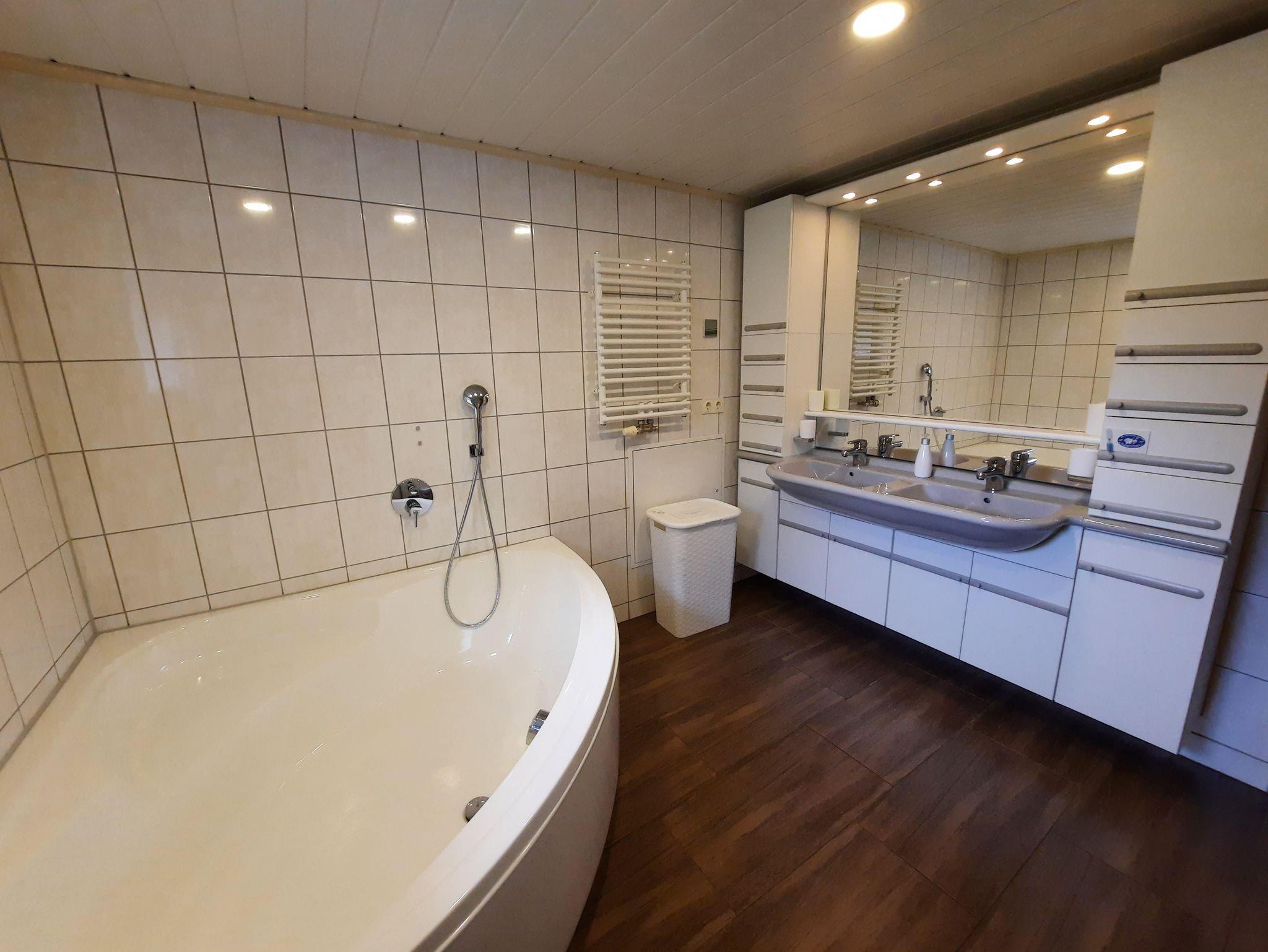 Im Erdgeschoss befinden sich ein großes Wohnzimmer, Küche und Bad mit Dusche und Eckbadewanne.