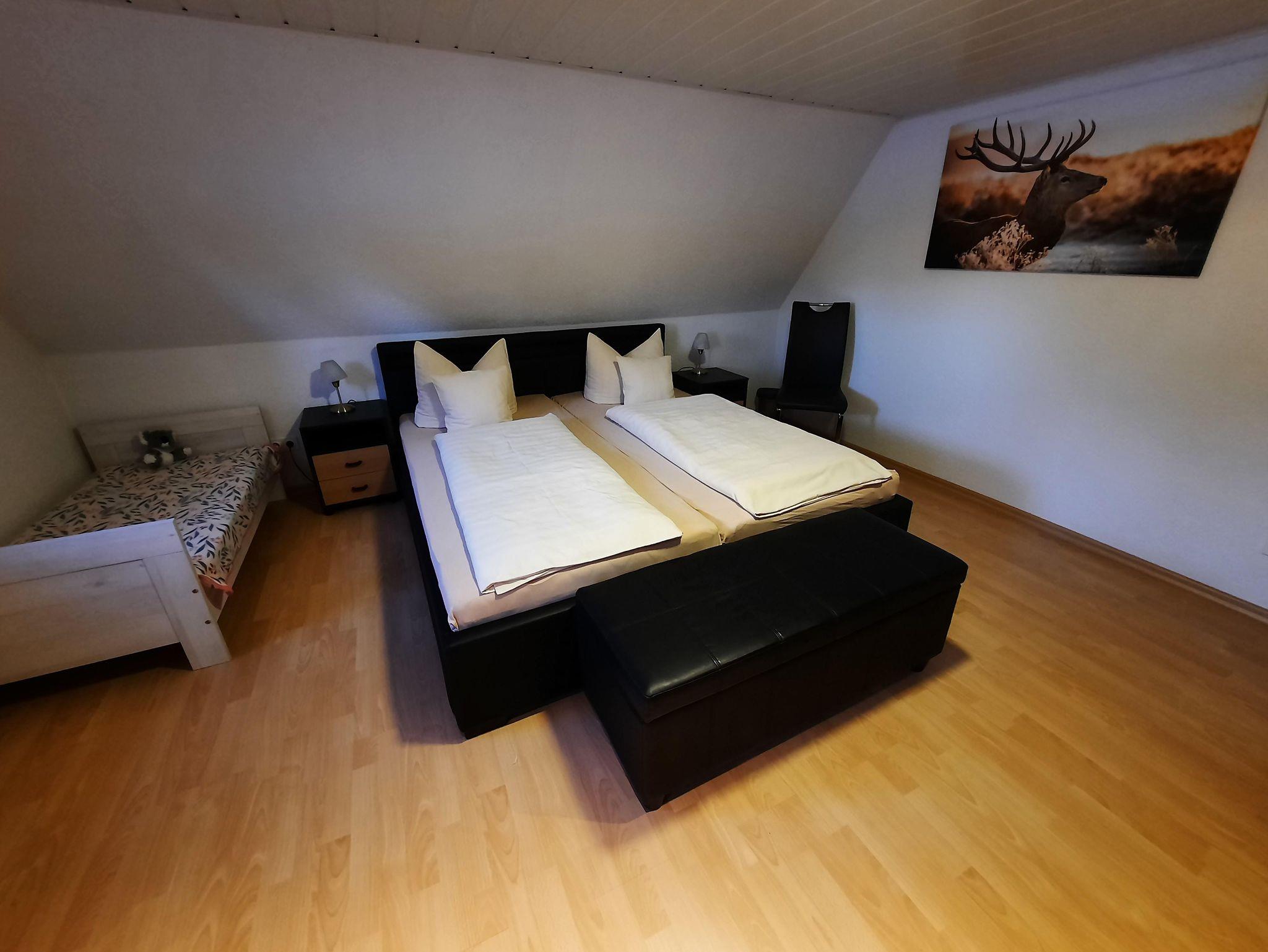 Im ersten OG finden Sie zwei Doppelzimmer (davon ein Zimmer mit Kinderbett ) und ein Einzelzimmer.