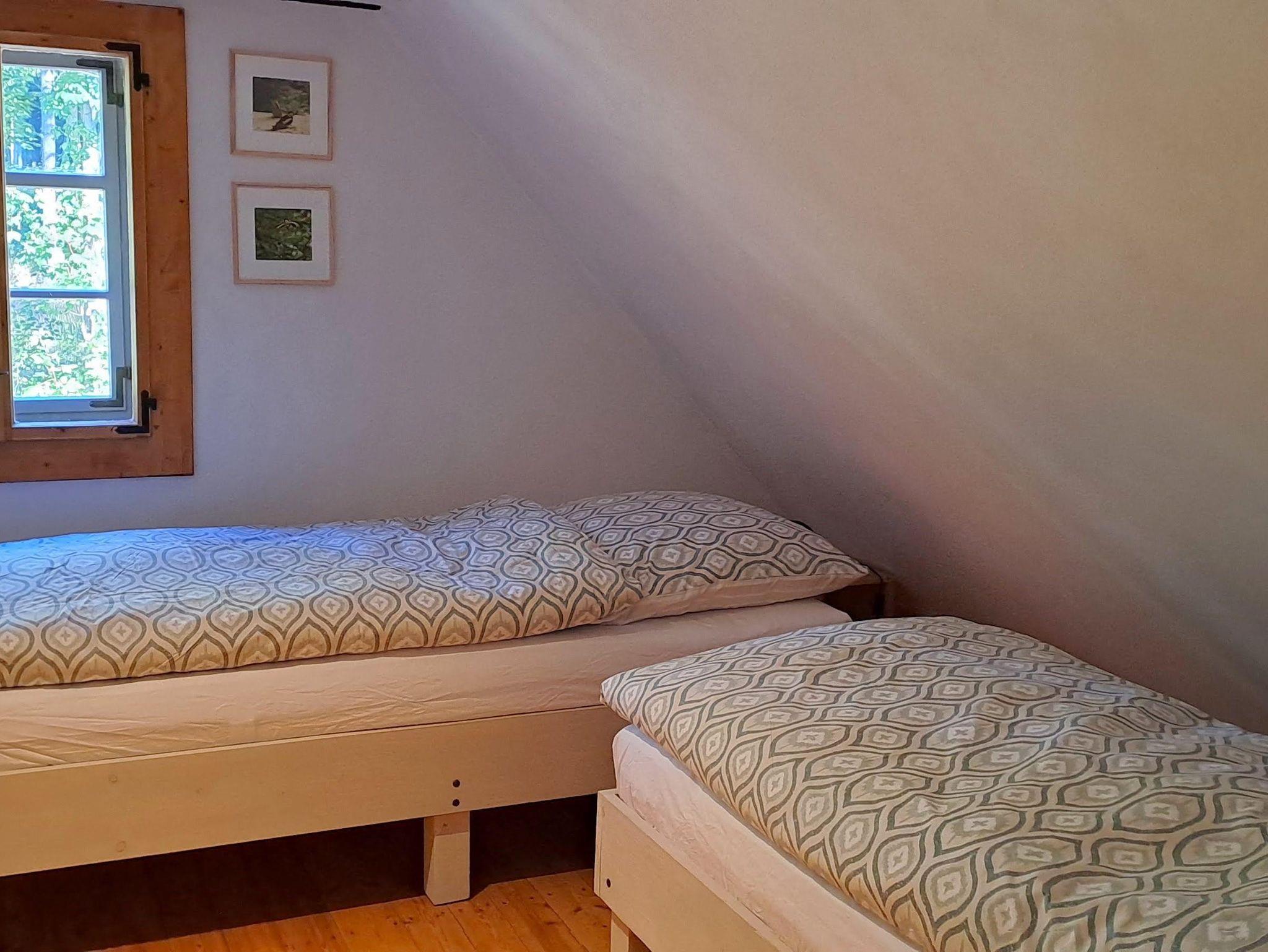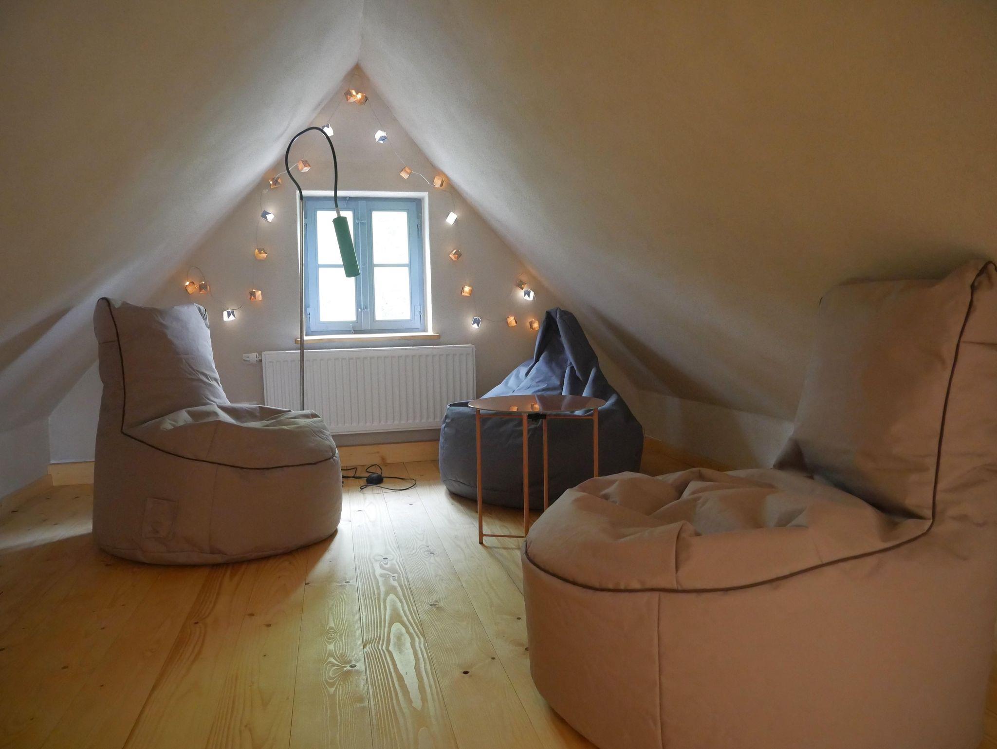 Zusätzlich gibt es einen Rückzugsort im Spitzboden (Höhe 178 cm) mit drei Sitzsäcken, kleinem Tisch und 2x Yogaausstattung.