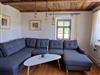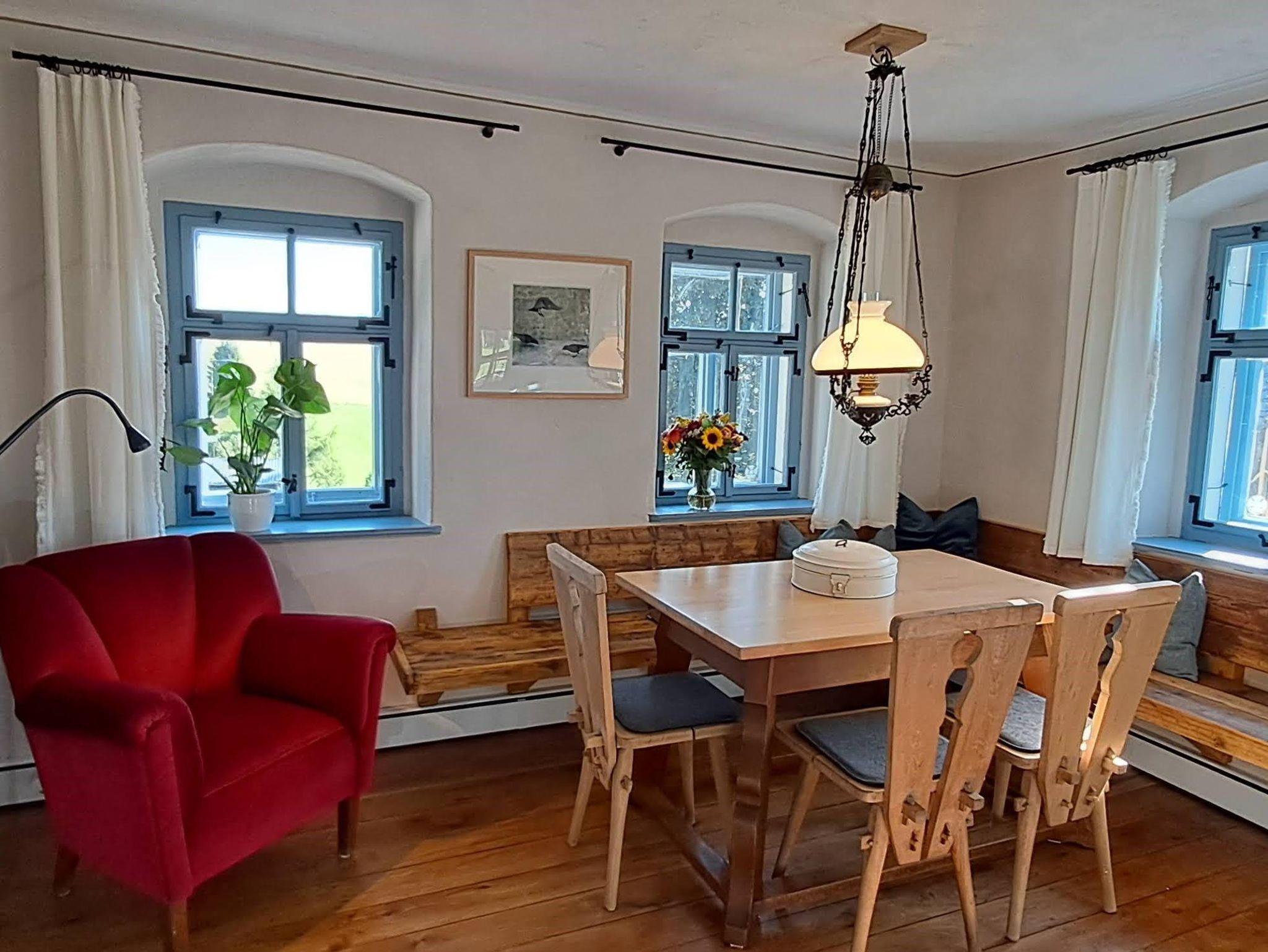 Gleich neben der hellen, modernen und voll ausgestatteten Küche mit wunderschönem, historischem Kachelofen, befindet sich das Esszimmer mit zweitem Ofen und urgemütlichen Sitzgelegenheiten. Außerdem gibt es hier einen Lesesessel neben dem Bücherregal.
