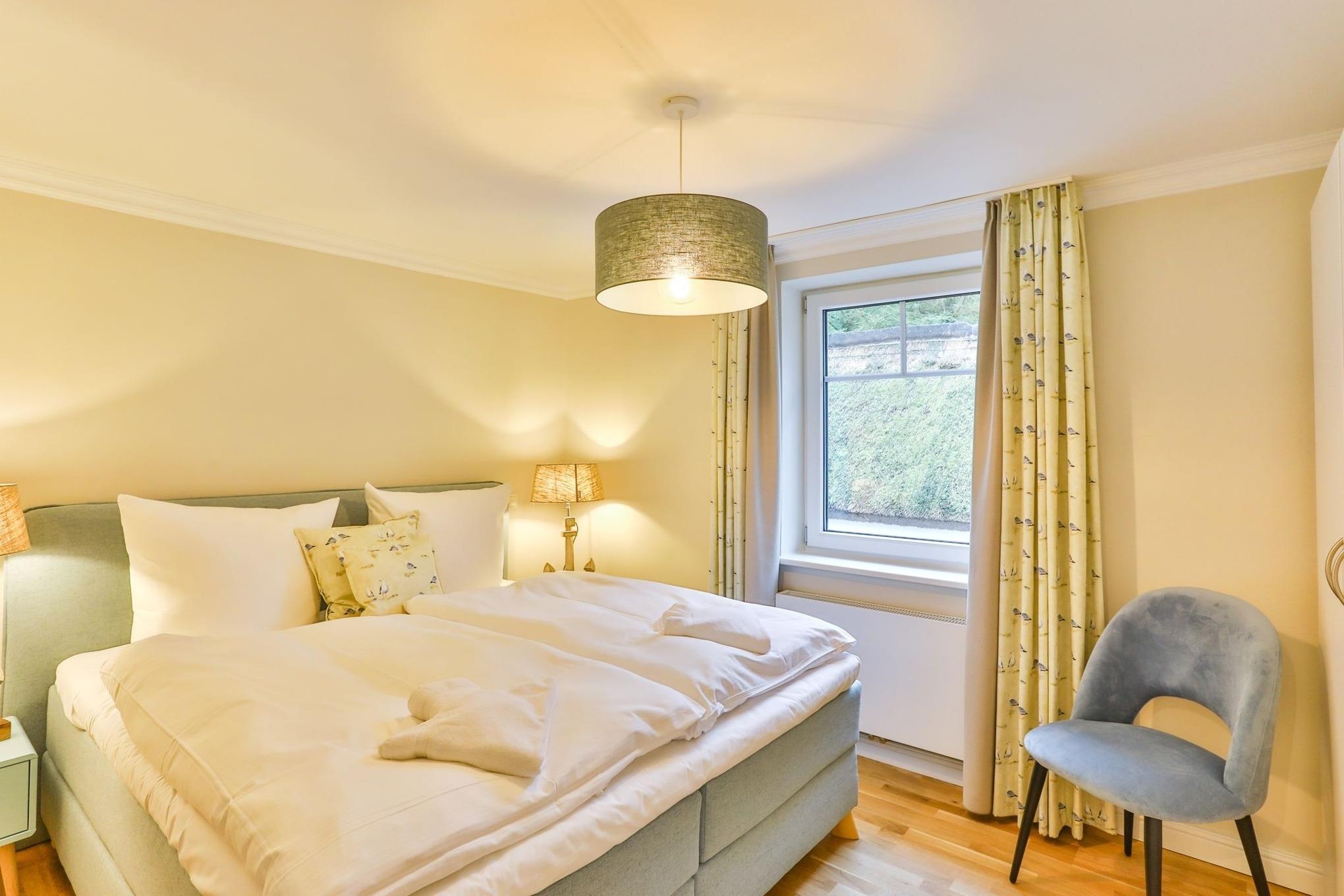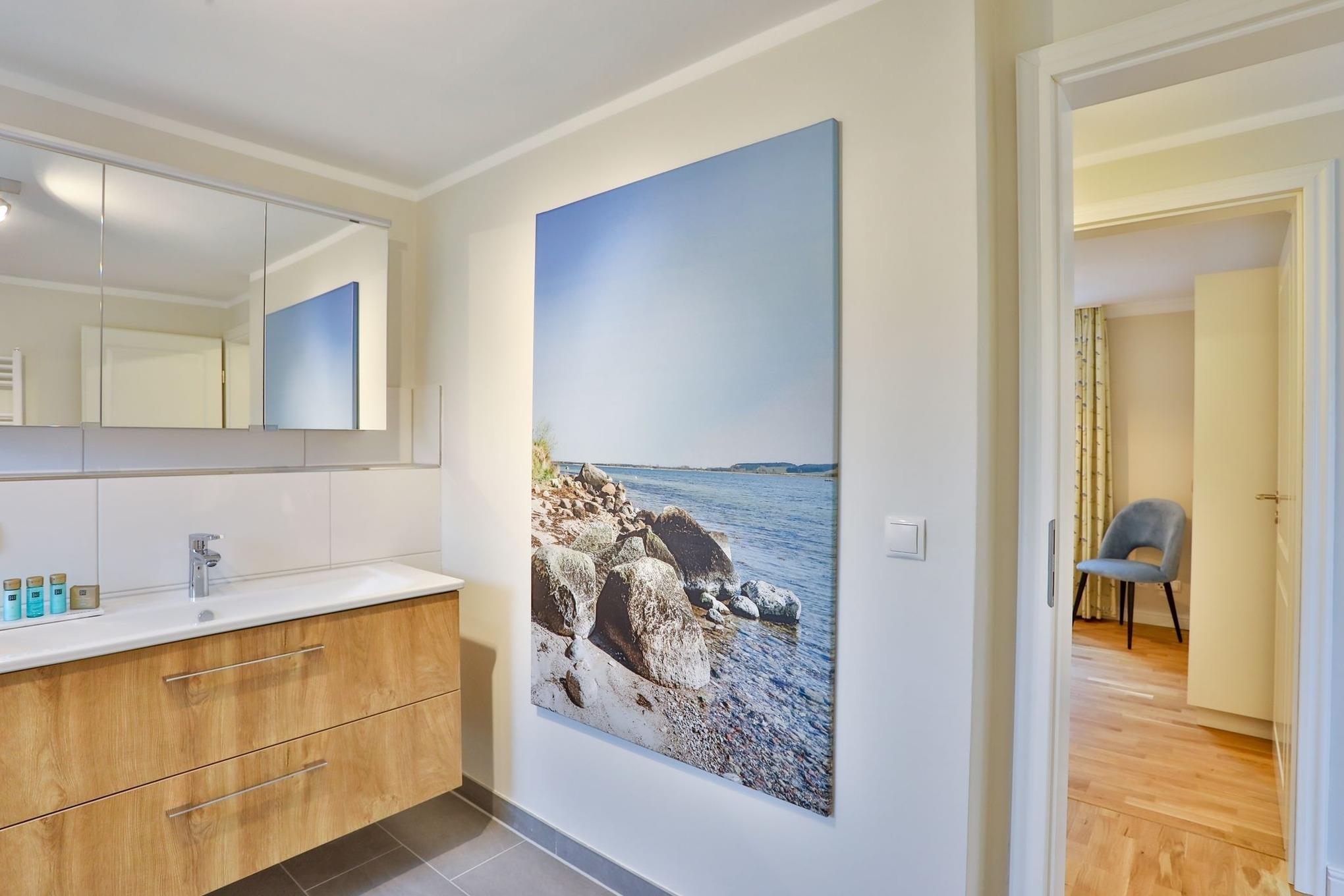 Die Wohnung "Hagensche Wiek" verfügt über einen offenen, gemütlichen und auch modernen Wohn- und Essbereich, 1 Schlafzimmer und 1 Badezimmer. Vom Wohn- und Essbereich aus gelangen Sie durch ein großes Fensterschiebeelement auf eine großzügige Terrasse mit Blick Richtung Bodden "Hagensche Wiek". Eine Aufbettung im Wohnzimmer (ausziehbarer Schlafsessel) kann auf Anfrage vorbereitet werden.