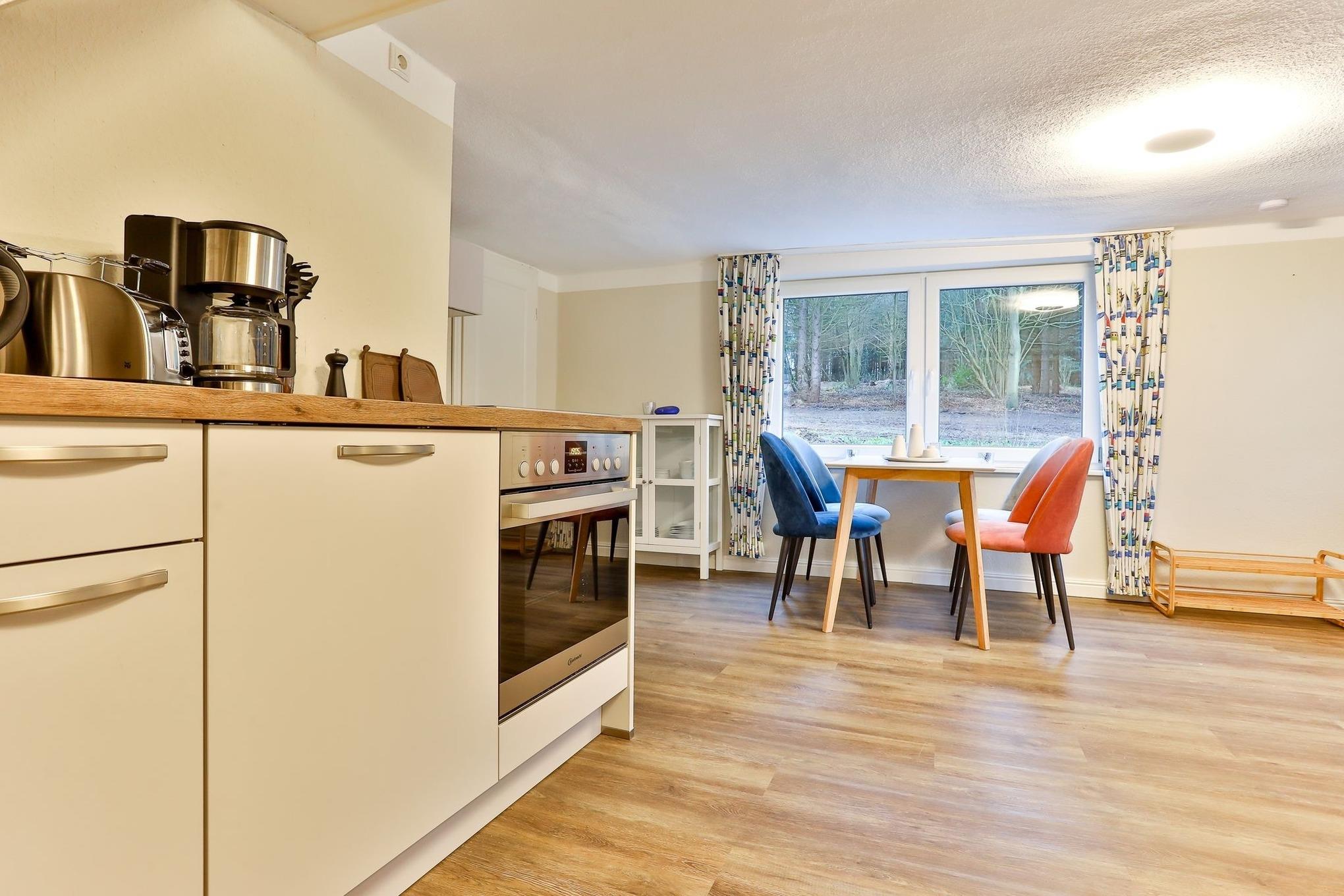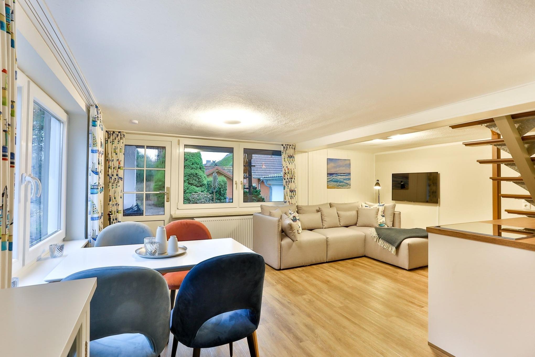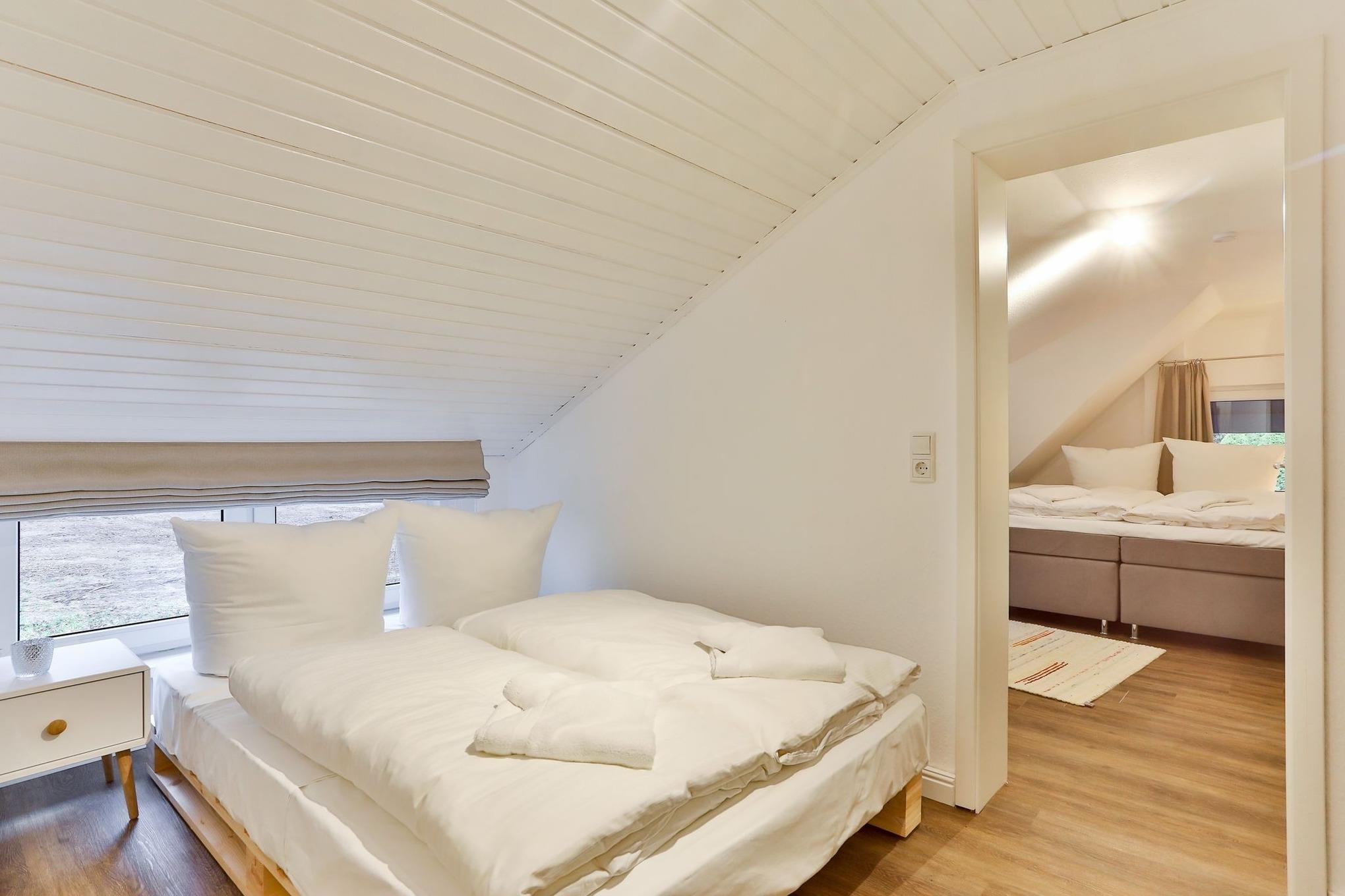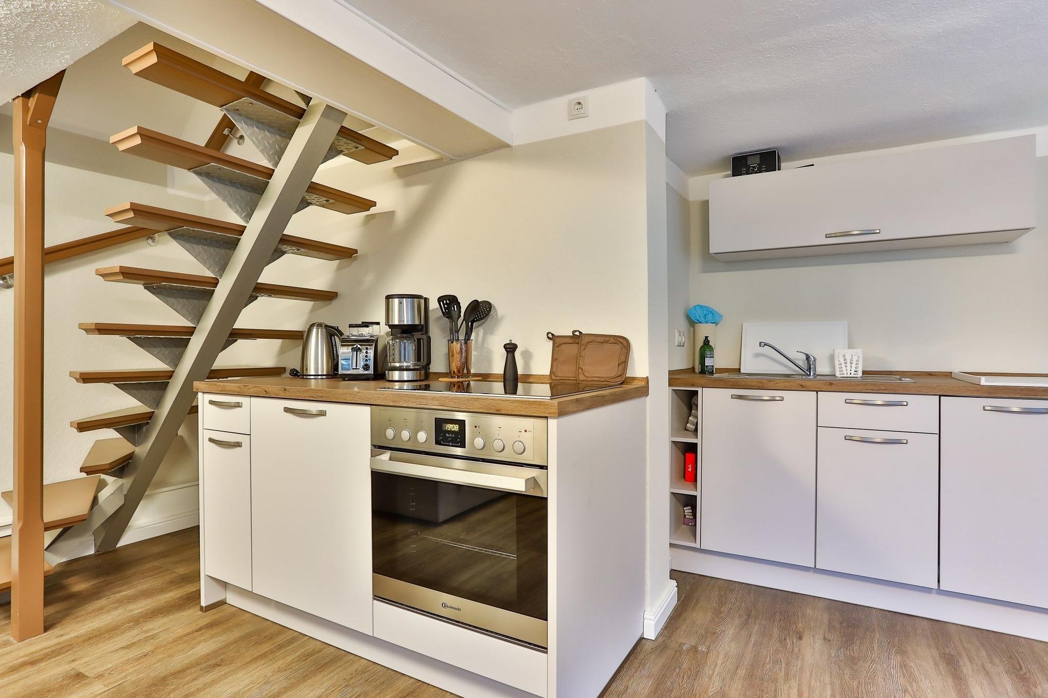 Im Erdgeschoss unseres "Raumwunders Rotbuche" befindet sich ein gemütlicher Wohn- und Essbereich mit einer kleinen Küchenzeile und einem Badezimmer mit WC und Dusche. Im Obergeschoss ist das Reethus mit zwei Schlafzimmern und einem kleinen WC ausgestattet. Vor dem Hauseingang befindet sich eine kleine, überdachte Terrasse. Bitte beachten sie, dass das Reethus eine eingeschränkte Deckenhöhe von 2 m hat.