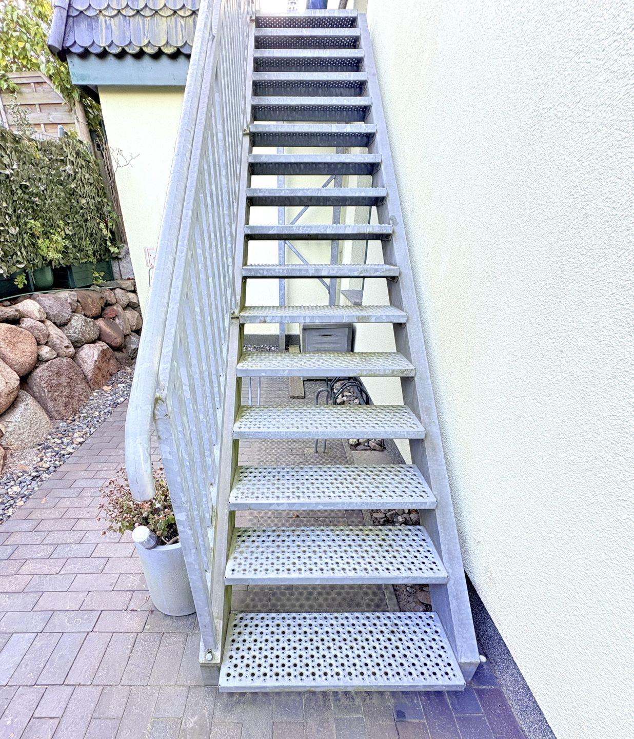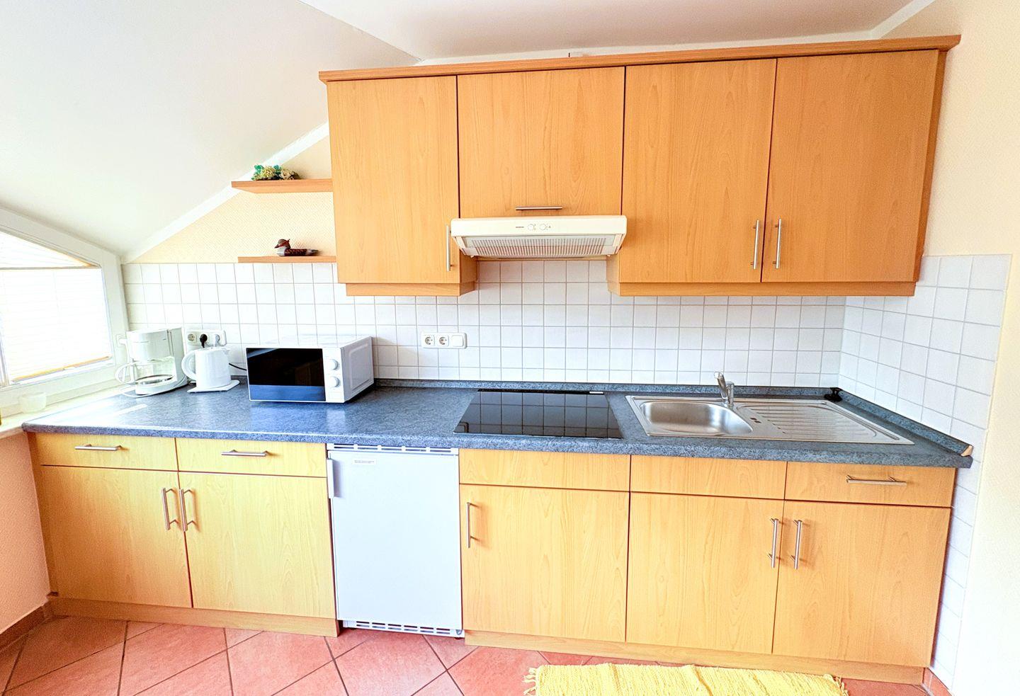 Wohnung 2 für 4 Personen, im ersten Obergeschoss gelegen, bietet auf 48 m² ein offenes, lichtdurchflutetes Wohn-/Schlafzimmer mit integrierter Küchenzeile und Essecke. Das gemütliche Schlafzimmer ist mit einem Doppelbett ausgestattet. Highlight ist die eigene Dachterrasse, von der Sie eine wunderbaren Ausblick genießen.