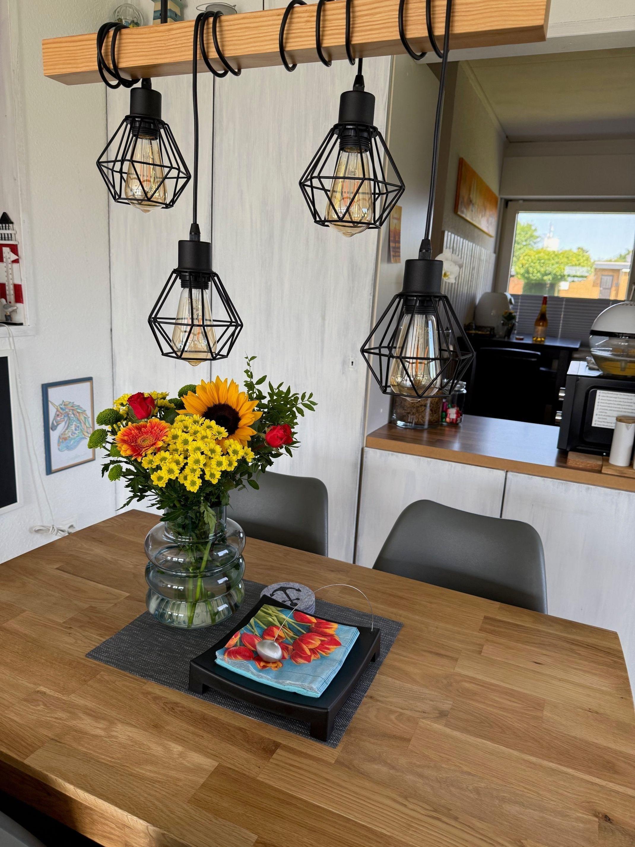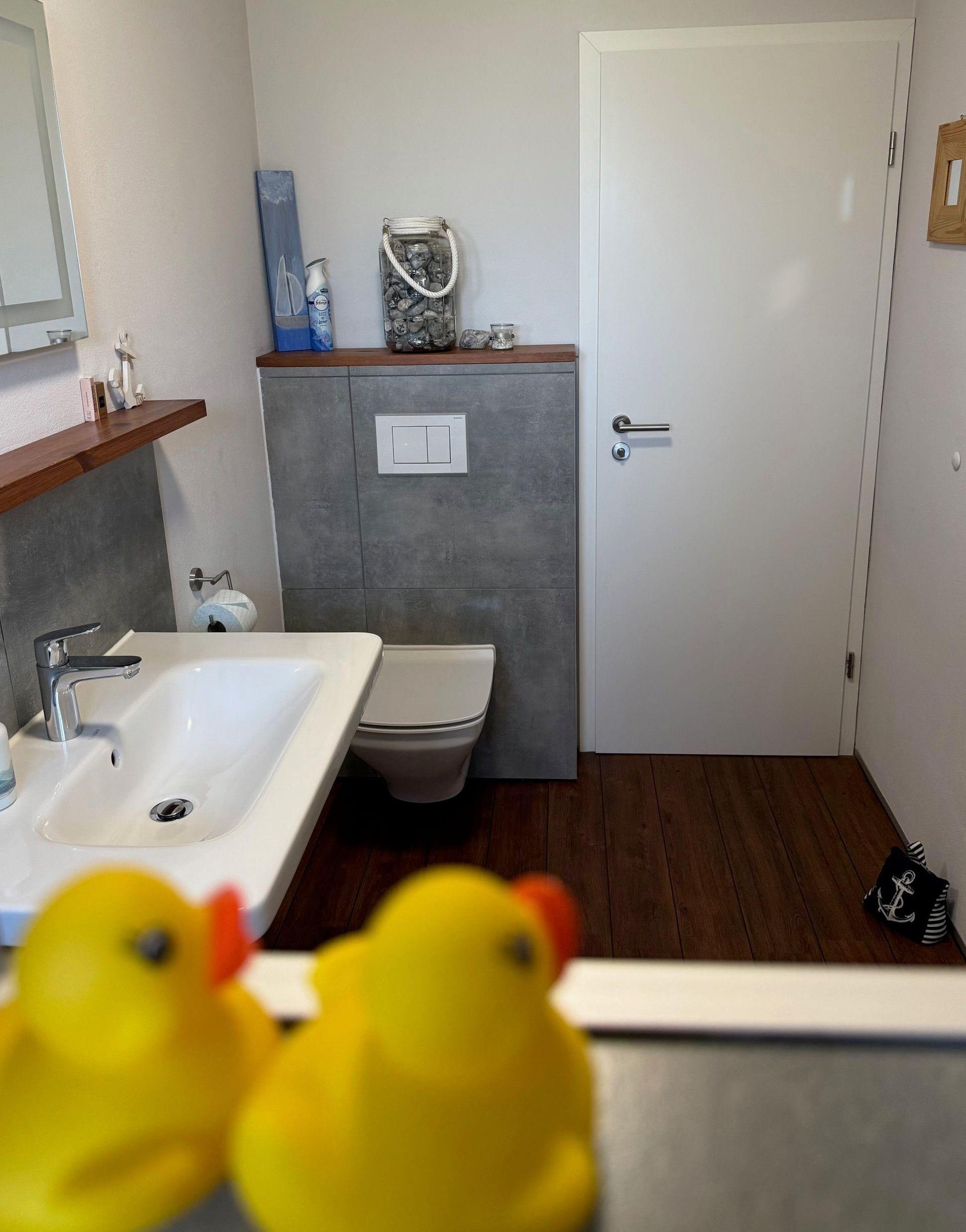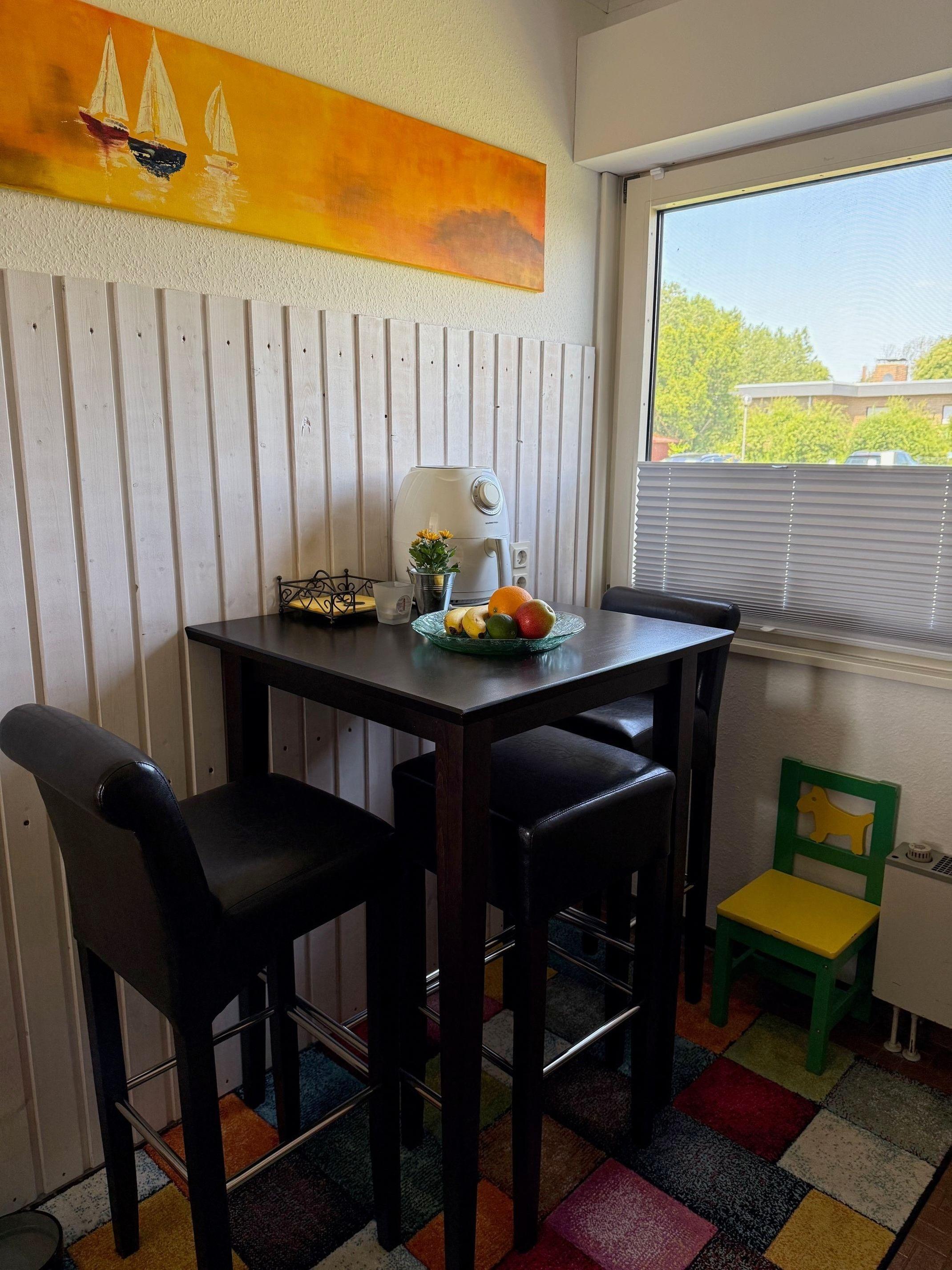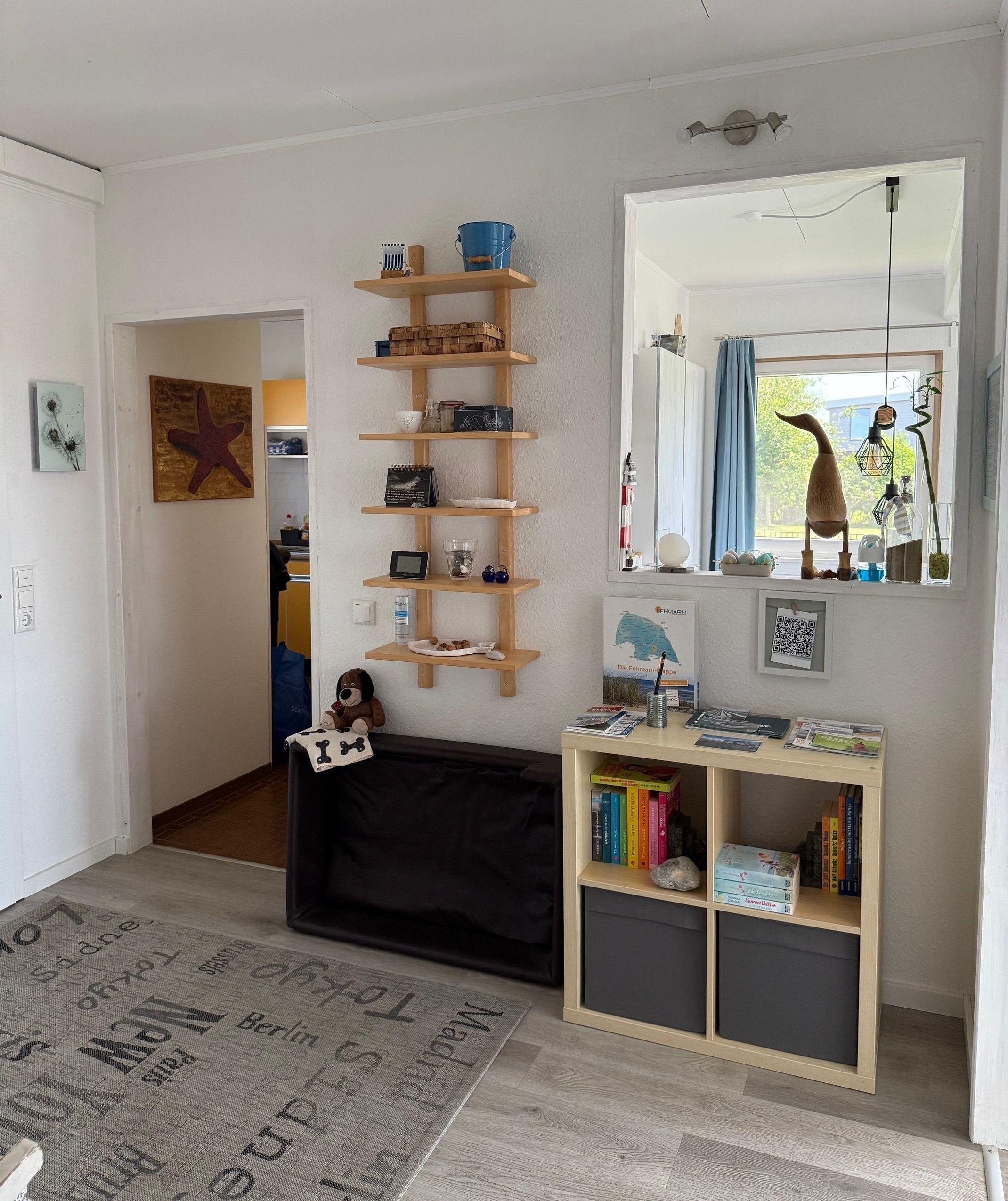 Die maritime Wohnung hat ein großes Wohn- und Esszimmer mit einer gemütlichen Wohnlandschaft mit Schlaffunktion, Liegefläche für 2 Personen ca. 160 x 210 cm, ein Wandbett ca. 90 x 200 cm, einem Kaminofen für gemütliche Stunden in der kalten Jahreszeit, einen großen Fernseher, Kickertisch, eine Spielecke mit Spielzeug und Spielen für die Lütten und einen Esstisch. In der Retro-Küche, mit Durchreiche zum Esszimmer, steht ein Bartisch mit 3 Hockern, es ist ein Geschirrspüler, ein großer Kühlschrank mit Gefrierschrank, eine Mikrowelle, ein Ceranfeld mit Backofen, Kaffepad- (Senseo) und Filterkaffee-Maschine, Milchaufschäumer, Smoothiemaker, Sodastream, Airfryer, Mixer, Toaster und Zitronenpresse vorhanden. Im Schlafzimmer ist ein Ehebett, Liegefläche für 2 Personen ca. 180 x 200 cm (2 Matratzen), ein Babybettchen ca. 70 x 140 cm (optional), ein Fernseher und ein Kleiderschrank. Das Badezimmer ist mit Dusche, Haartrockner und beheizbarem Handtuchhalter. Neben einer kleinen Gästetoilette im 70-er Jahre Stil gibt es noch einen Flur mit Sitzmöglichkeit und einen Windfang mit Garderobe und Schuhablage am Eingang.