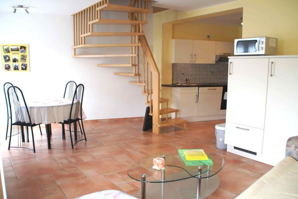 Schöne Ferien und gute Erholung zwischen Wiesen, Bäumen und Wein, in schönen Ferienwohnungen mit allem Komfort. Die ruhige Lage am Ende der Straße ohne Durchgangsverkehr garantiert Ihnen erholsamen Schlaf. Die exklusive Bauweise unseres Hauses lässt in allen Räumen die Sonne scheinen. Allergiker gerechte Wohnräume, komplett ausgestattete Blockküche, großzügiges Esszimmer, bequeme Couchgarnitur, Balkon oder Terrasse lassen den Urlaub bereits beim betreten der Wohnung beginnen. Genießen Sie bereits beim Frühstück auf der Terrasse die ersten Sonnenstrahlen, beobachten Sie Ihre Kinder wenn diese das letzte Brötchen an die Rehe am angrenzenden Damwildgehege verfüttern. Ihre Kinder erreichen Spielplatz, Spielwiese und Wildgehege direkt vom Ferienhaus. Unser Service für Sie:: Am Morgen bringen wir Ihnen frische Brötchen an die Wohnungstür. Weine, Sekt, Traubensaft, Liköre, Weintraubengelee, Balsamessig, Honig , alles halten wir im benachbarten, familieneigenen Weingut für Sie bereit.