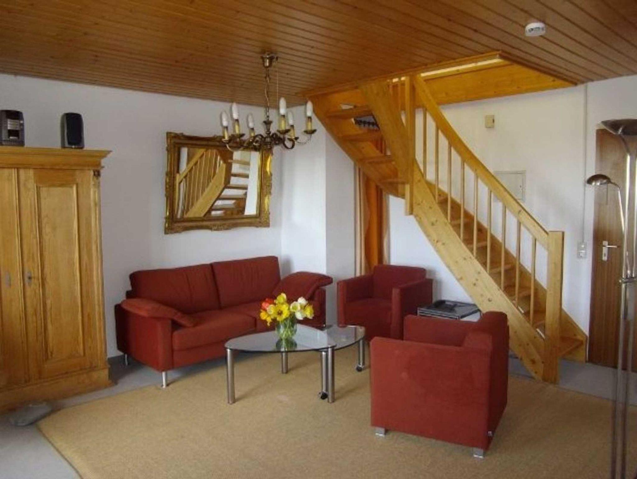 Die Wohnung befindet sich im ersten Obergeschoss und besteht aus einem Wohnzimmer mit Couchgarnitur, Küchenzeile (Toaster, Kaffeemaschine) mit Eßecke, Dusche und WC; Schlafzimmer mit Doppelbett über eine bequeme Treppe vom Wohnzimmer aus erreichbar. Ein 2. Schlafzimmer mit einem Einzelbett steht für die 3. Person zur Verfügung.