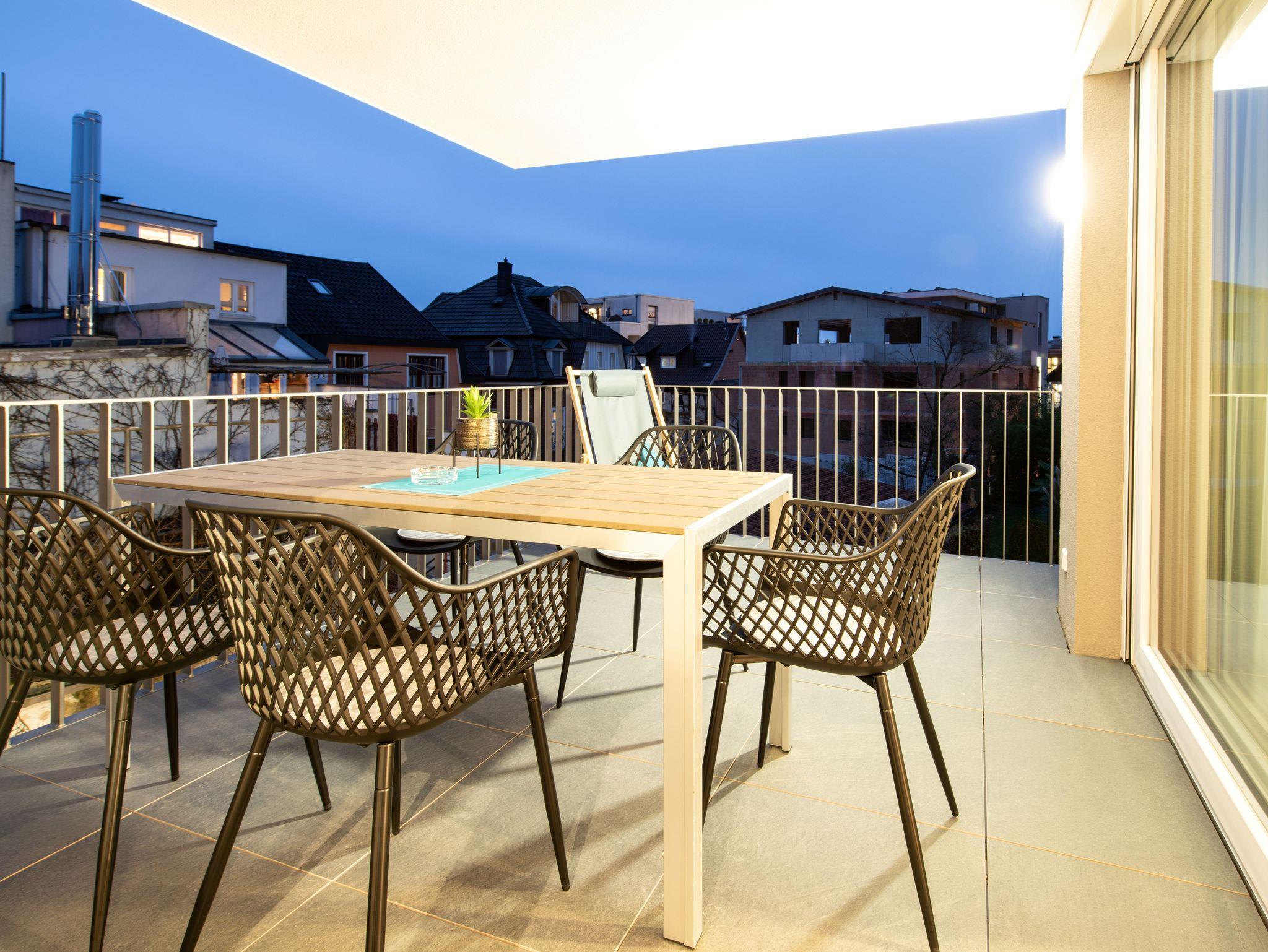 Zimmer 1: Das erste, nach Norden ausgerichtete Schlafzimmer mit französischem Balkon, ist ausgestattet mit einem Doppelbett (180x200 cm), Flachbild TV sowie genügend Platz für Ihr Gepäck. Zimmer 2: Das kleine, nach Westen ausgerichtete Schlafzimmer mit französischem Balkon, ist ausgestattet mit einem komfortablen Stockbett mit 2 Betten (90x200 cm) und Flachbild TV. Zudem gibt es hier eine Kommode, Kleiderhaken und einem Schreibtisch. Zimmer 3: Das größte Zimmer auf der Südseite des Apartments, mit bodentiefen Fenstern, französischem Balkon und direkten Zugang zur großen Terrasse, kann sowohl als charmantes Wohnzimmer als auch komfortables Schlafzimmer mit einem Doppelbett (180x200 cm) genutzt werden. Sorgfältig ausgewählte Möbel und ein Flachbild TV bieten dem Raum eine vielseitige Nutzung. Der große Wohn-Essbereich bietet viel Platz für die ganze Familie. Der Esstisch direkt am bodentiefen Fenster zur Terrasse und die direkt anschließende Küche bieten höchsten Wohnkomfort. Ein Flachbild TV gegenüber des Essbereichs bietet Unterhaltung von der Küche, Essplatz und sogar von der Terrasse aus. Vom Wohn-Essbereich gelangen Sie über eine Schiebetüre auf die sehr große, überdachte Terrasse. Hier finden Sie einen komfortablen Tisch zum Essen, Spielen oder Arbeiten sowie Liegestühle zum Relaxen. Genießen Sie die Sicht über die Markdorfer Dächer und das städtische Grün der Altstadt.