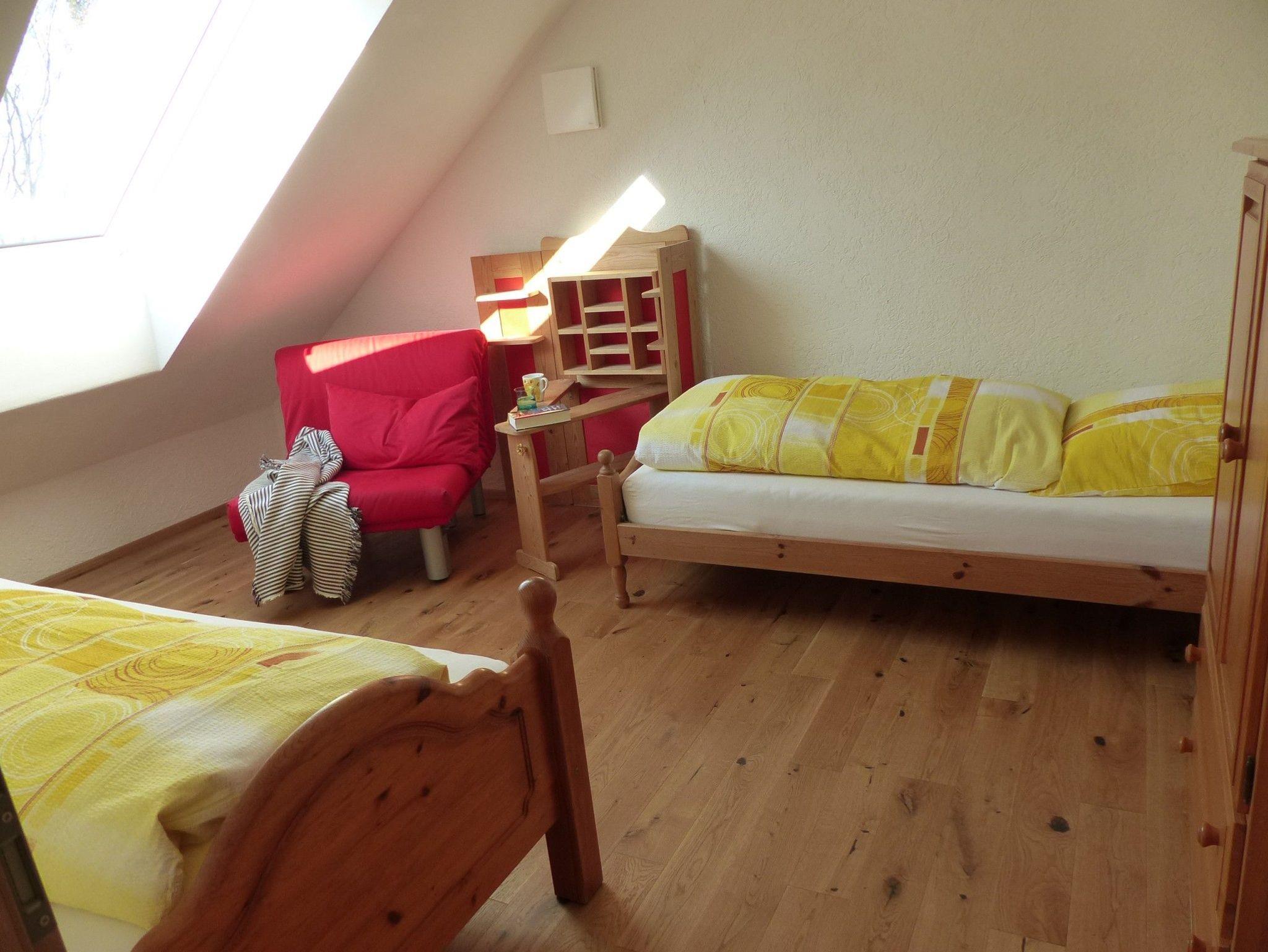 Die Wohnung ist in 2 Schlafzimmern mit 4 Betten (1 Doppelbett, 2 Einzelbetten) ausgestattet. Bei Bedarf kann ein Schlaf-Sessel für einen weiteren Schlafplatz aufgebettet werden, auch ein Reisebett (60*120cm, für Baby oder Kleinkind, siehe Bilder) steht nach vorheriger Rücksprache zur Verfügung. Alle Schlafzimmer können mit Rollläden abgedunkelt werden.