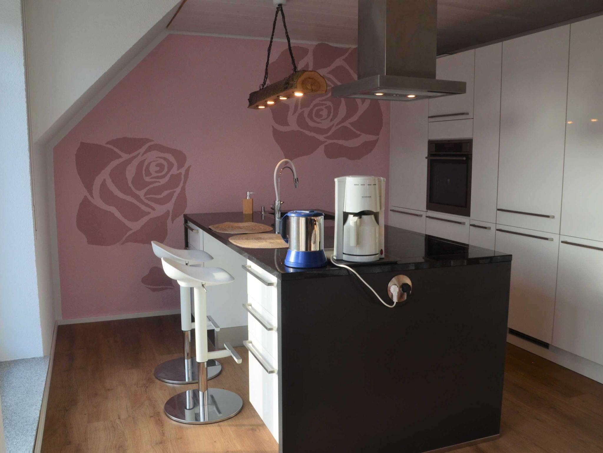 Sonnige 3-Zimmer-Ferienwohnung (Nichtraucher) mit zwei Schlafzimmern (eines mit Doppelbett und eines mit zwei getrennten Betten). Großer Wohnraum mit Übergang zur modernen Küche und dem Essplatz. Die Küche ist komplett ausgestattet und verfügt unter anderem über eine Filter-Kaffeemaschine, Spülmaschine, Backofen, Wasserkocher und Mikrowelle. Im Wohnbereich befindet sich zwei Sofas sowie der SAT-TV.