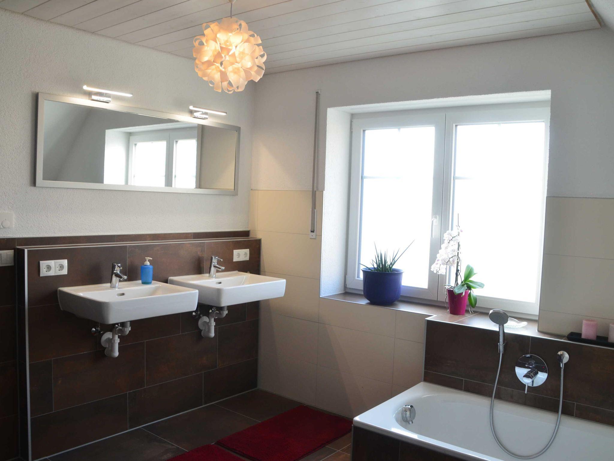 Das Badezimmer ist mit zwei Waschbecken, Badewanne und bodenebener Dusche ausgestattet. Die Toilette ist separat.