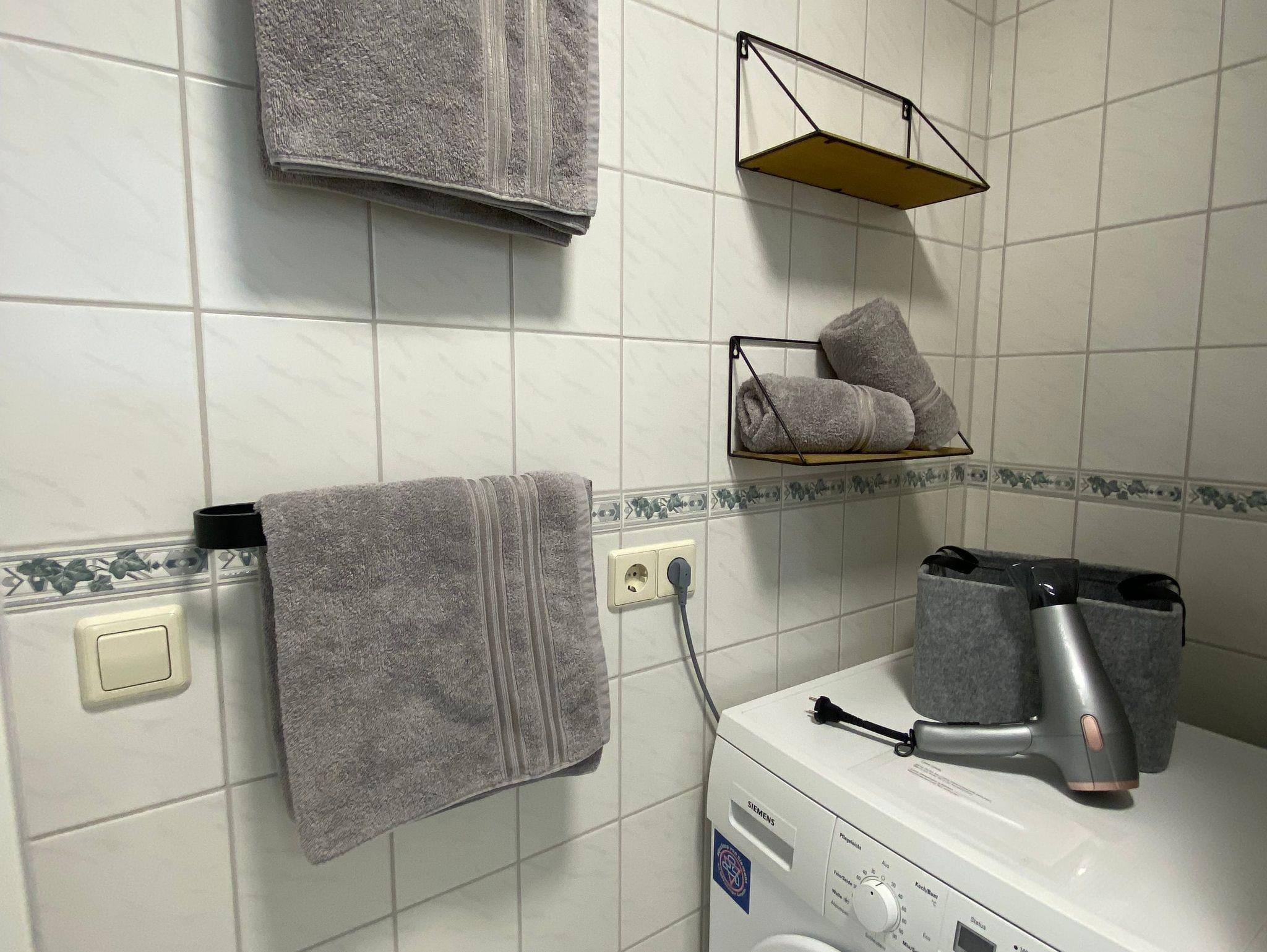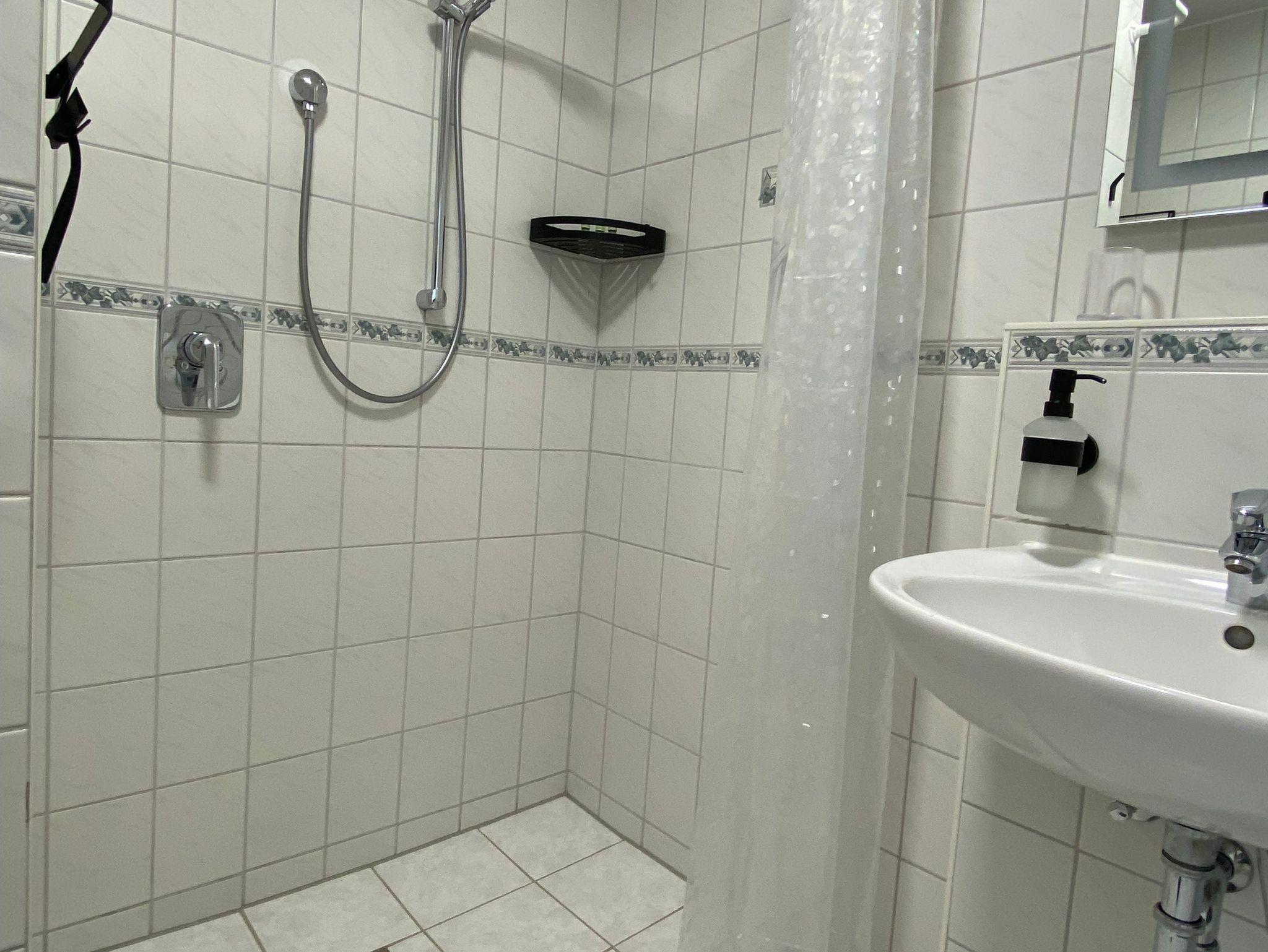 Unser kleines barrierefreies Badezimmer ist ausgestattet mit: begehbarer Dusche / WC / Waschbecken / Fön / Waschmaschine.