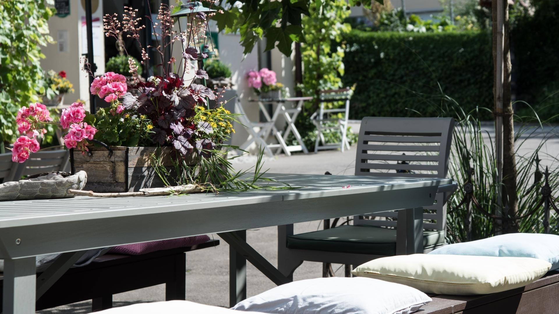 Kleine, feine Ferienwohnung für 2 Personen mit kombiniertem Wohn-/Schlafraum und Kochecke, Badezimmer mit Dusche, WC, Föhn, Handtuchwärmer und Kosmetikspiegel, Kleine Singleküche mit Kühl- und Gefrierkombination, Plattenherd, Wasser-/Eierkocher, Kaffeemaschine, Toaster, Ausblick zum hinteren Innenhof, Richtung Hofladen, Möblierter Freisitz mit Sonnenschirm, Lage: EG