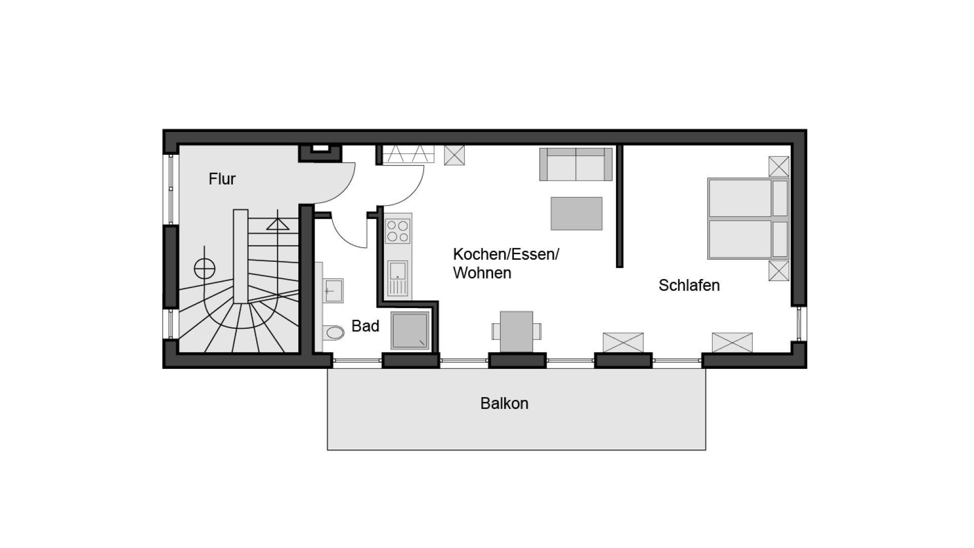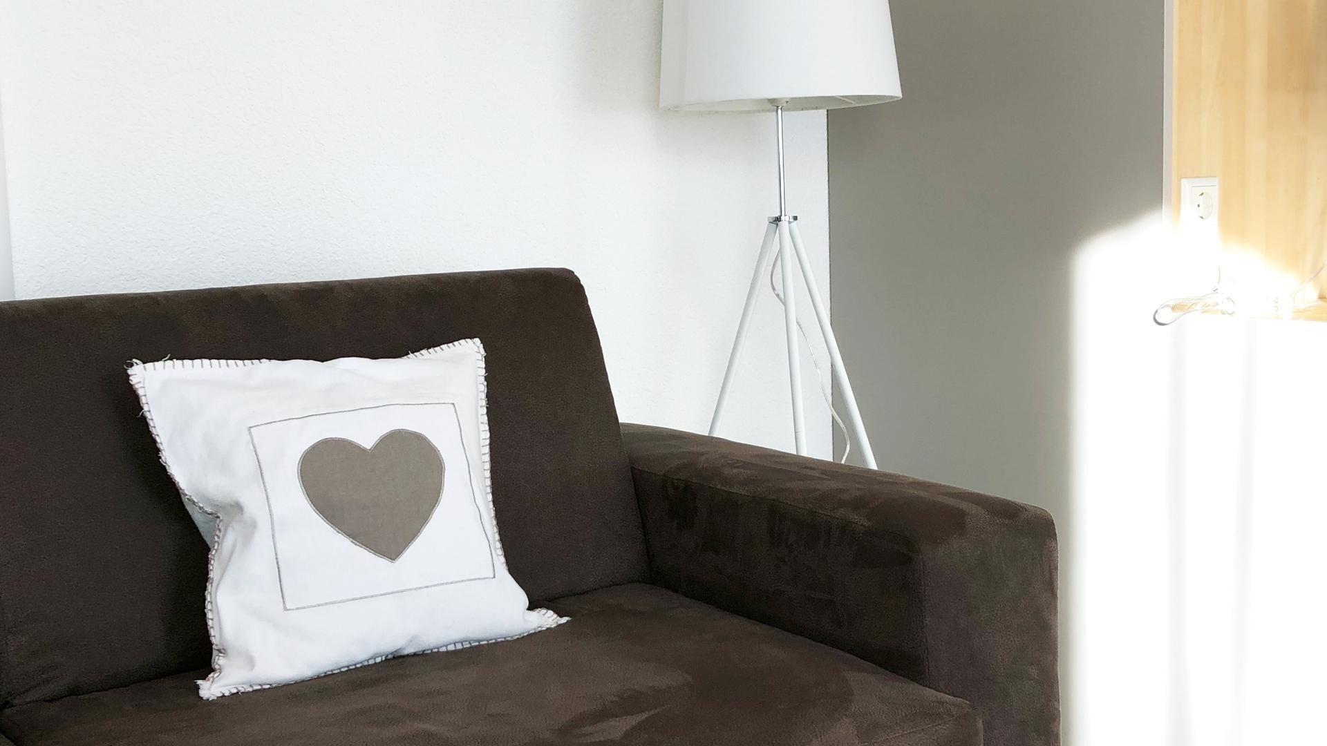 • Helle Ferienwohnung für 2 Personen, Wohnraum mit Raumteiler für kombinierten Wohn-/Schlafraum und Küchenzeile (Zusatzbett möglich)