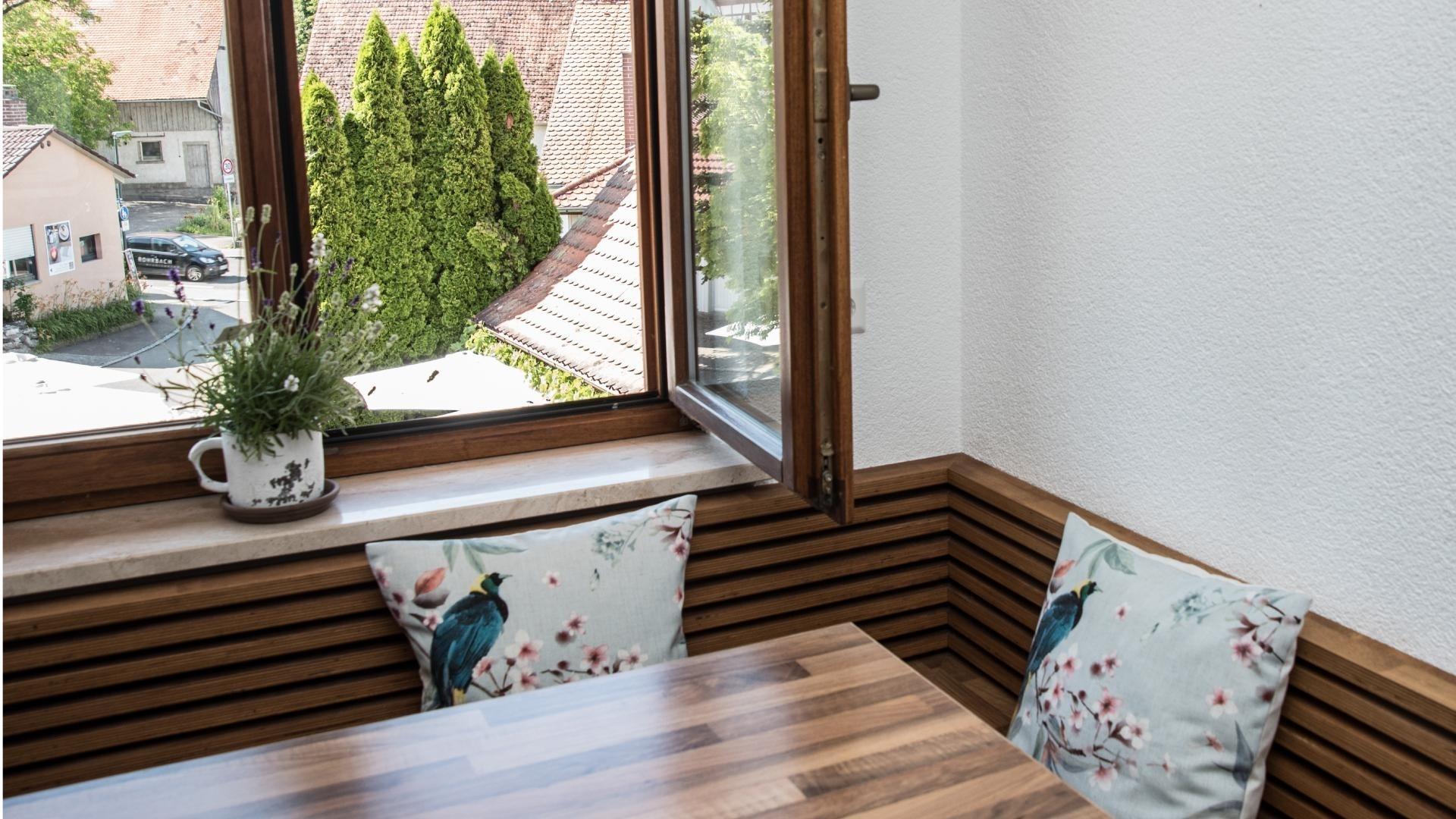 Heller Wohn- und Schlafraum mit Doppelbett für 2 Personen, im kombinierten Wohn- und Schlafraum gibt es zusätzlich eine Ausziehcouch für 2 Personen, Flur mit Garderobe, separate Küche mit Essbereich, Badezimmer mit Dusche, WC, Föhn und Kosmetikspiegel. Einbauküche mit Ceranfeld, Kühlschrank mit Gefrier-Einheit, Spülmaschine, Wasser- und Eierkocher, Wok, Kaffeemaschine und Toaster, Ausblick auf das Ittendorfer Schloß und auf den Vorderhof, Blick zum Brennereihäusle, Lage: 1. OG