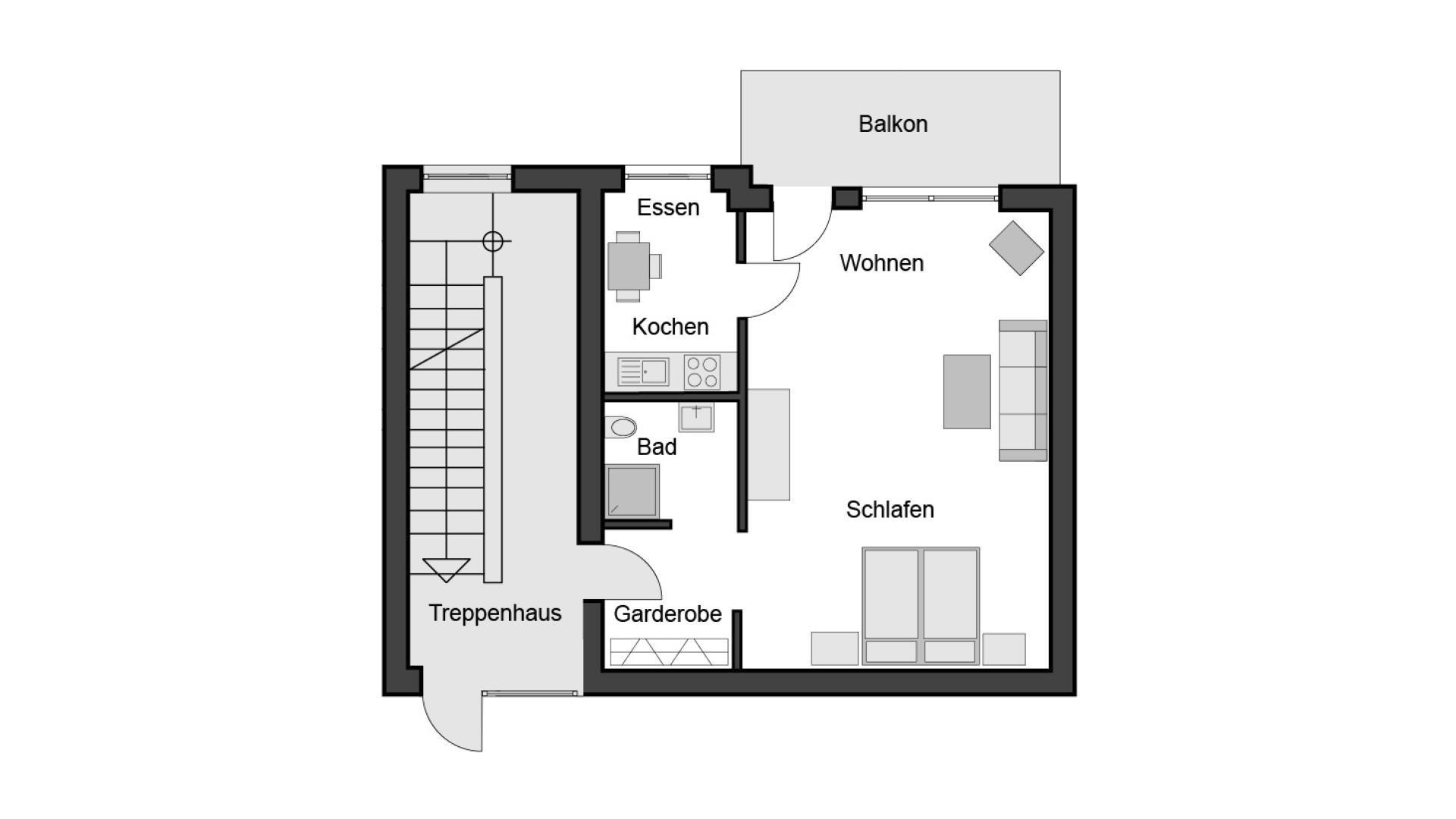 • Heller Wohn- und Schlafraum mit Doppelbett für 2 Personen, Flur mit Garderobe, separate Küche mit Essbereich