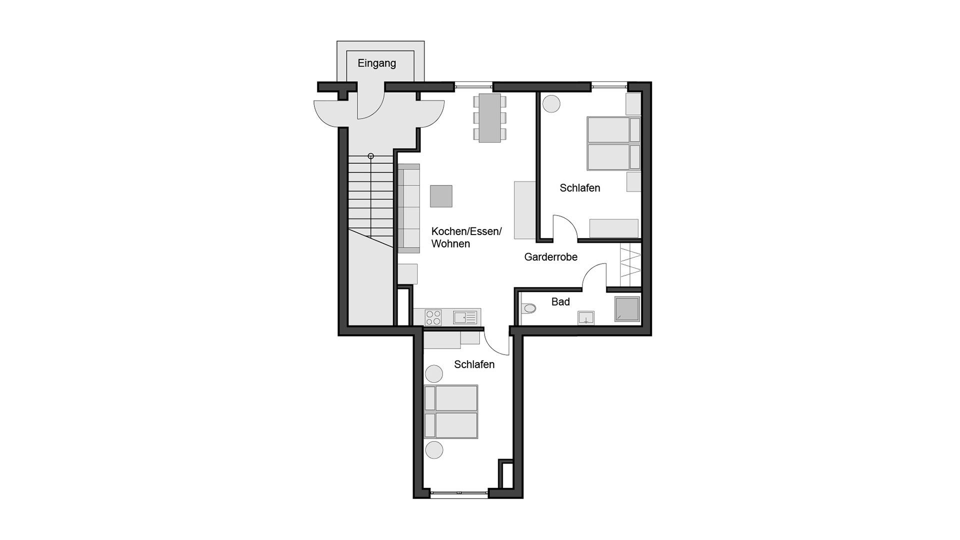 • Praktische Ferienwohnung für 4 Personen mit 2 getrennten Schlafzimmern und kombiniertem Wohn-/Essraum und Küchenbereich