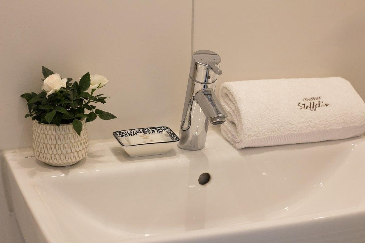 • Badezimmer mit Dusche, WC, Föhn, Kosmetikspiegel