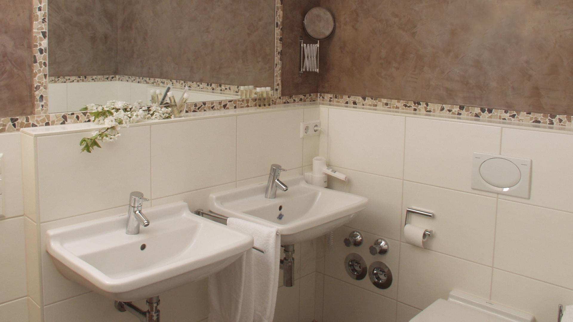 Badezimmer mit Badewanne, 2 Waschbecken, Dusche, 2 WC, Handtuchwärmer, Föhn und Kosmetikspiegel