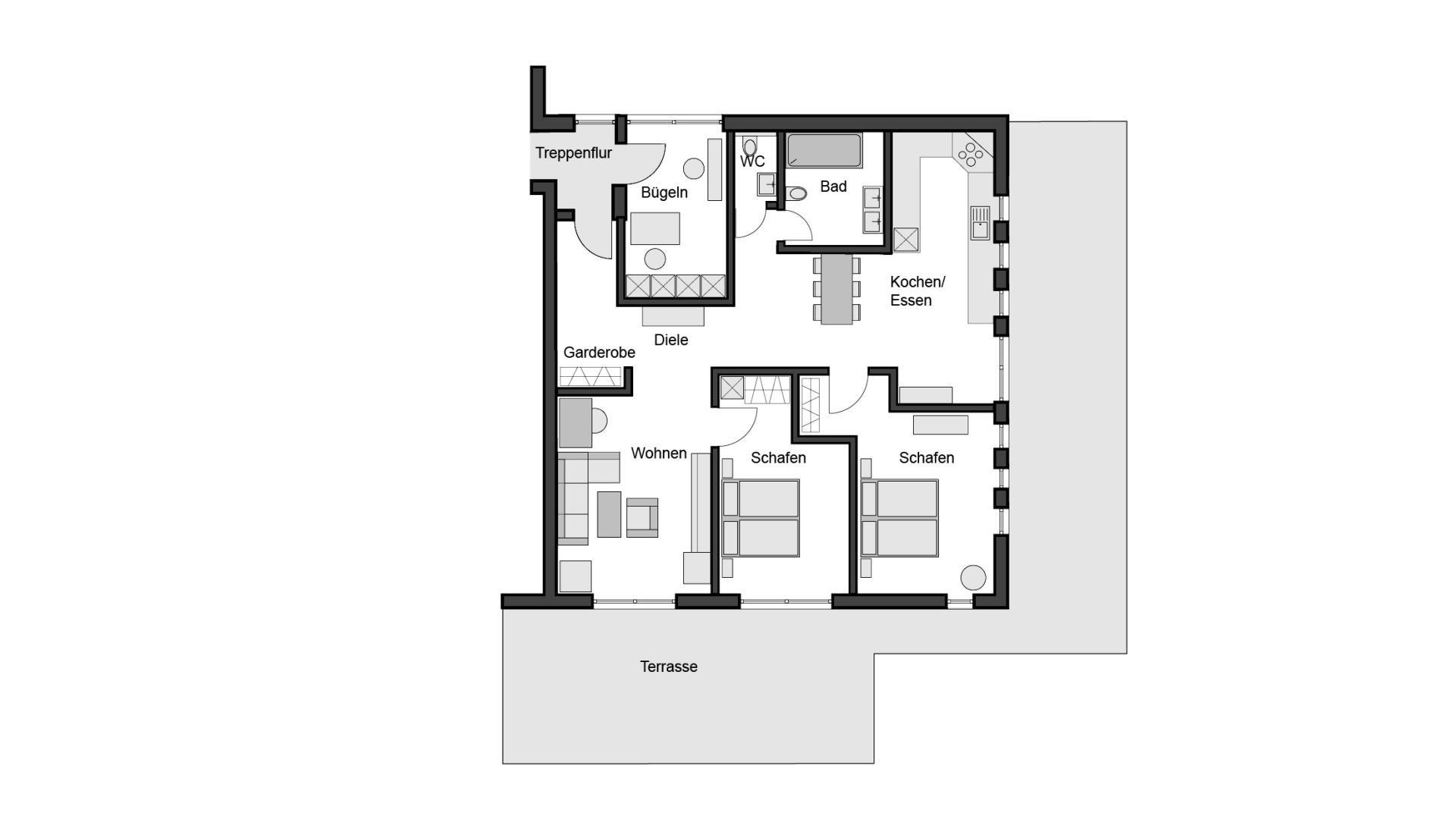 • Großer und moderner Wohnraum für 4 Personen mit Wohnküche und Essbereich, 2 getrennte Schlafzimmer (Zusatzbett möglich)