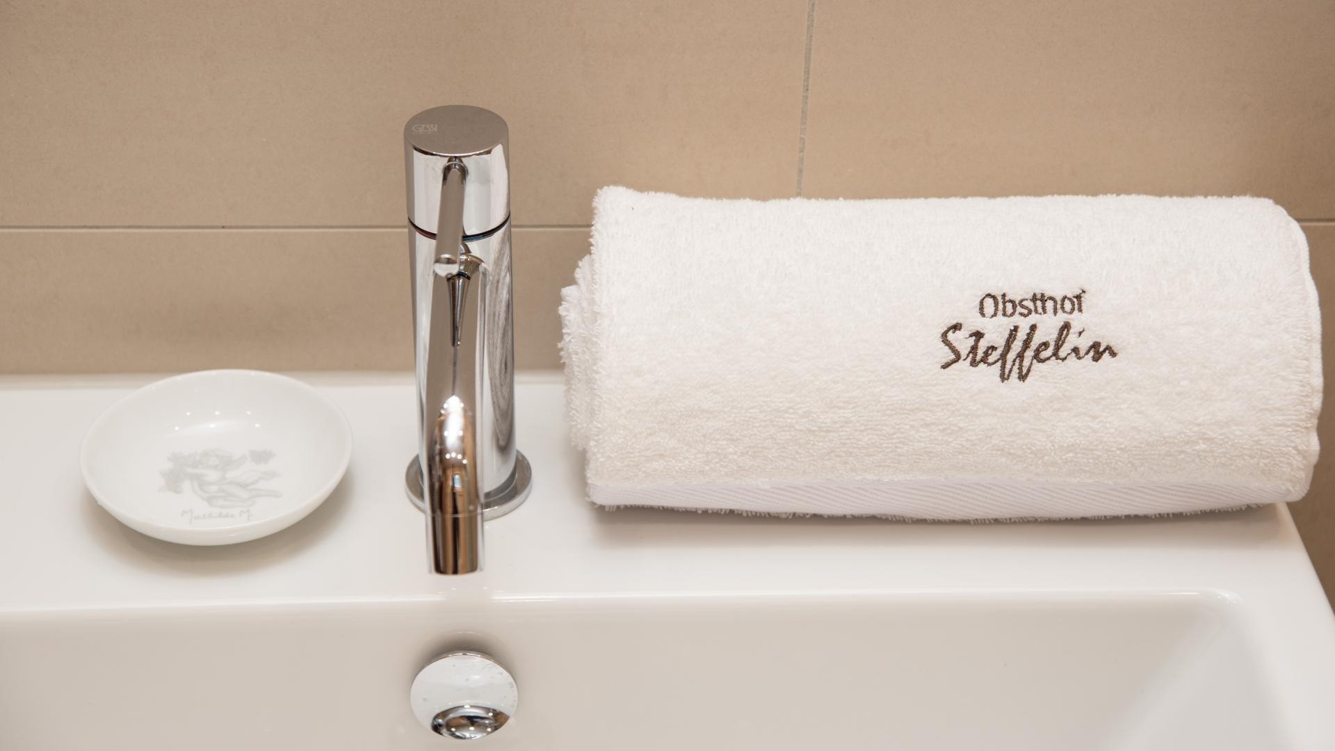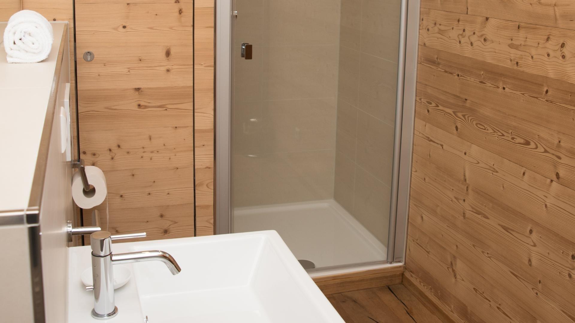 • Badezimmer mit Waschbecken, Dusche, WC, Handtuchwärmer, Föhn und Kosmetikspiegel