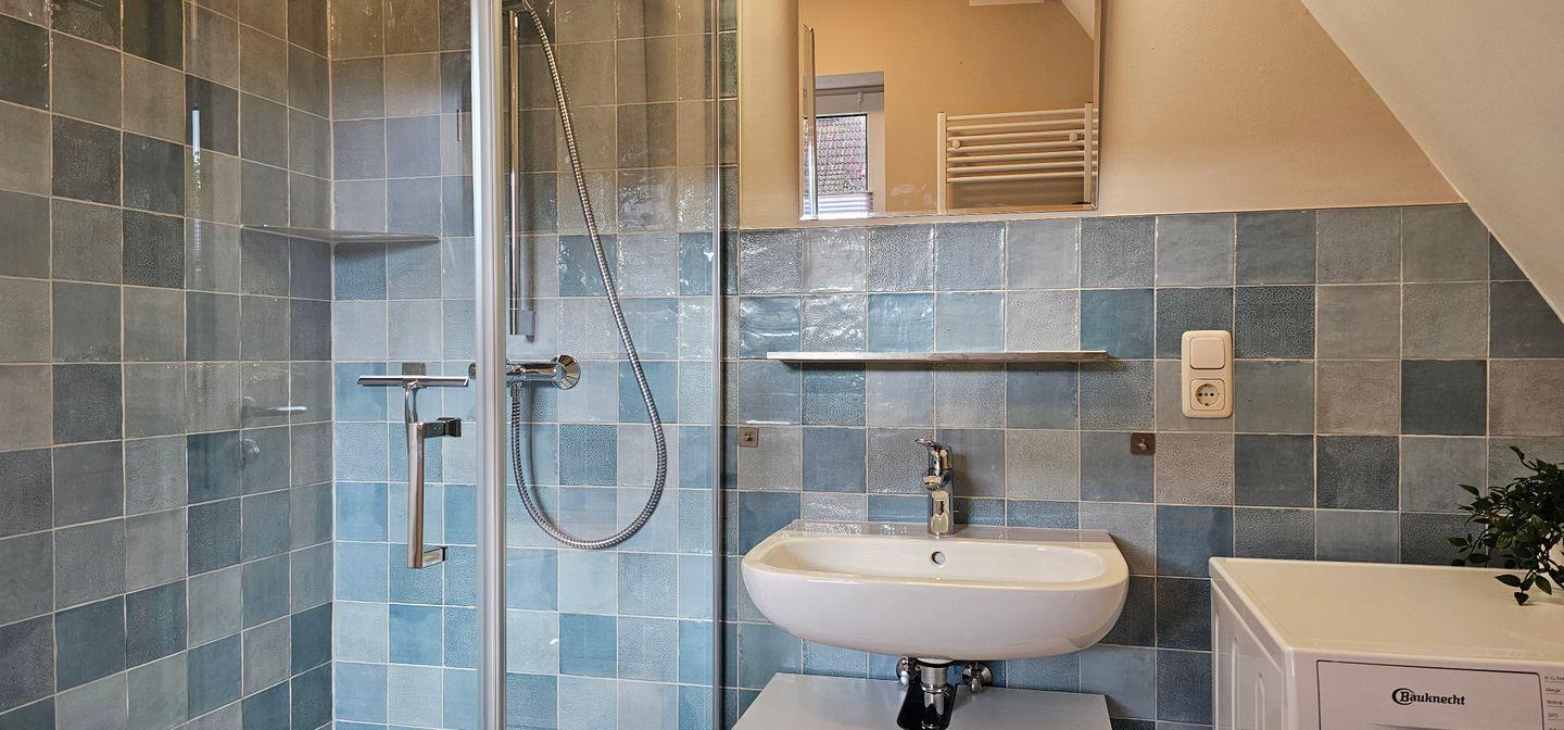 Das Tageslichtbadezimmer ist mit einer Dusche, WC, Waschtisch und genügend Ablagefläche ausgestattet. Auch ein Haartrockner und eine Waschmaschine können gerne genutzt werden.