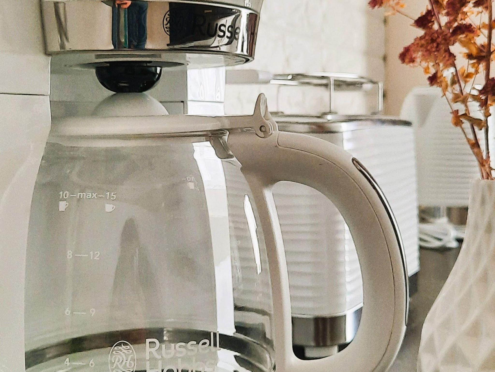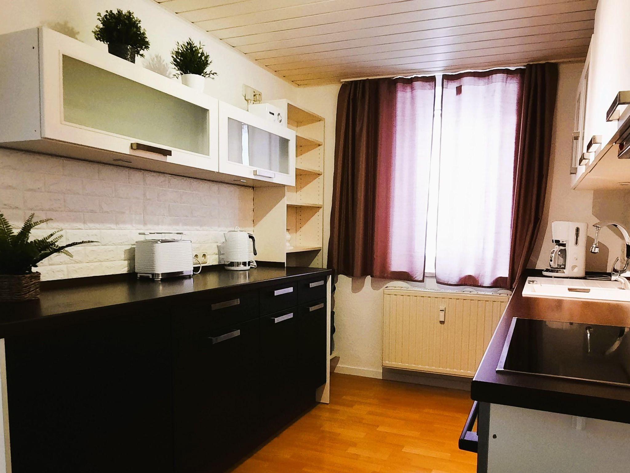 Küche mit Cerankochfeld, Radio, Backofen, Geschirrspülmaschine, Kühlschrank, Toaster, Wasserkocher, Kaffeemaschine, Geschirr und Küchenutensilien.
