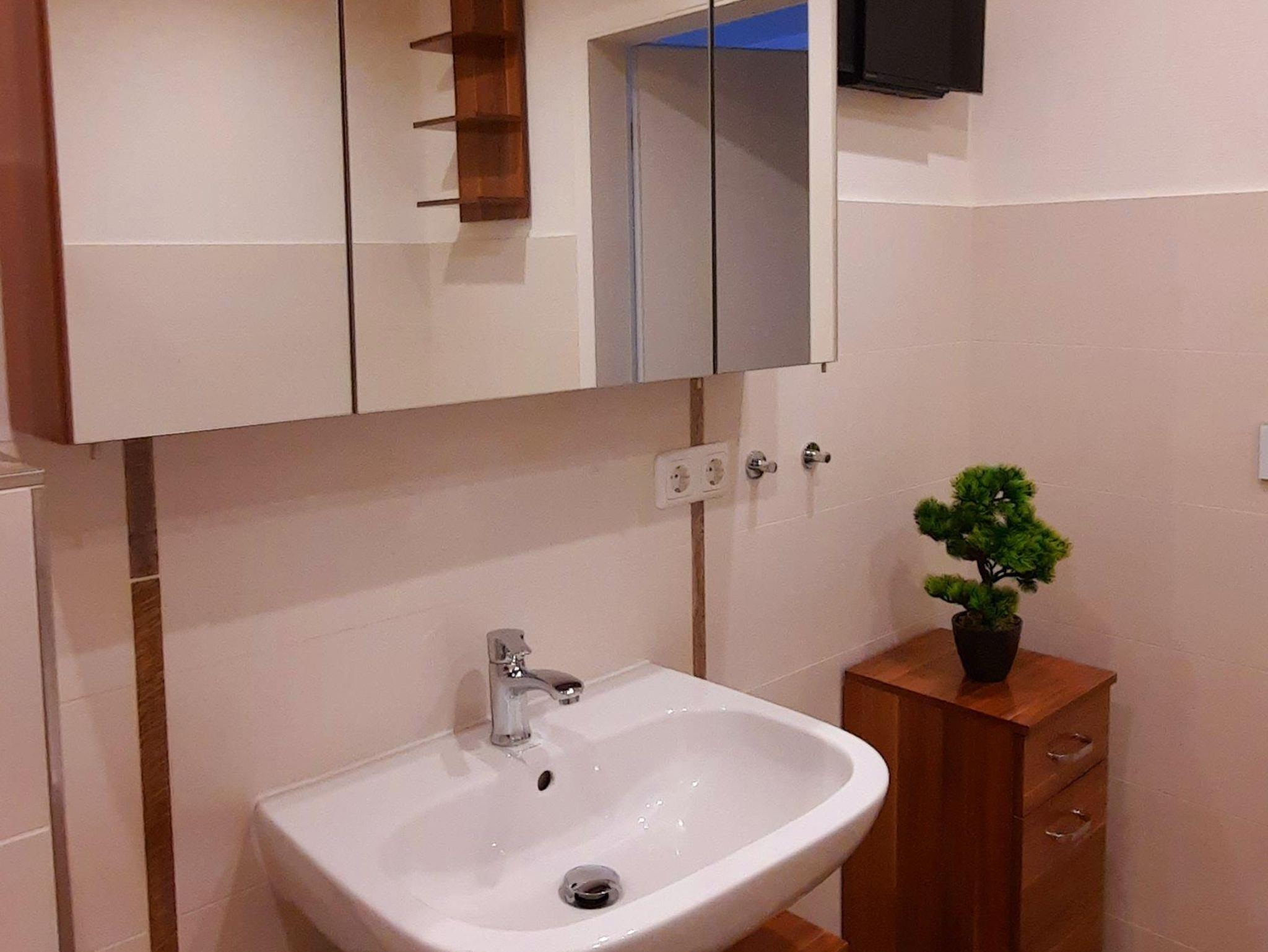 Bad mit Echtglasdusche, Badewanne, Föhn, Radio und Spiegelschrank
