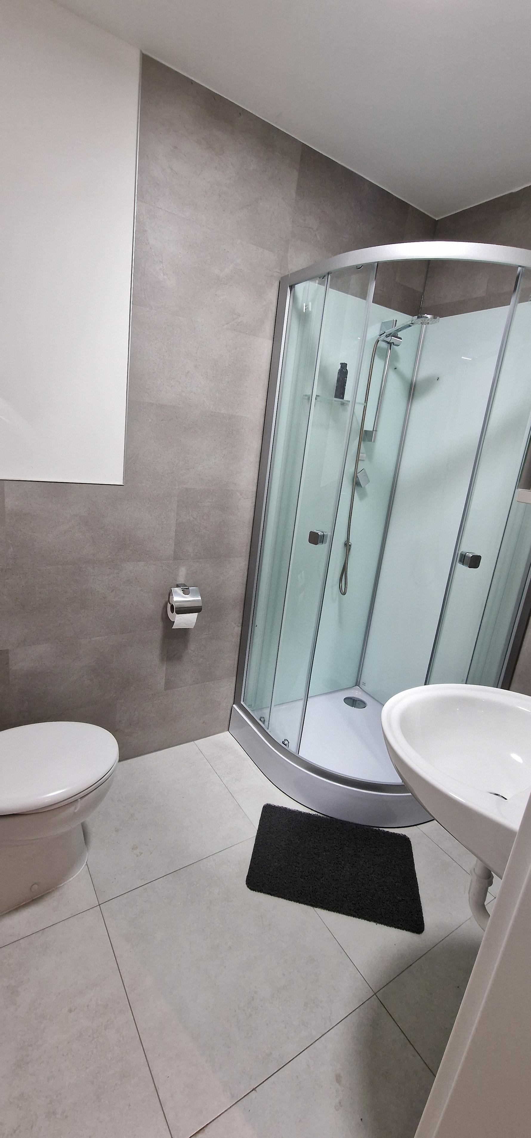 Das Badezimmer ist mit einer Dusche, einem Waschbecken und einer Toilette ausgestattet. .