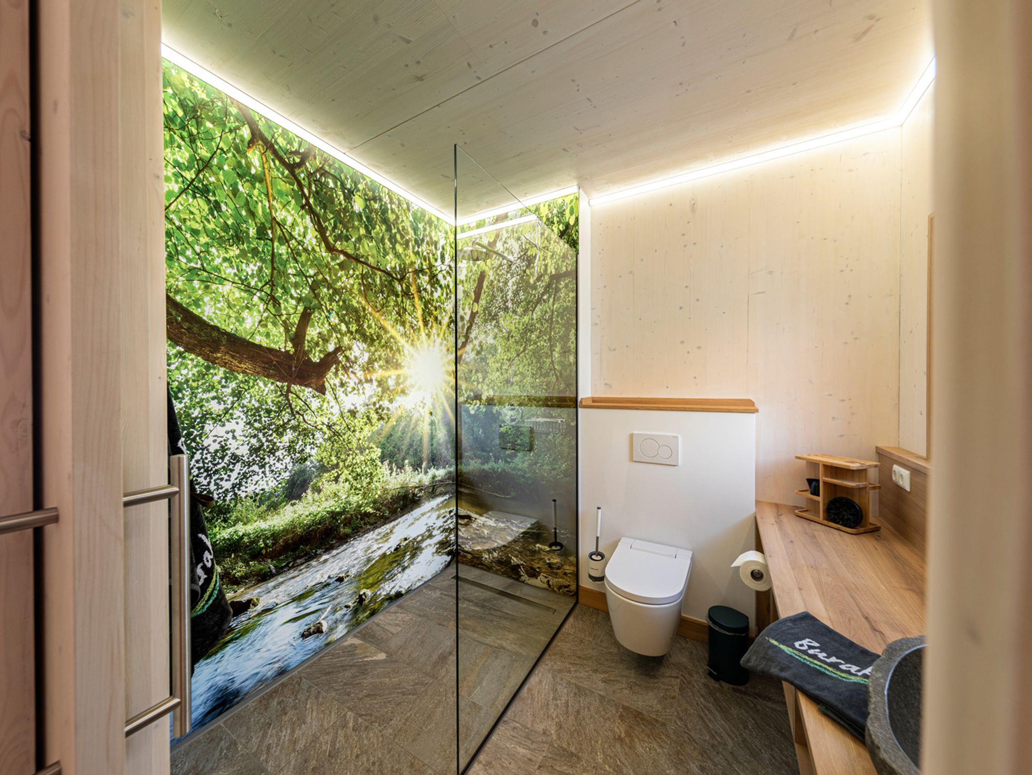 Das Badezimmer mit Tageslichtfenster ist ein Ort der Entspannung: Das ebenerdige Duscherlebnis, das exklusive Flussstein-Waschbecken und das integrierte Bidet mit Fernbedienung sorgen für ein Gefühl von Luxus mitten in der Natur. Der Smart-Spiegel dient zugleich als Bluetooth-Lautsprecher. Hochwertige Chenille-Handtücher der regionalen Textilfirma feiler sowie ein Föhn runden das Wohlfühlerlebnis ab.