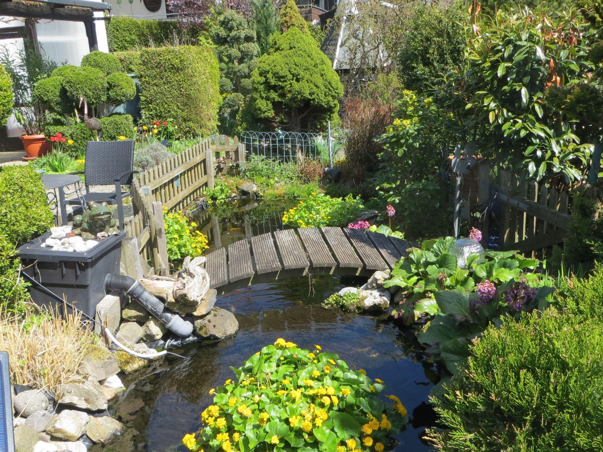 Facilities: Light-flooded living/dining room with sofa set, dining area and satellite TV, WLAN, barrier-free shower, WC, washing machine, storage room, fitted kitchen, 2 bedrooms, vine-covered pergola with large seating area and open fireplace. The view of the garden with koi pond is a dream! A seating area right by the pond invites you to linger. Towels, bed and table linen and kitchen inventory are of course provided. The kitchen is very well equipped. The bathroom with underfloor heating offers every comfort with an oversized, barrier-free shower, WC and washing machine. In the living-dining room you can spend cosy evenings with a flat-screen TV, comfortable sofa set with 3-seater, 2-seater and armchair as well as a dining set.