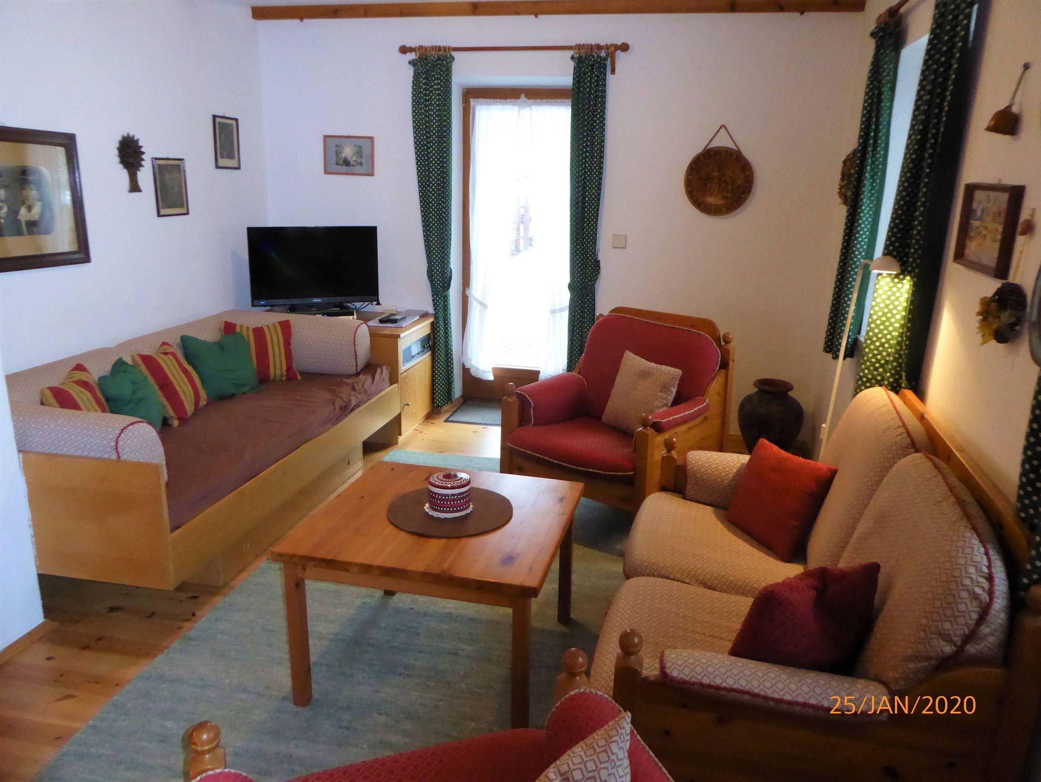 Unsere Ferienwohnung liegt ruhig und zentral im Ortskern. Sie wohnen im Erdgeschoss mit eigenem Eingang und einer Sonnenterrasse. Es steht Ihnen auch ein überdachter Autoabstellplatz zur Verfügung. Die im Landhausstil eingerichtete Wohnküche bietet Ihnen jeglichen Komfort. Die Küchenzeile ist mit Spülmaschine, Herd (Ceranfeld), Mikrowelle und Backofen mit Grillfunktion ausgestattet. Durch den angeschlossenen Wohnbereich mit Satellitenfernsehen gelangen Sie auf die südlich gelegene Sonnenterrasse. Es stehen Ihnen Gartenmöbel, Liegestühle, Sonnenschirm, sowie ein Grill zur Verfügung. Die hauseigene Quelle sorgt für Erfrischung an heißen Sommertagen.