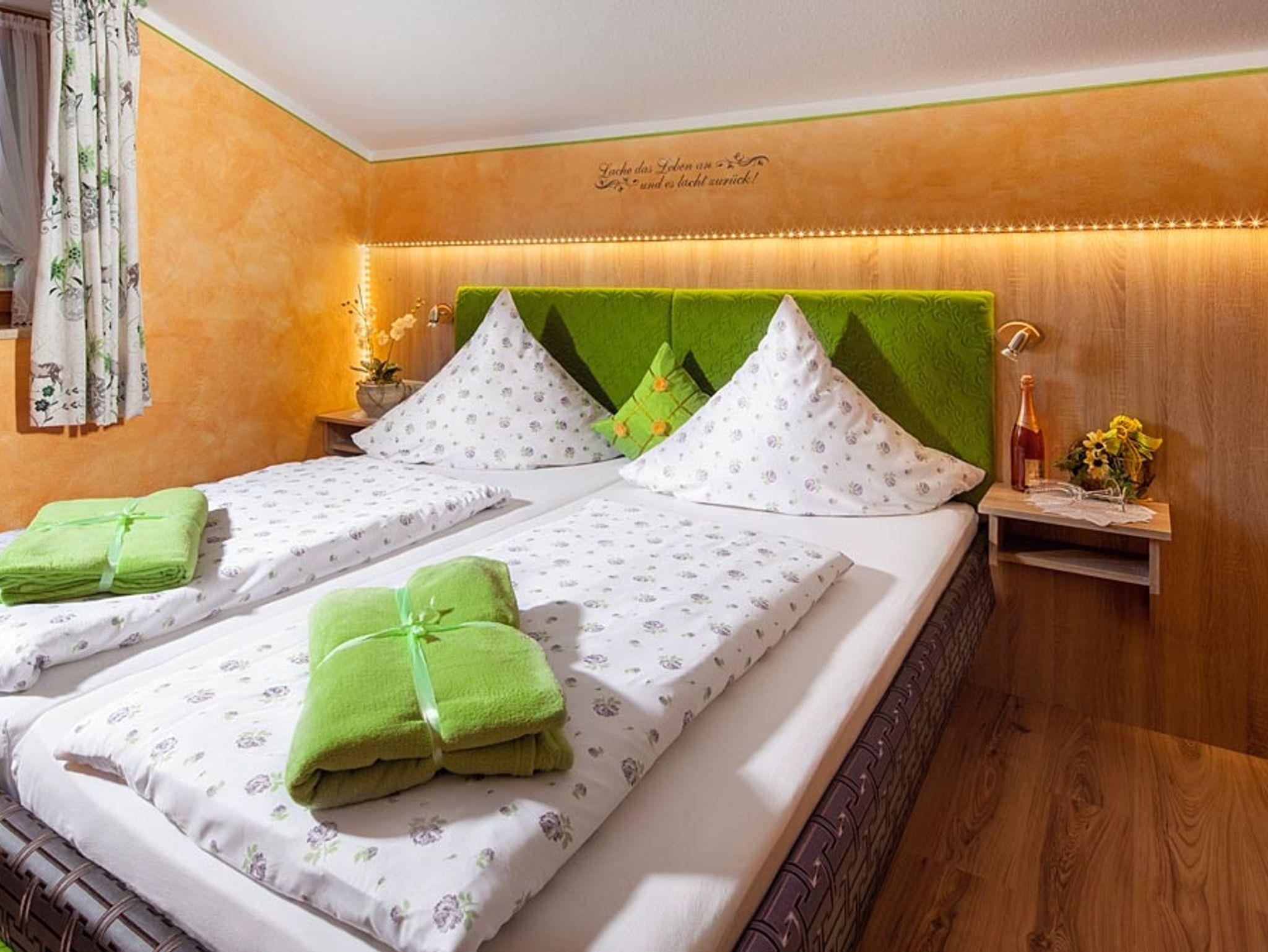 Im Nebengebäude steht Ihnen unsere mit vier Sternen ausgezeichnete Ferienwohnung für 2 Personen zur Verfügung (3 + 4 Person auf Anfrage möglich). Dort finden Sie ein ein Wohnzimmer mit Balkon und TV, ein Schlafzimmer, einen Vorraum mit Küchenzeile und Esstisch und ein Bad mit Dusche. Das Wohnzimmersofa kann problemlos zusätzlich in ein bequemes Doppelbett verwandelt werden. Die Küche ist komplett eingerichtet. Die Wohnung ist auch für Familien mit Kindern sehr gut geeignet. Selbstverständlich gehört die Gartenbenutzung dazu, sowie eine herrliche Aussicht auf unsere Berge.