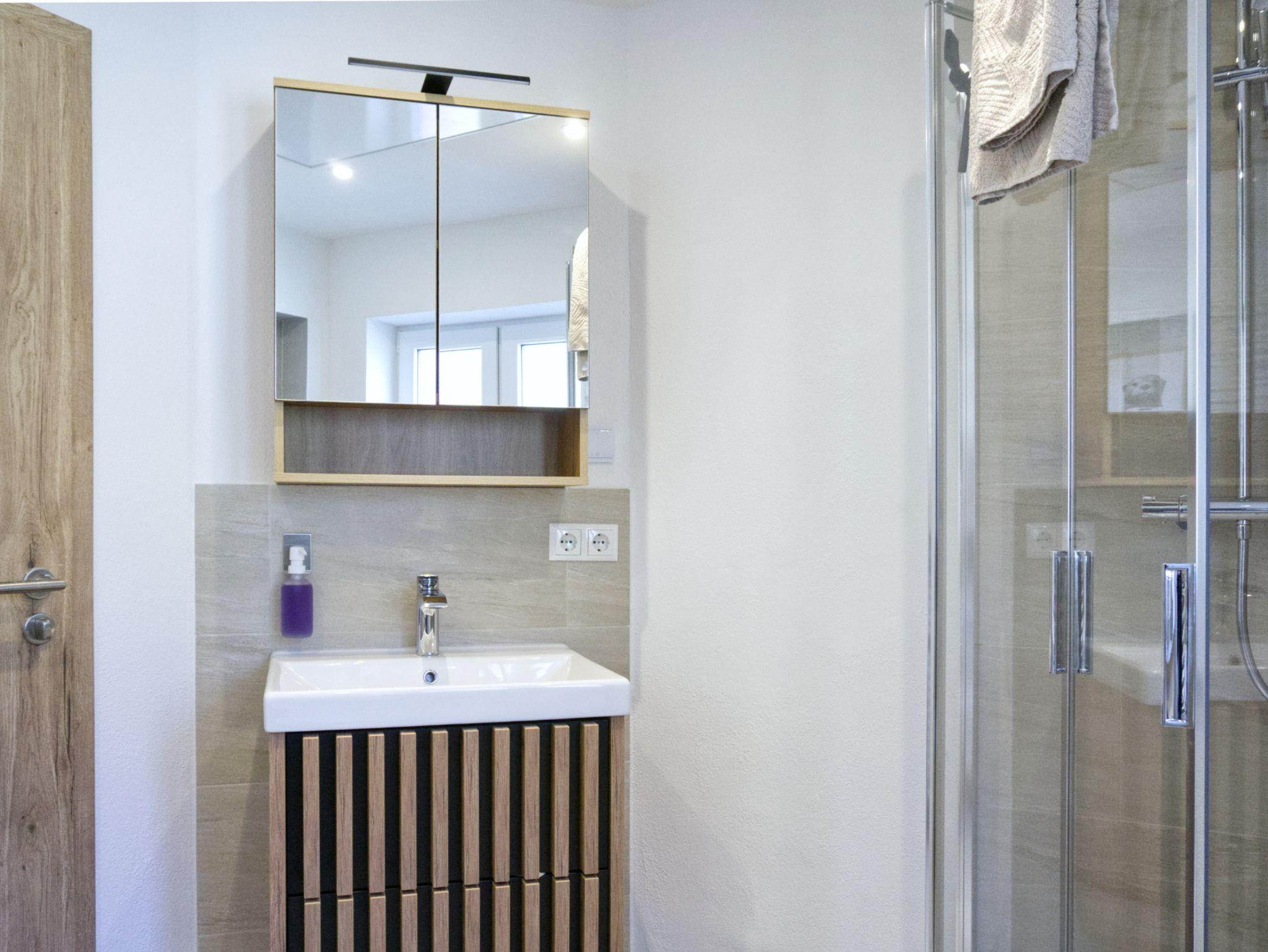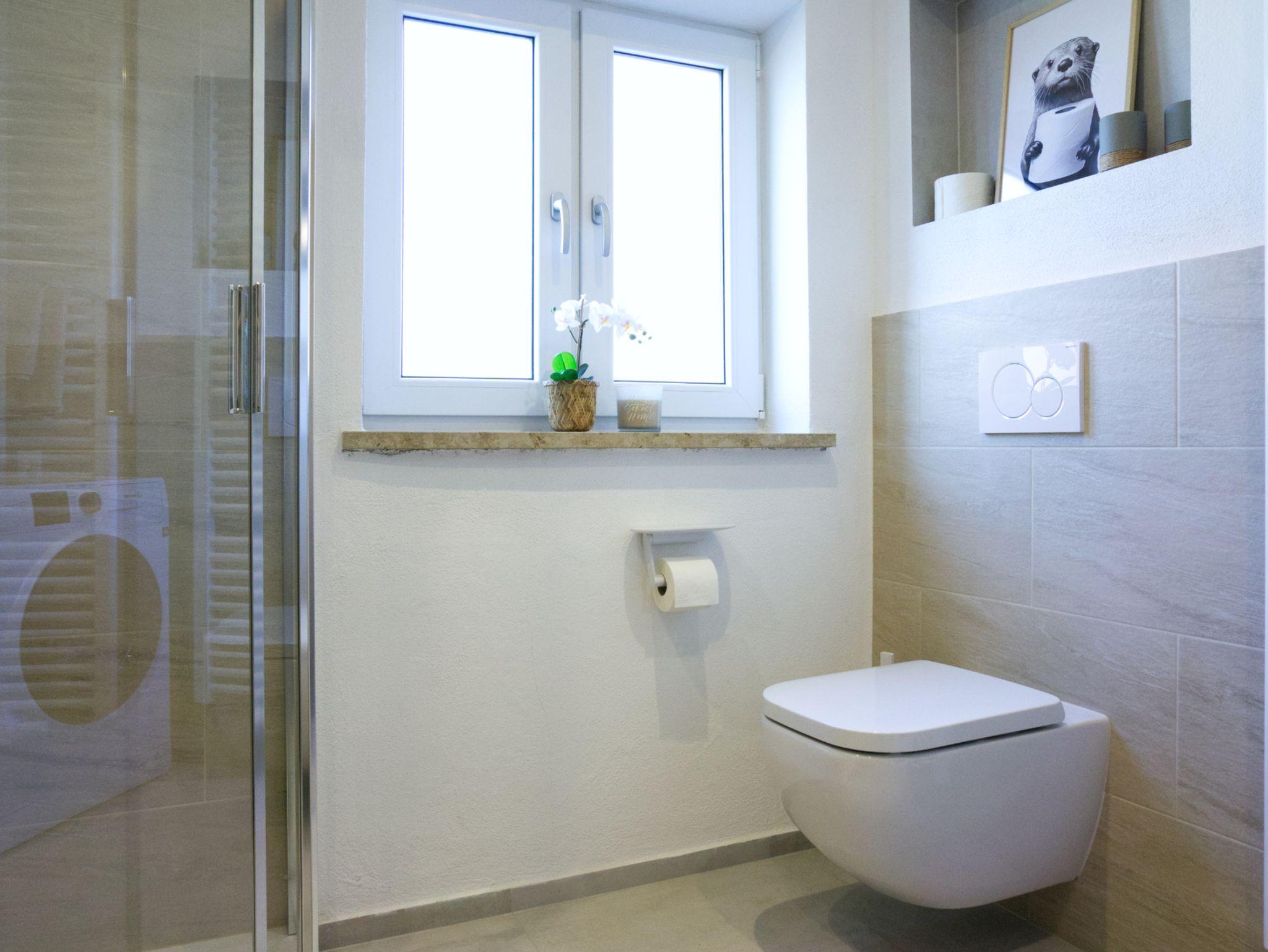 Das Badezimmer bietet jeglichen Komfort wie Tageslicht, Regendusche, Föhn, ausreichend Handtücher, sowie eine Waschmaschine mit integriertem Trockner.